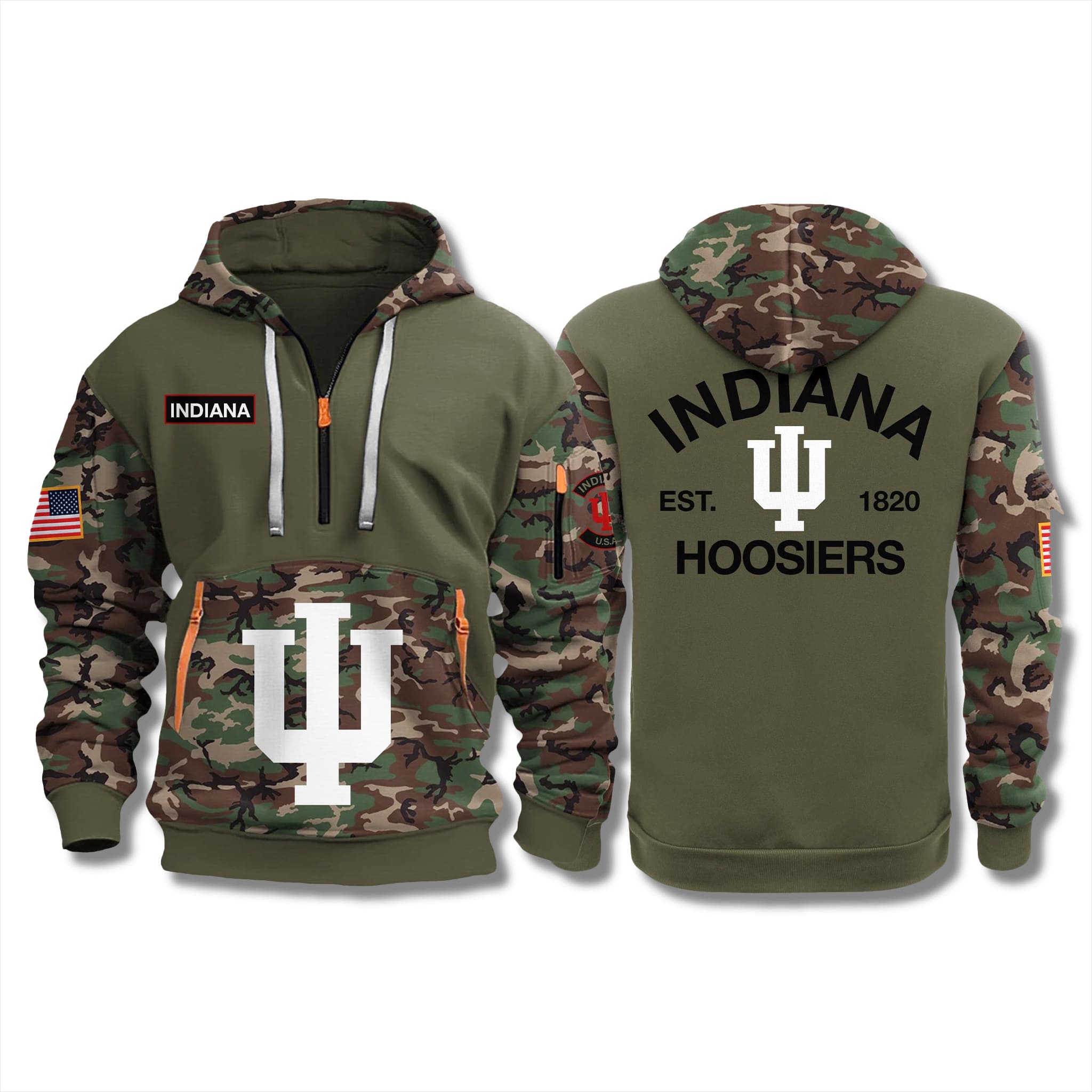 Indiana Hoosiers Military Camo Quarter Zip Hoodie 2025 – Athletic Strength Meets American Military Spirit