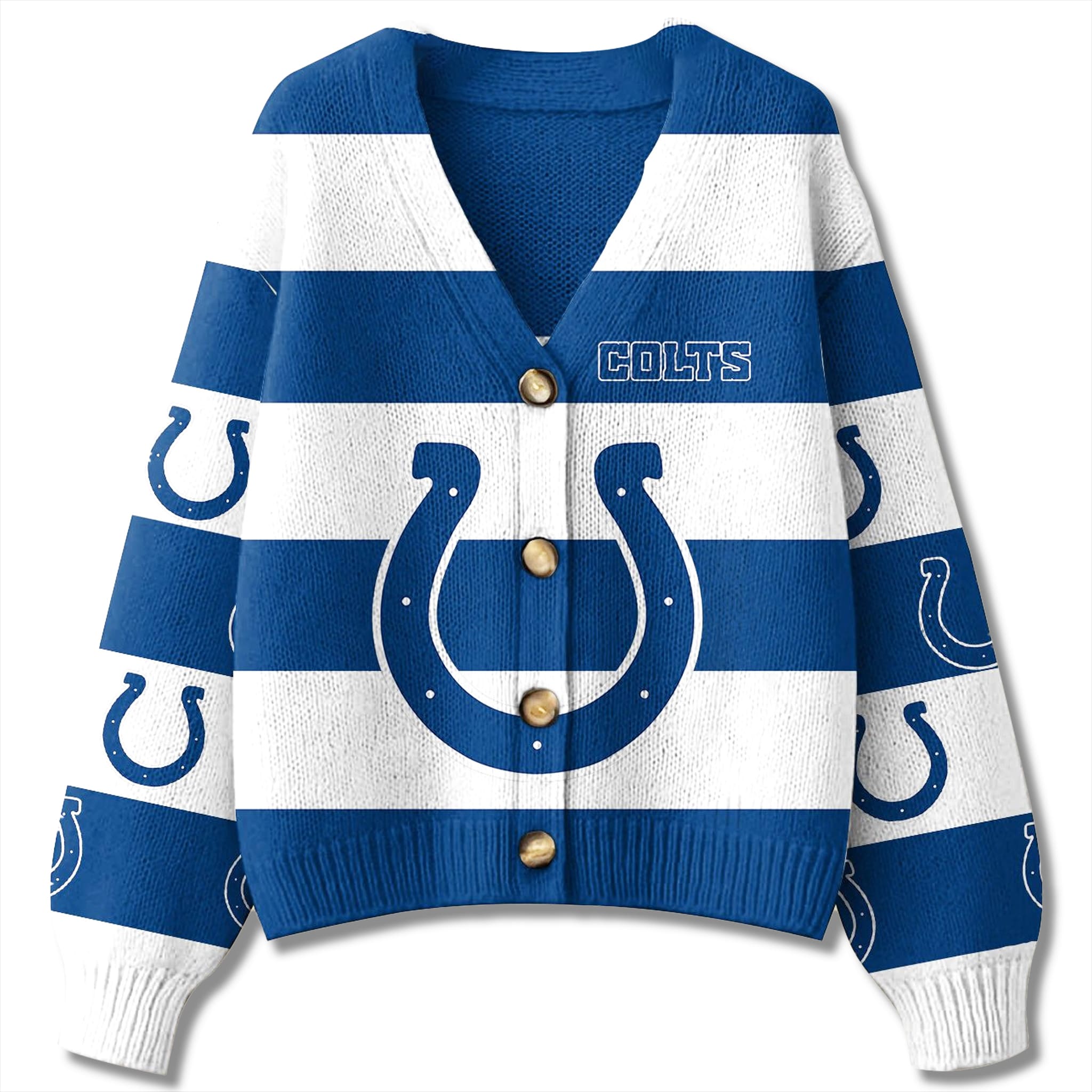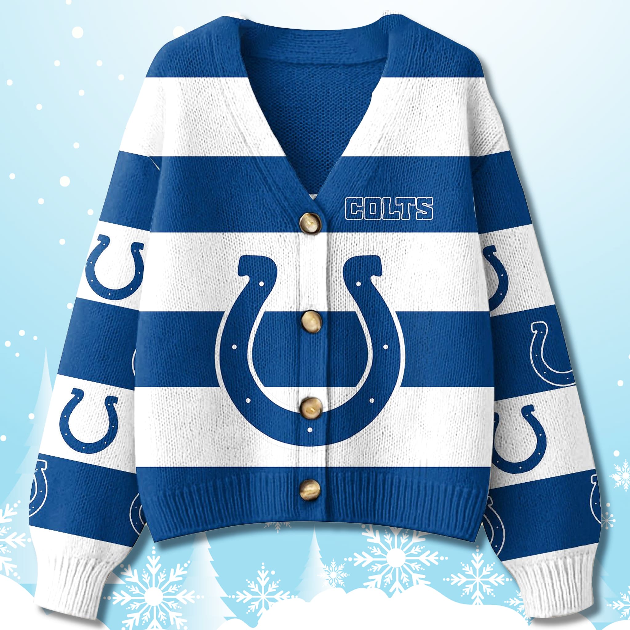 This sophisticated Colts Christmas Cardigan Sweater embraces a classic varsity aesthetic with broad, bold horizontal stripes in the team’s signature Royal Blue and White. The design is anchored by a massive, central Colts Horseshoe logo, accompanied by the team name embroidered on the chest and smaller logos running down the sleeves for visibility from every angle. With its button-down front and comfortable ribbed trim, it offers a timeless, collegiate look that is both sporty and festive.
