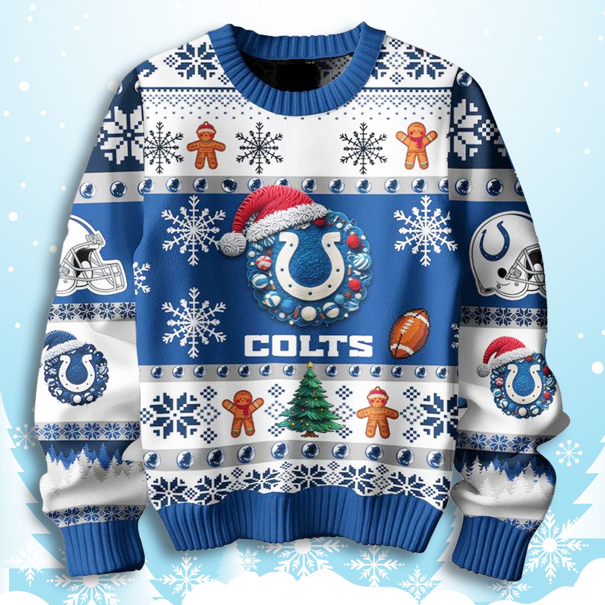 This eye-catching Colts 2025 Christmas Sweater perfectly blends the excitement of game day with classic holiday cheer. The overall aesthetic is a fun, highly detailed ugly sweater pattern executed in the iconic Colts colors: bright blue, horseshoe white, and a touch of holiday red and green. The centerpiece is the legendary Colts Horseshoe logo, often sporting a festive Santa hat.