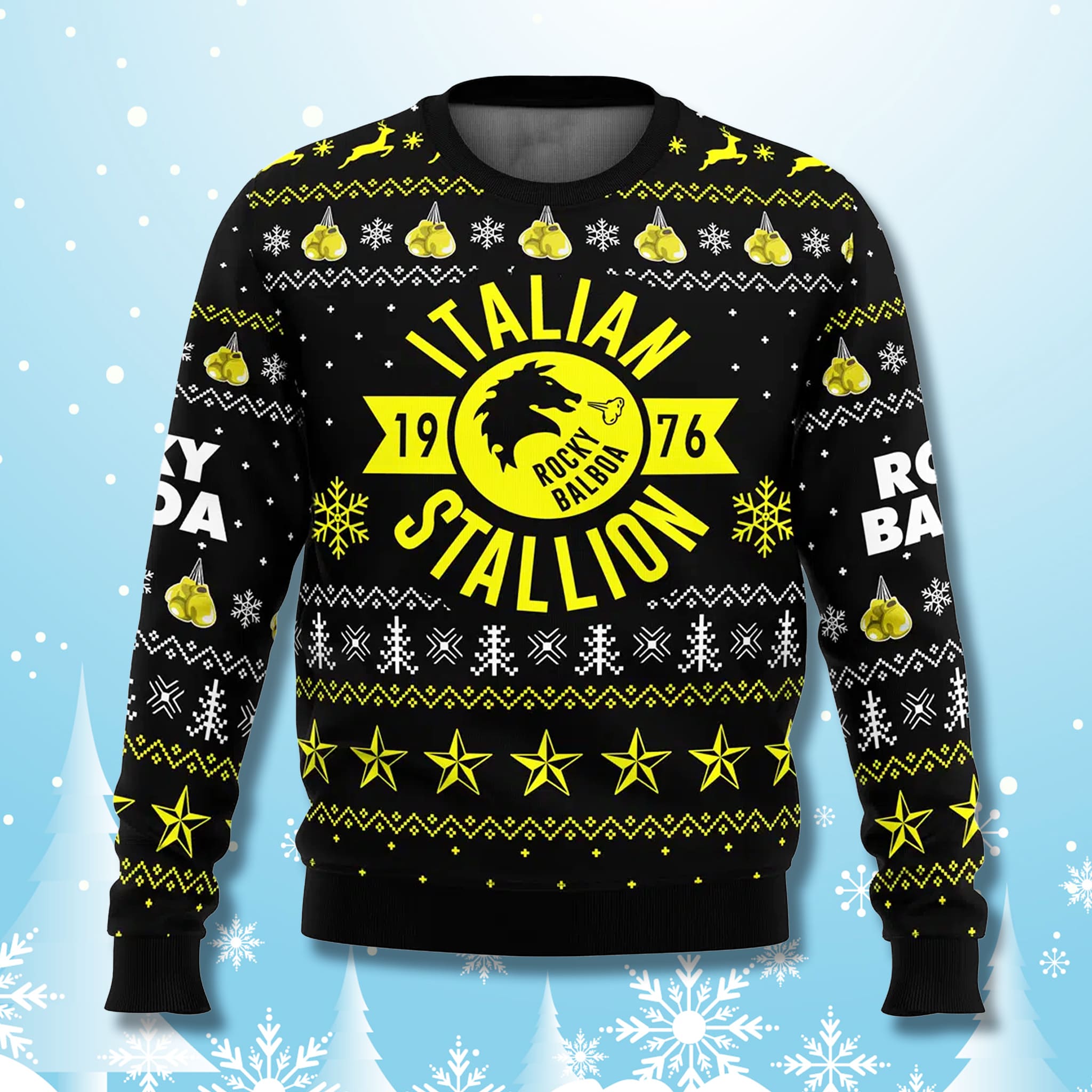 Channel the heart, determination, and legendary spirit of the Italian Stallion this holiday season with the Italian Stallion Balboa Rocky Ugly Christmas Sweater. This garment is a bold, retro-inspired tribute to the beloved boxing champion, Rocky Balboa, and his famous, enduring nickname. More than just a quirky sweater, it’s a celebration of the underdog story, perseverance, and the classic 1976 film that started it all. This is the definitive Rocky Christmas merchandise to show you’re a fighter, not a lover, of boring apparel.