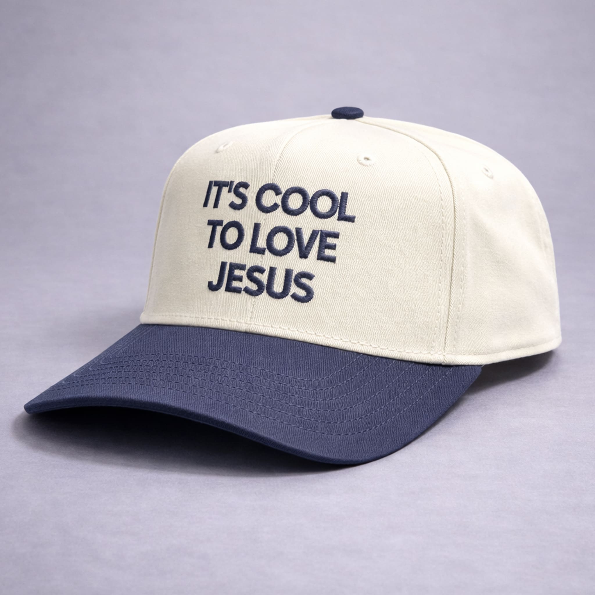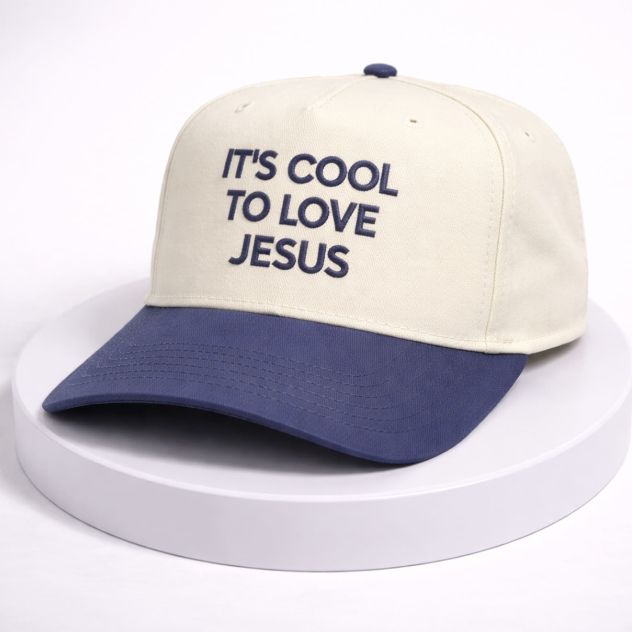 The hat features a minimalist aesthetic with an elegant color combination of a cream crown and a navy blue brim. The highlight is the sharp 3D embroidered lettering in a modern typographic style, creating a fashion-forward faith-based accessory that is both refined and rich in streetwear appeal.