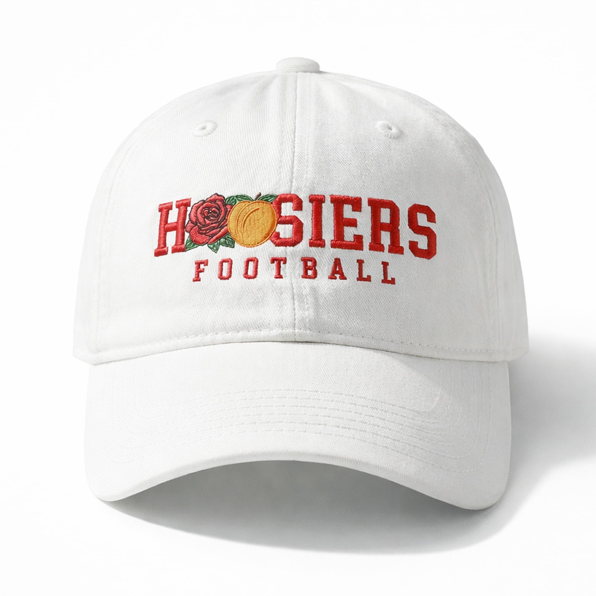 This hat features a clean white base with a red brim, embroidered with raised “HOOSIERS” lettering alongside a red rose and a bright yellow peach inspired by nature. The classic dad hat style offers a comfortable fit with a refined vintage vibe, ideal for fans who want to honor IU’s unforgettable season.