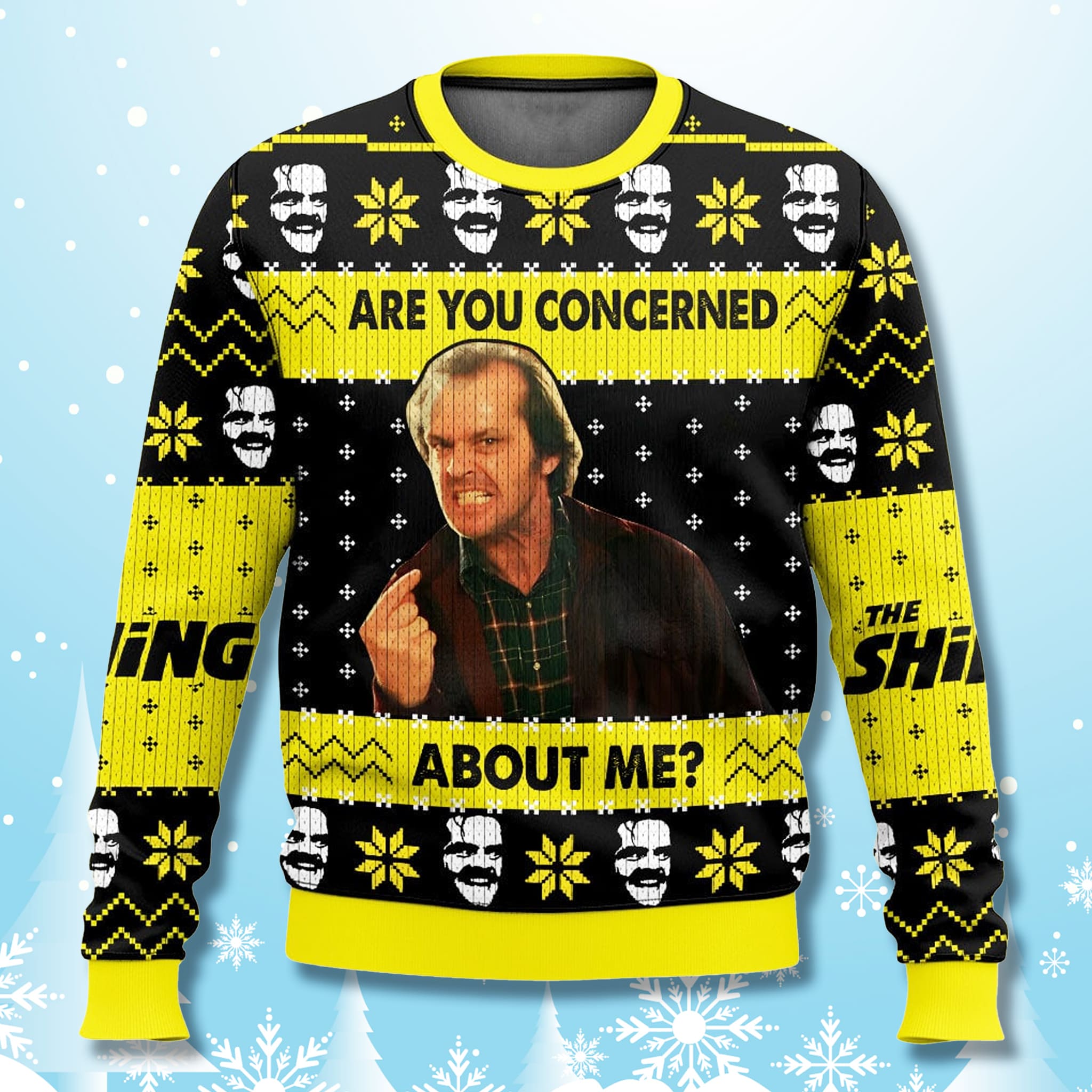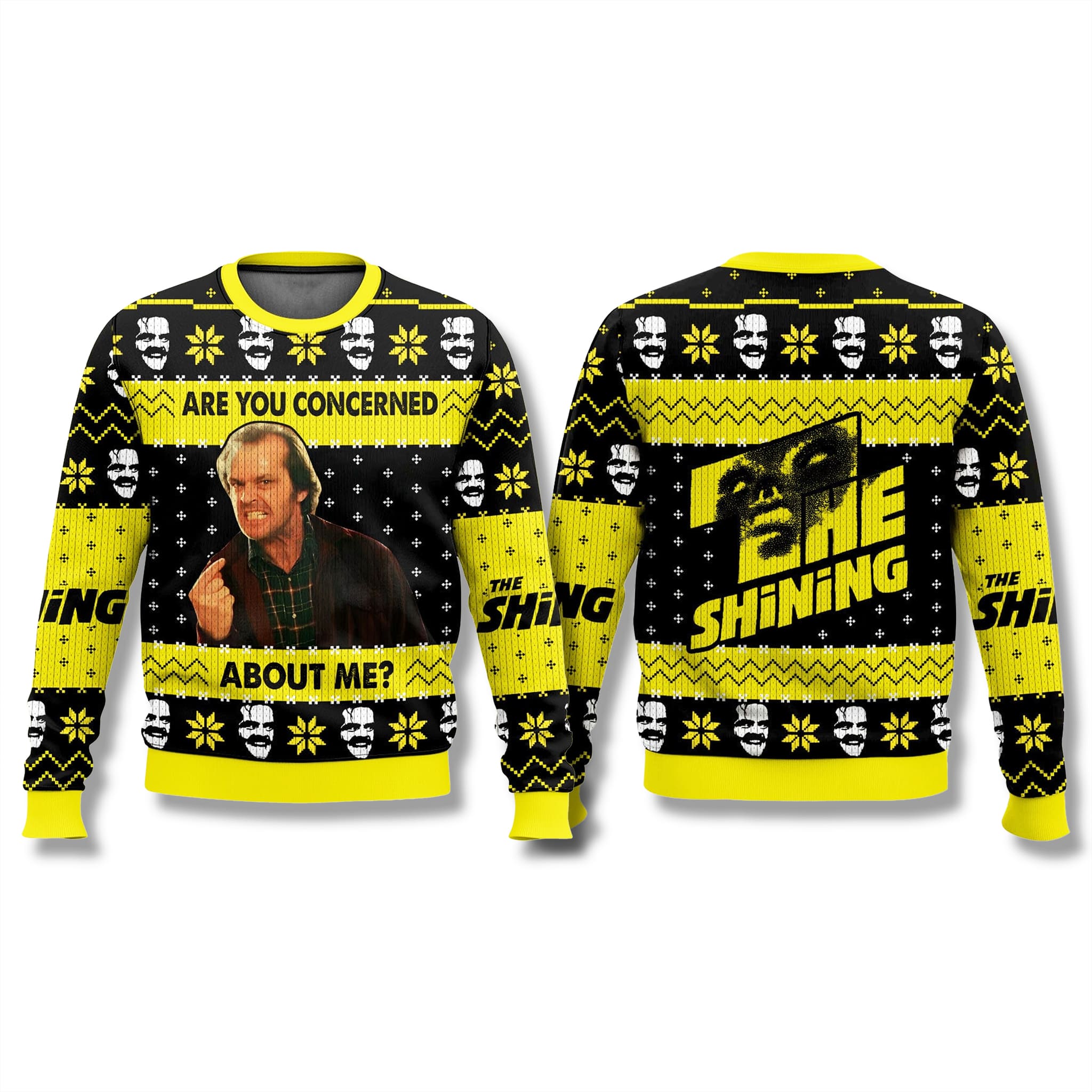 This striking The Shining Christmas sweater uses a bold black and yellow color palette. The centerpiece is the unforgettable image of Jack Nicholson as Jack Torrance, paired with the sarcastic and chilling movie quote: “Are You Concerned About Me?” The rest of the sweater is adorned with repeating graphic elements of Jack’s menacing silhouette and the iconic twin-bladed axe, interwoven with traditional.