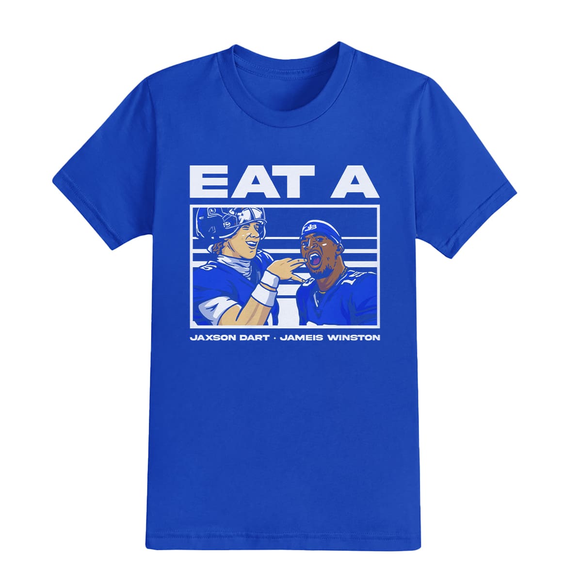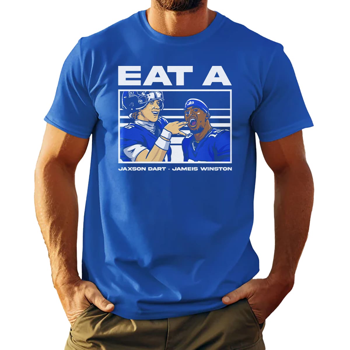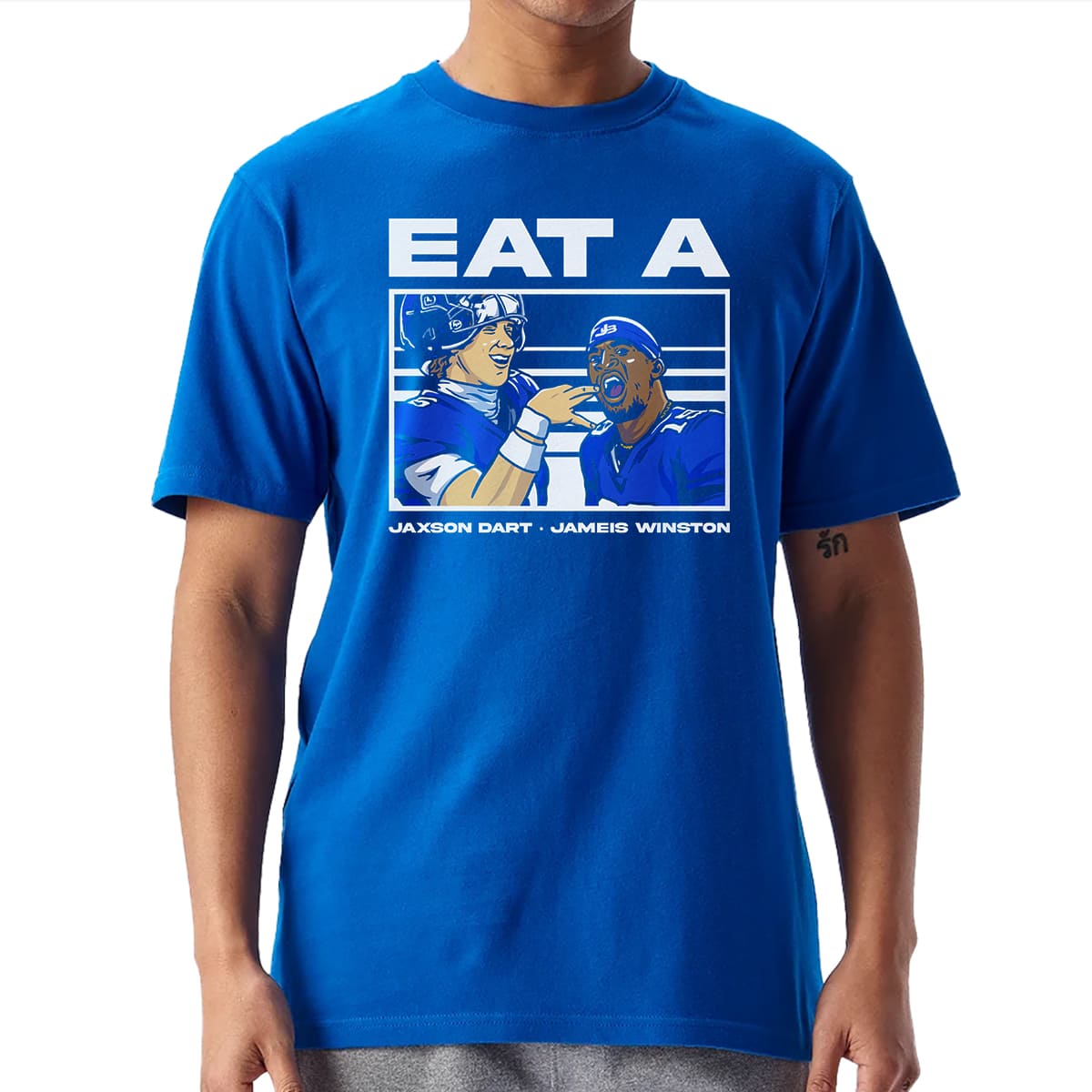 Feast on the fun of New York Giants fandom with the Jameis Winston Jaxson Dart Eat A W Shirt, a cheeky tribute to the viral “Eat a W” meme that lit up social media during the team’s dominant preseason win over the Patriots. In a moment of pure sideline joy, rookie QB Jaxson Dart playfully “fed” veteran backup Jameis Winston a celebratory “W” (win). This design captures the duo’s infectious energy – Dart’s fresh-faced grin and Winston’s wide-eyed delight—turning a touchdown toast into an instant classic for Big Blue believers.