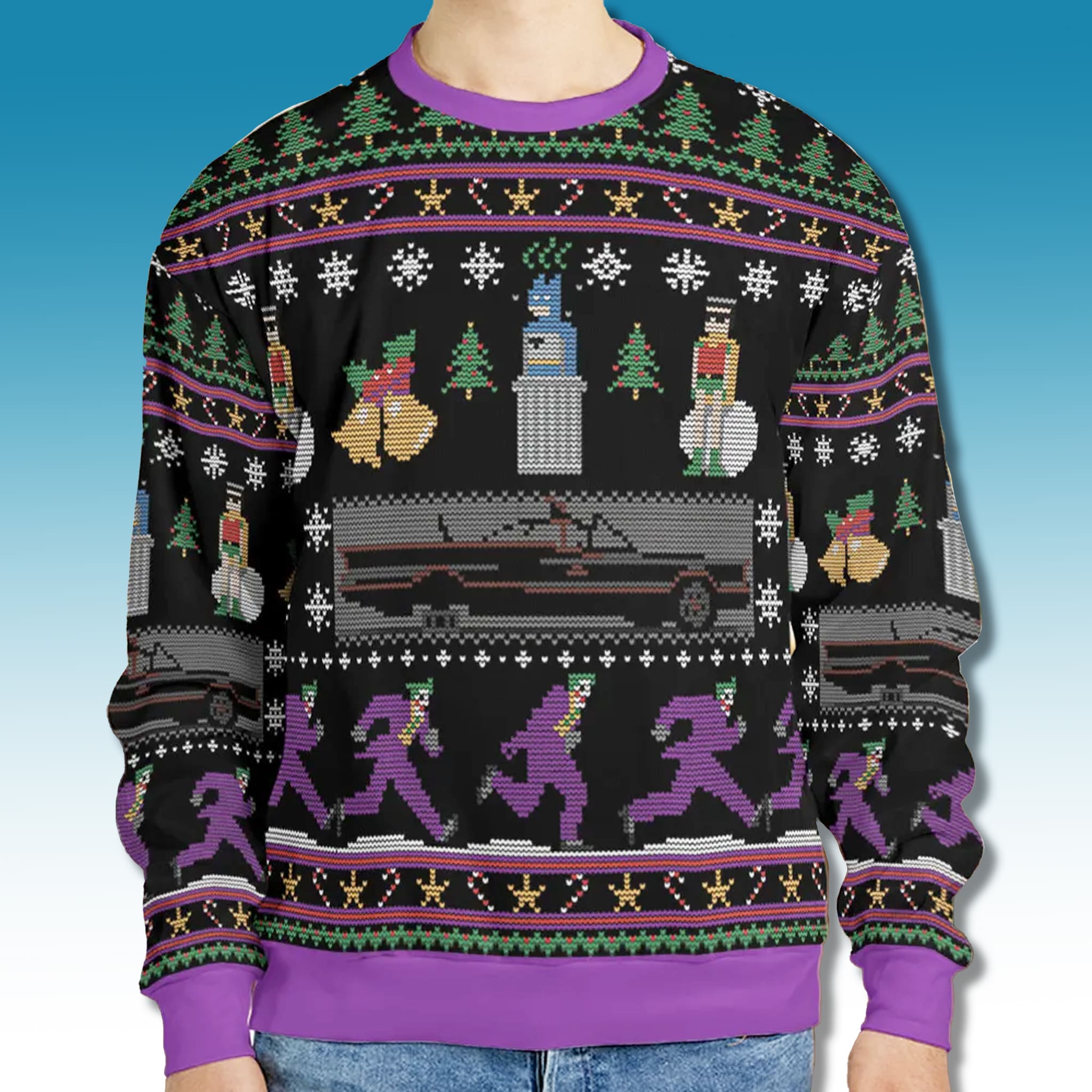 The design features Joker’s signature bold purple tones on a deep black background, paired with classic Christmas motifs like pine trees, golden bells, and falling snow. Retro comic-book styling highlights the Joker escaping while the Batmobile loses a wheel—creating a playful, mischievous centerpiece perfect for any holiday sweater party.