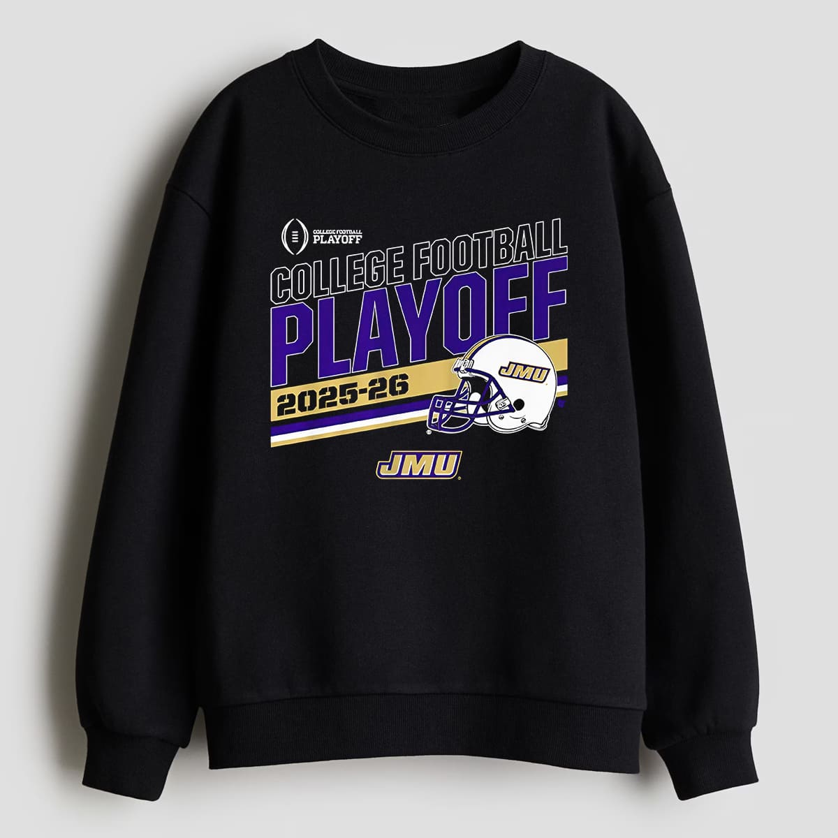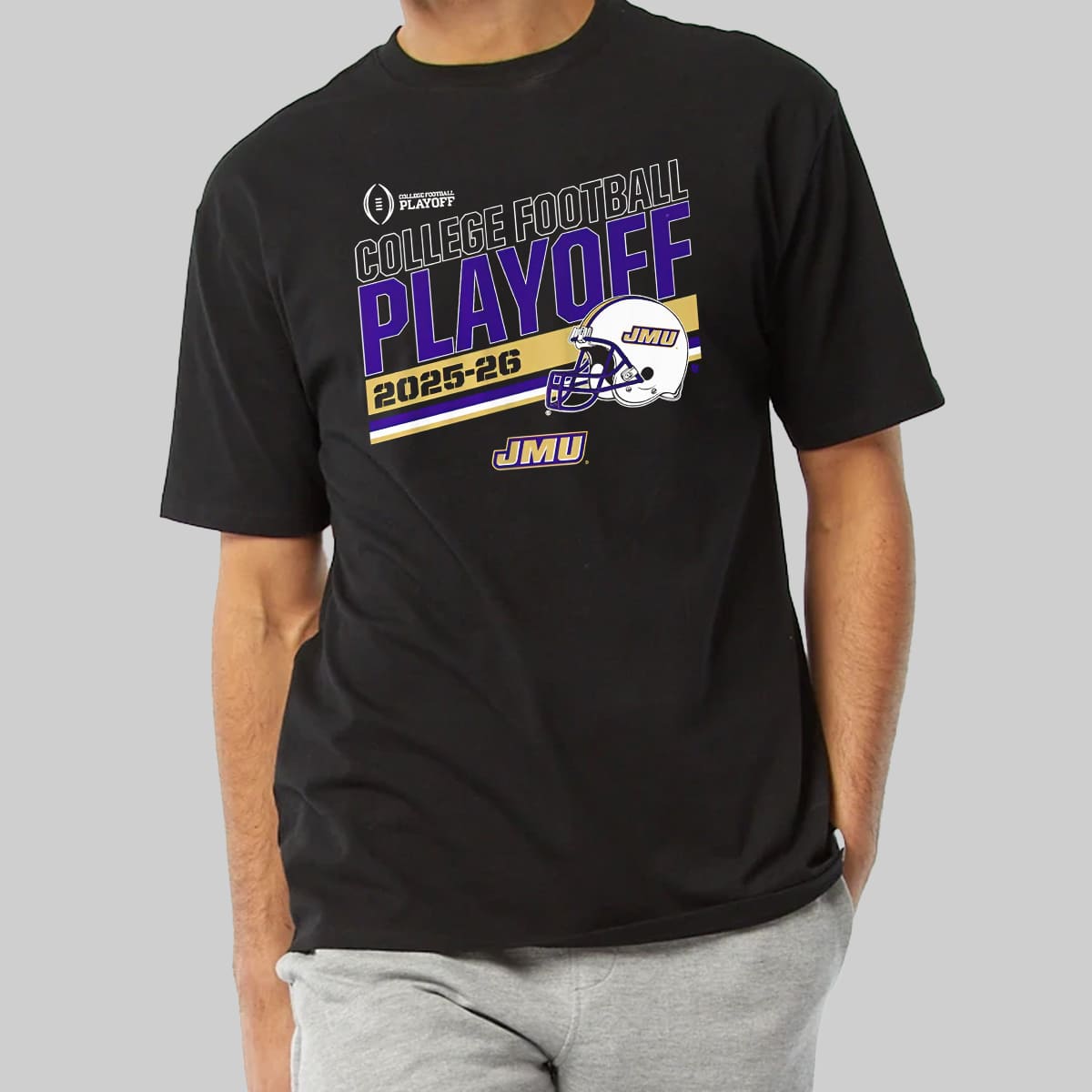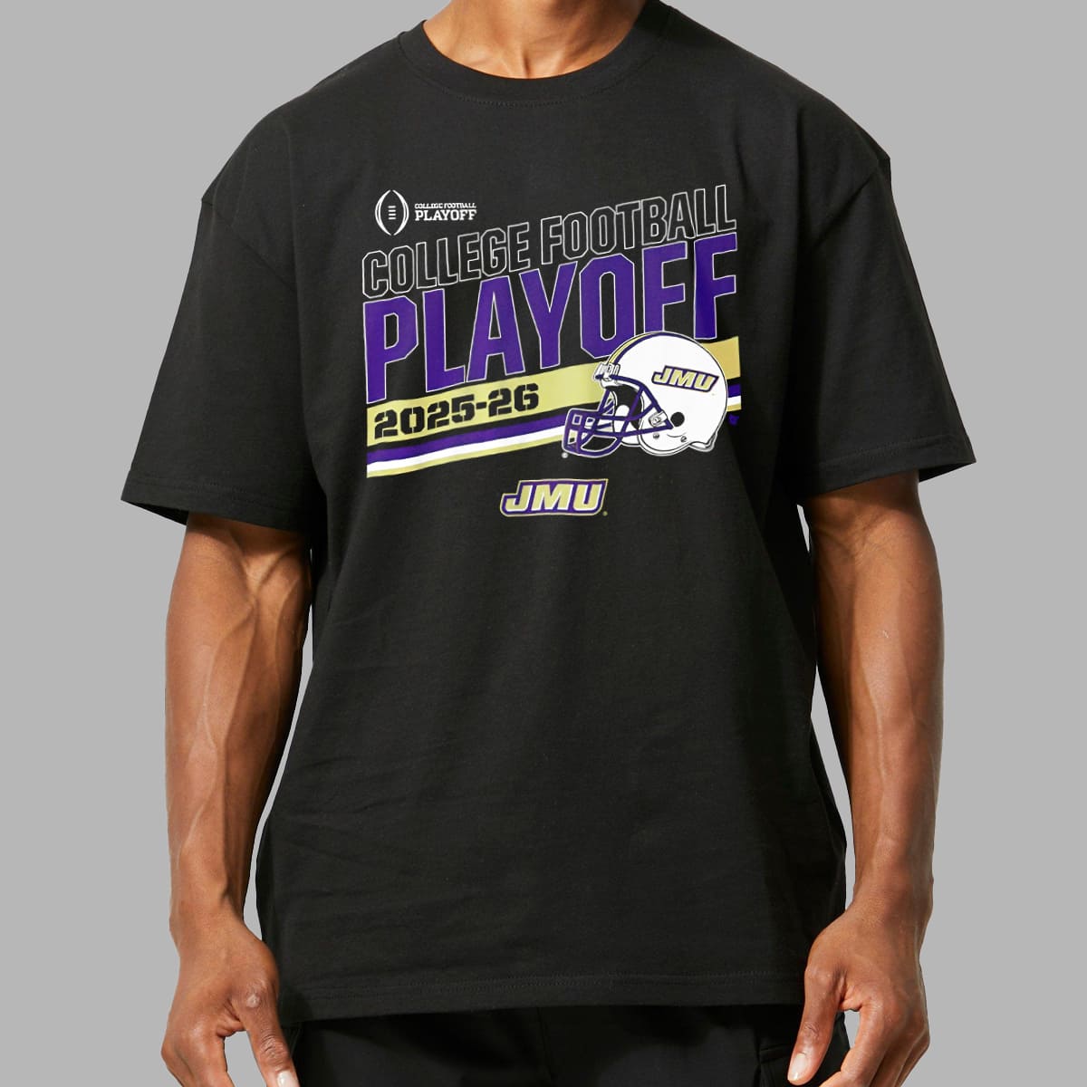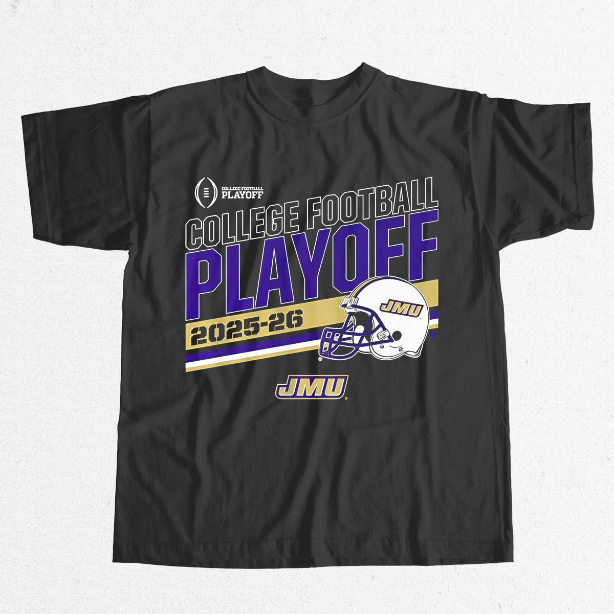 The JMU CFP 2025 Shirt features a modern graphic design on a sleek black background, with the “COLLEGE FOOTBALL PLAYOFF 2025-26” text in a bold purple–gold gradient, a glossy white JMU helmet tilted with pride, and signature purple–gold stripe accents, creating a vibe that is both powerful and classy – perfect for wearing to the stadium, tailgates, or cheering from Harrisonburg.