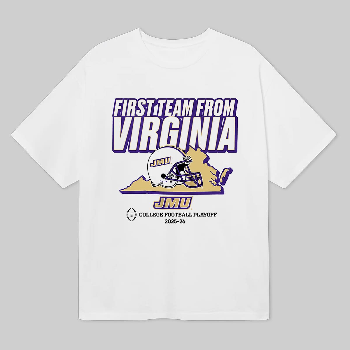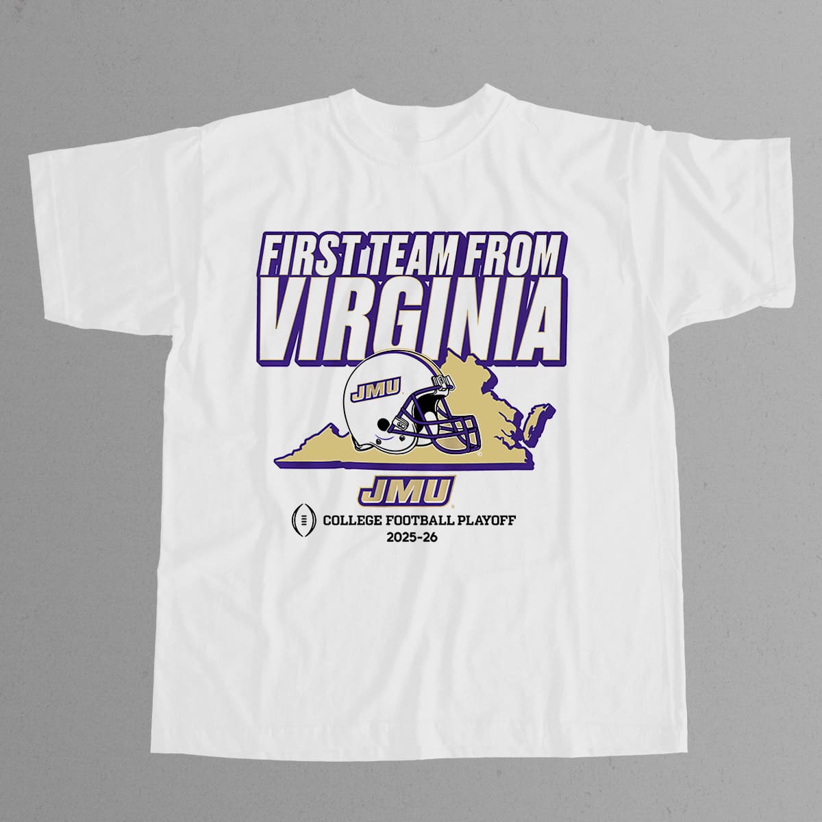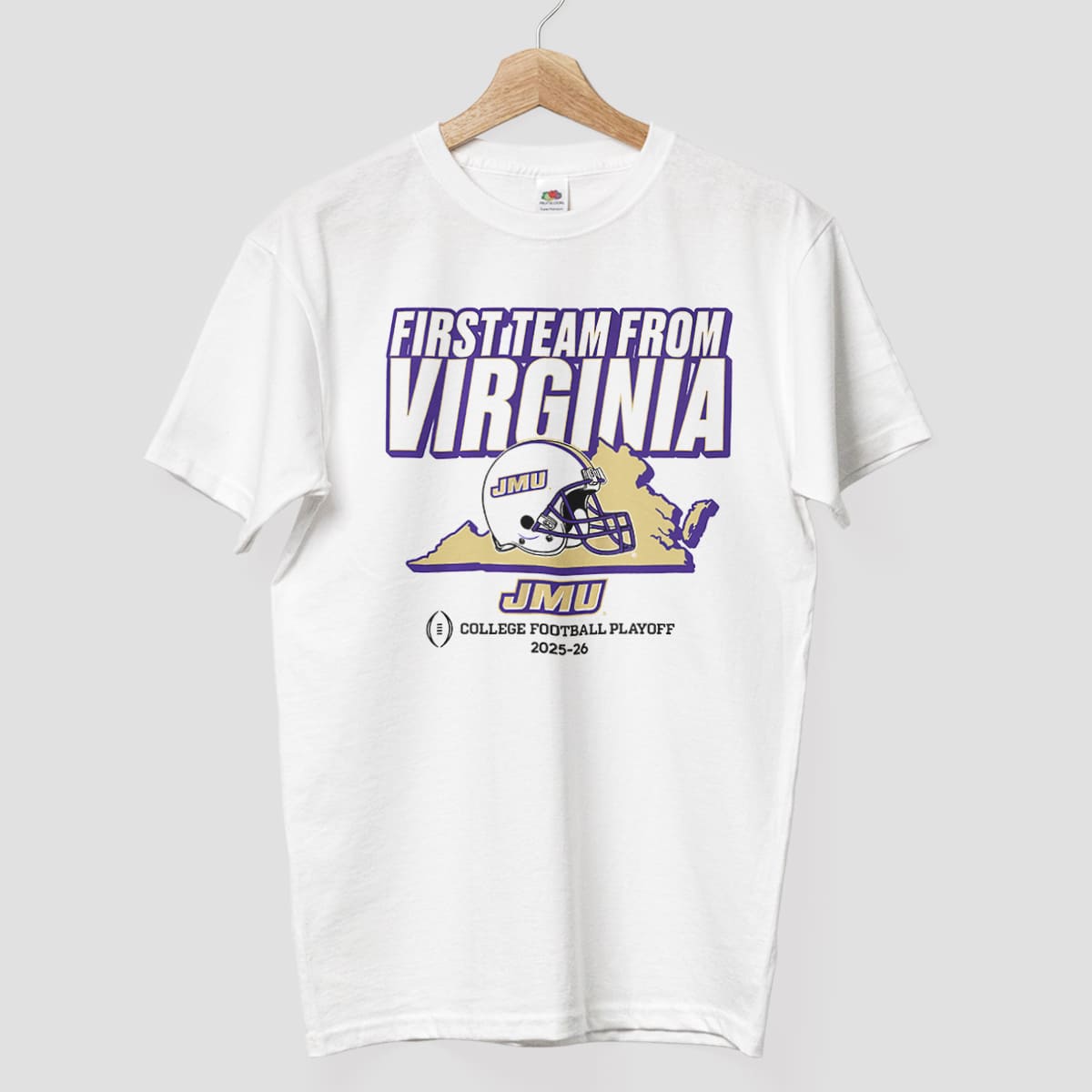 Wear the pride and honor of a true Dukes supporter! The JMU Football First Team From Virginia 2025 CFP Shirt is a commemorative item dedicated to the historic moment when James Madison University officially became the first football team from the state of Virginia to qualify for the College Football Playoff (CFP) in the 2025–26 season.