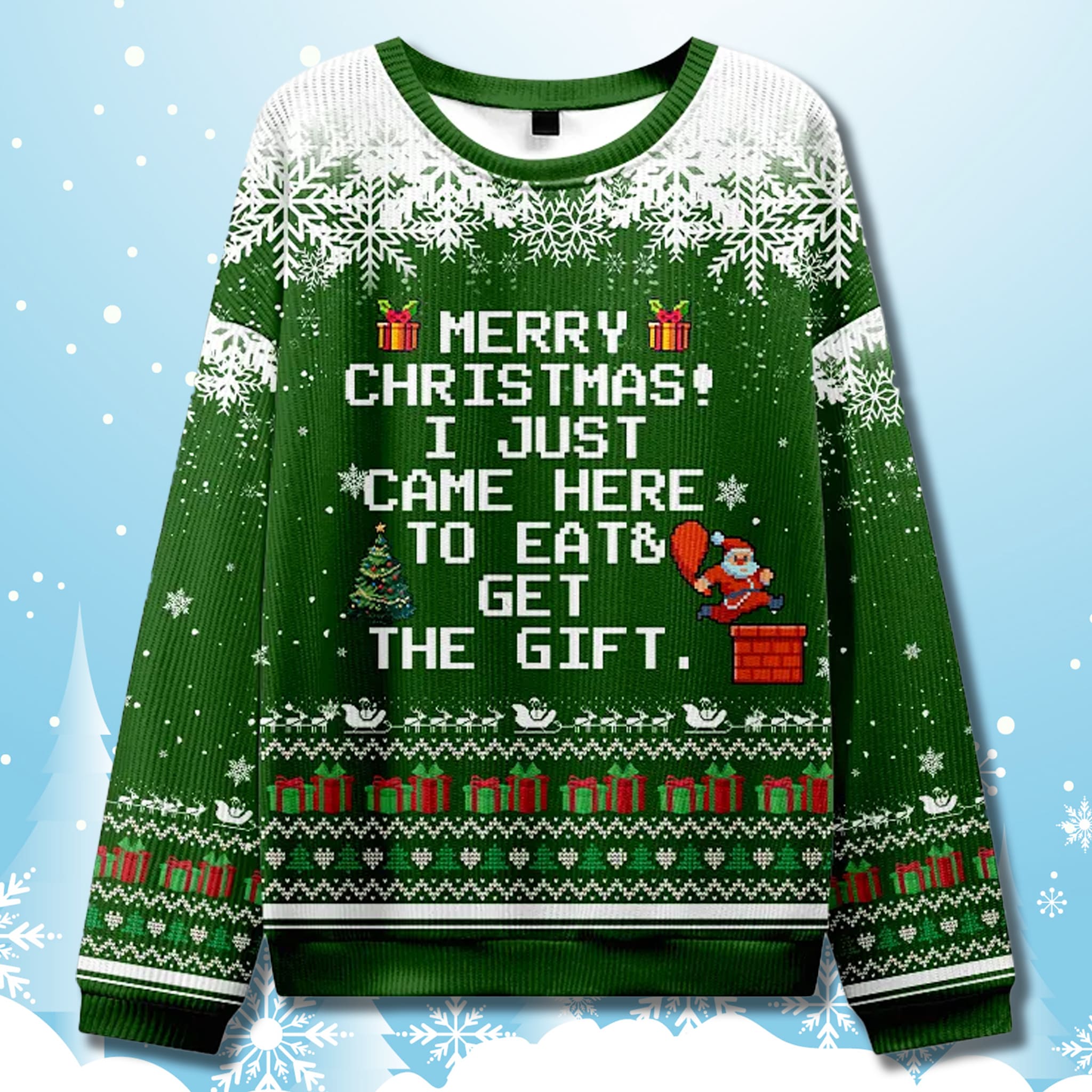 The Just Came To Eat & Get Gift Funny Christmas Sweater features a vibrant, traditional Christmas green color with striking white text that immediately draws the eye. The design simulates a chunky knit pattern and includes playful pixelated graphics of a tiny Christmas tree, presents, and a comical Santa Claus stuck in a chimney.