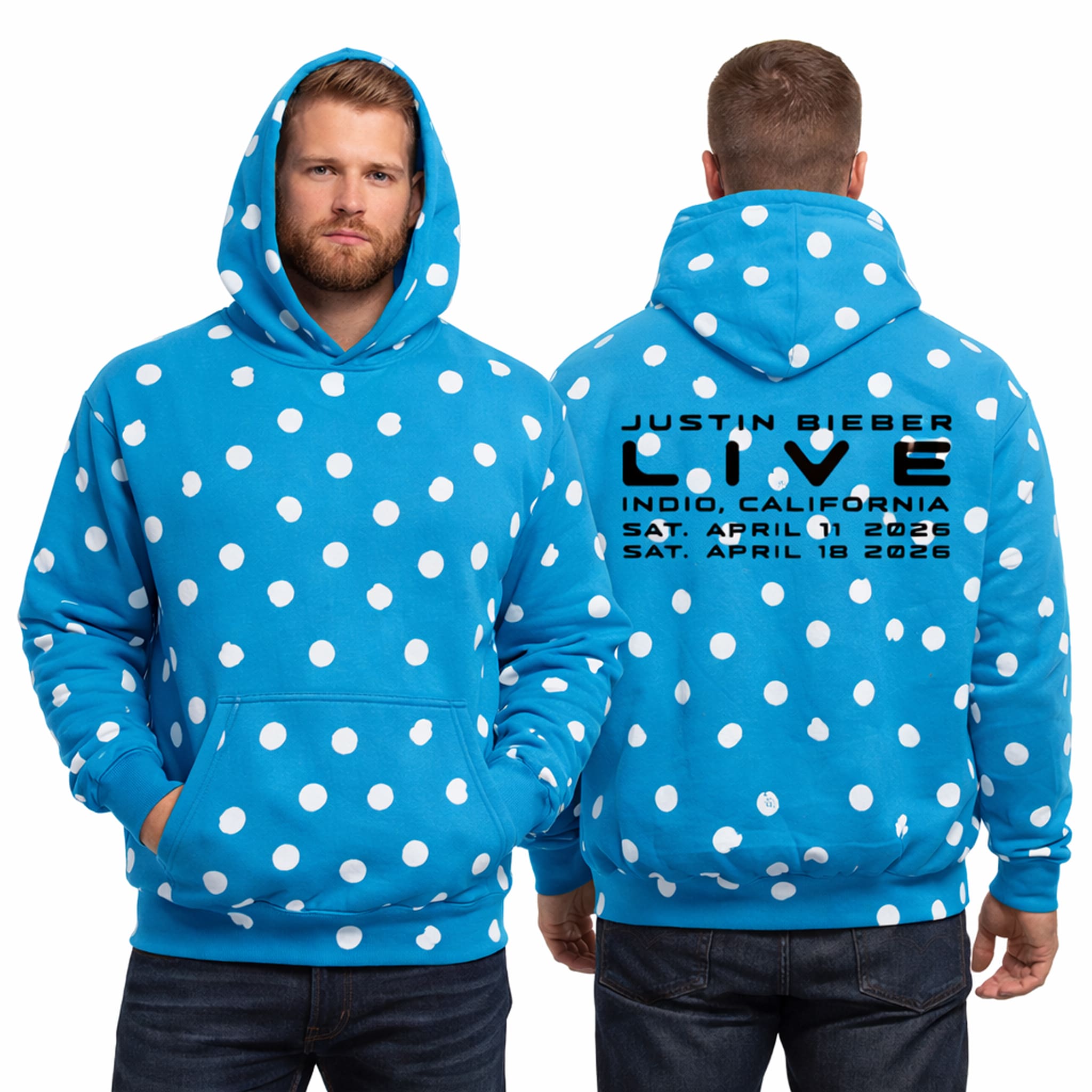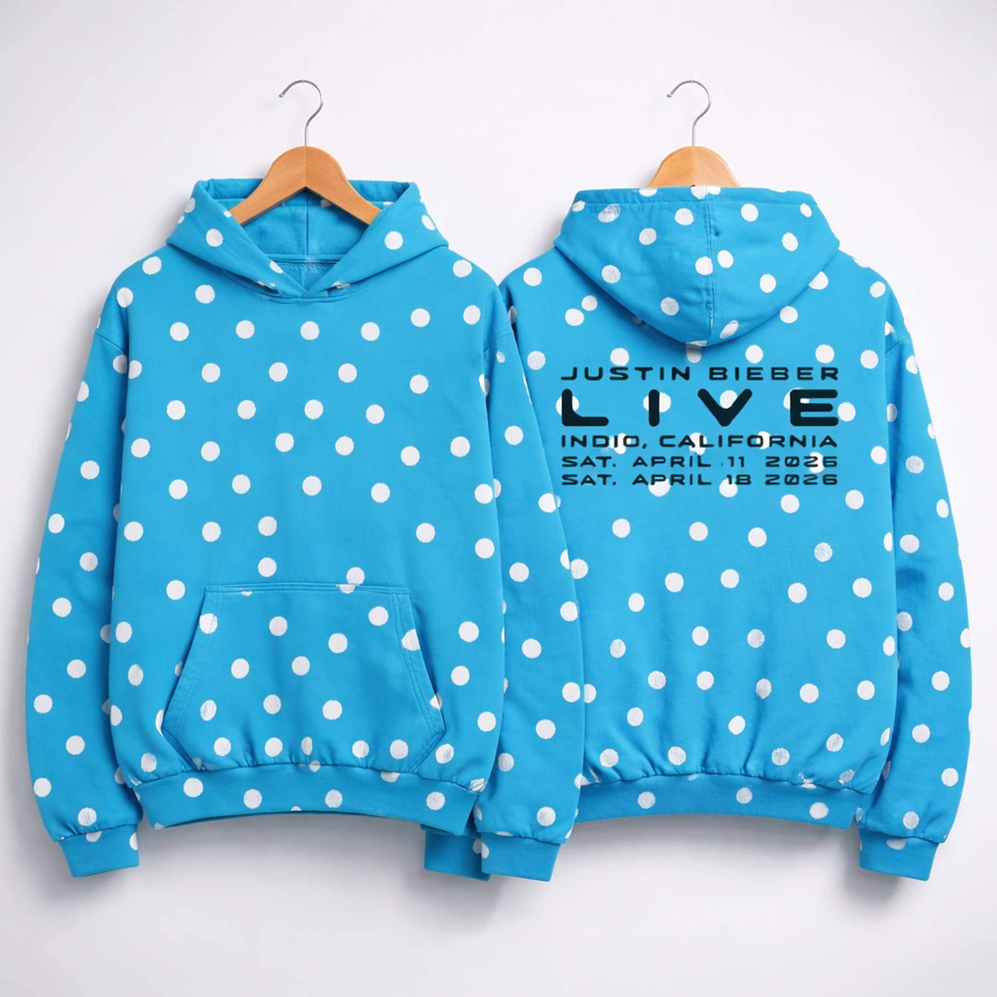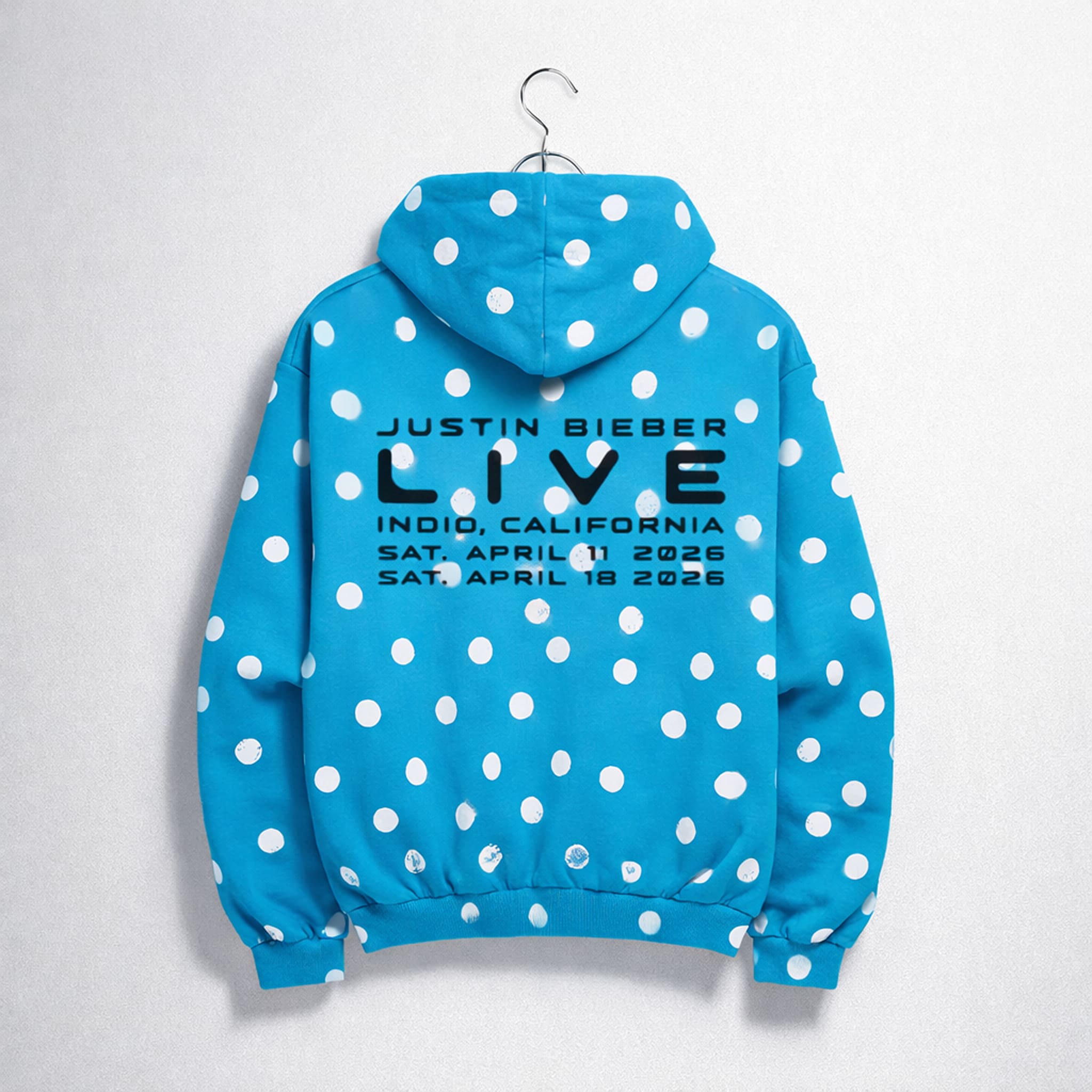 The Justin Bieber Coachella Polka Dots Hoodie 2026 is a bright blue hoodie with an all-over white polka dot pattern, specially designed to commemorate Justin Bieber’s two headline performances at Coachella 2026 (April 11 and April 18, 2026) in Indio, California.
