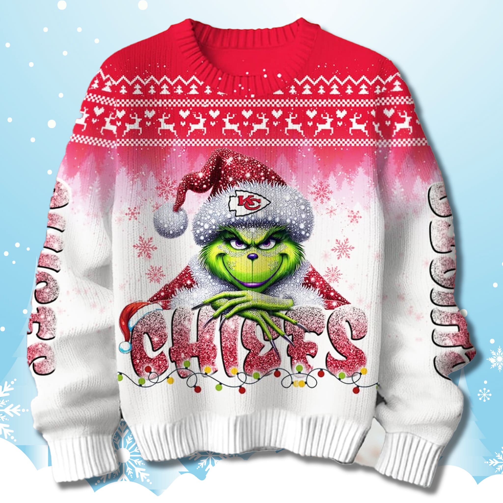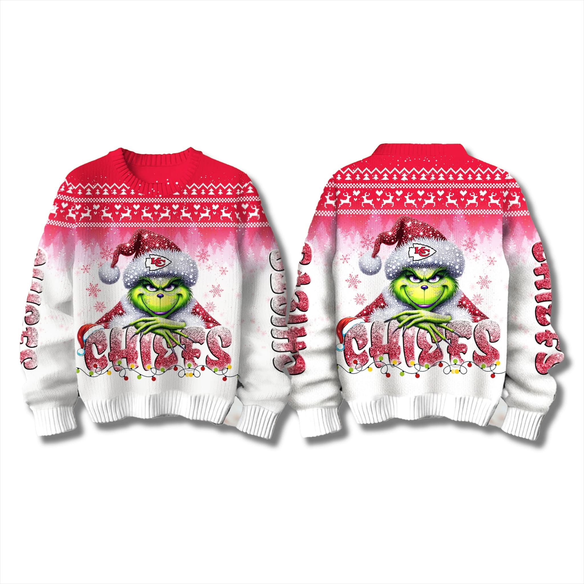 The design of this sweater stands out with a transition from the Chiefs’ signature bright red to snowy white. The shoulder area features classic knitted Christmas patterns (reindeer, snowflakes). The main highlight is the playful Grnch illustration, with the word “CHIEFS” in front covered in sparkling snow and wrapped around with Christmas lights.