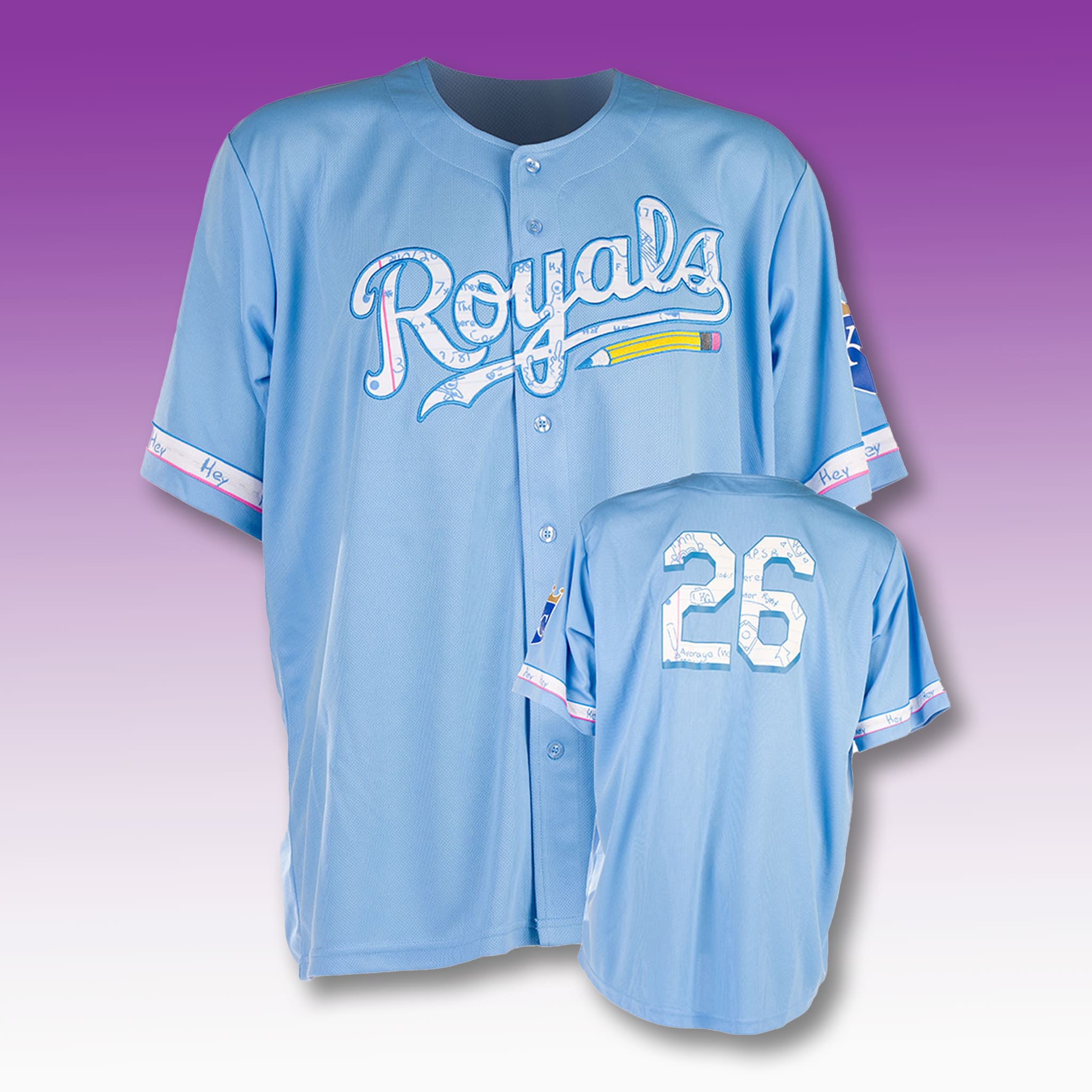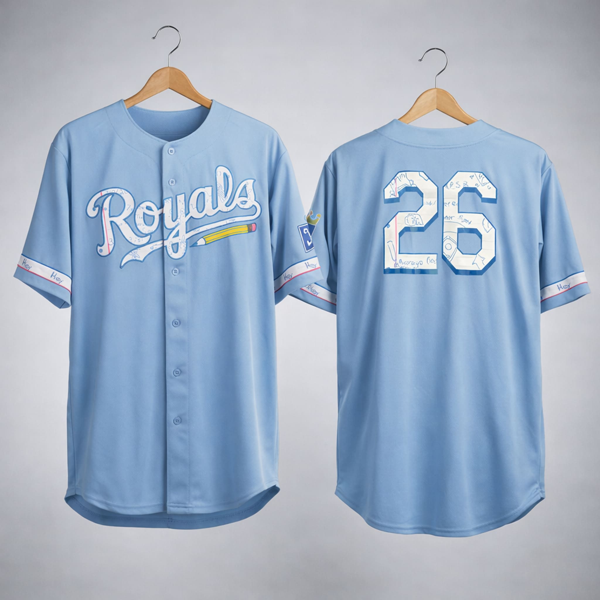 This jersey features a refined and creative design: a signature light blue background. The number “26” on the back is surrounded by subtle repeating patterns of handwritten notes, pencils, books, and school-themed icons, creating a professional yet cheerful look that meaningfully pays tribute to the role of teachers. The sleeves include a repeating “Hey” detail along the trim, adding a friendly and youthful touch.