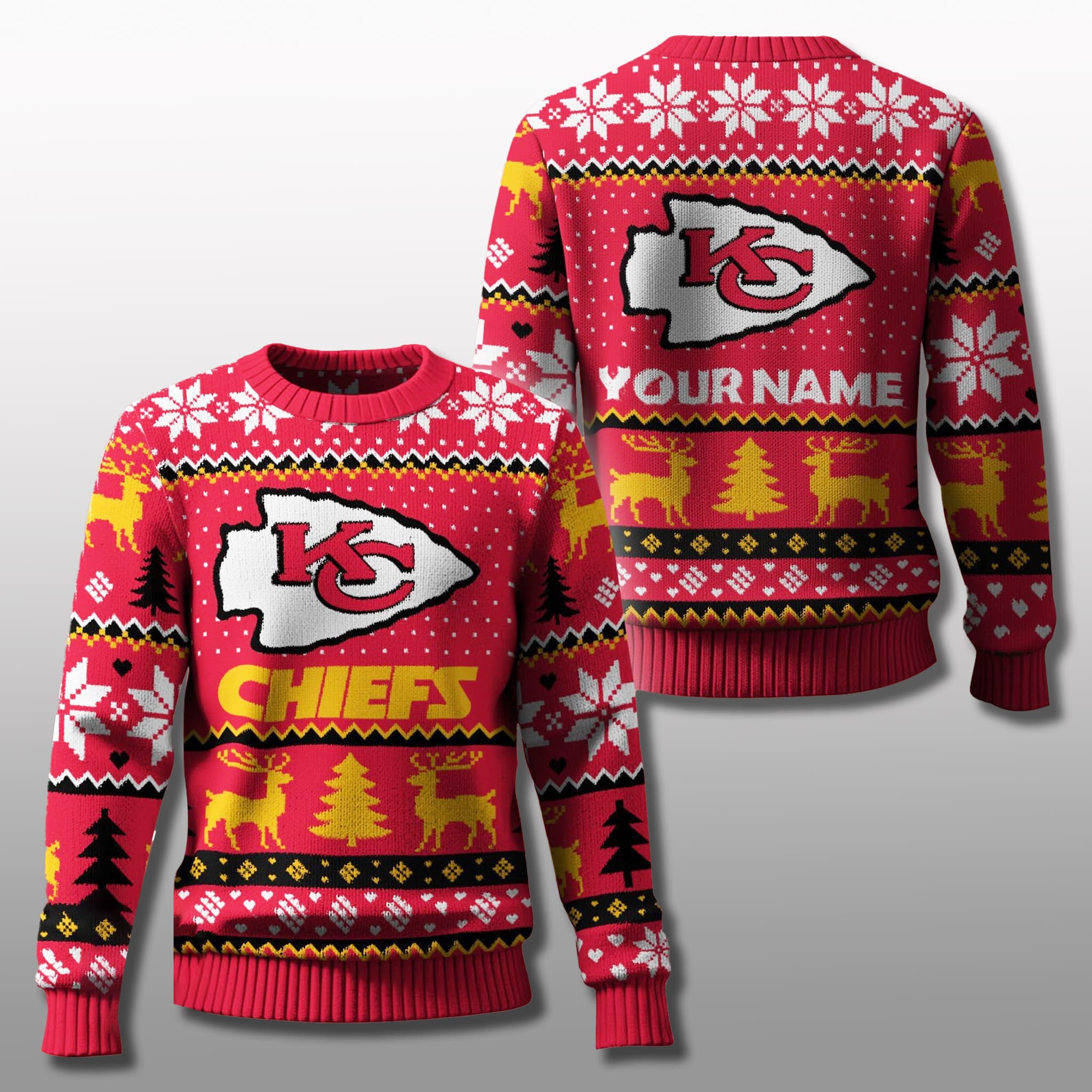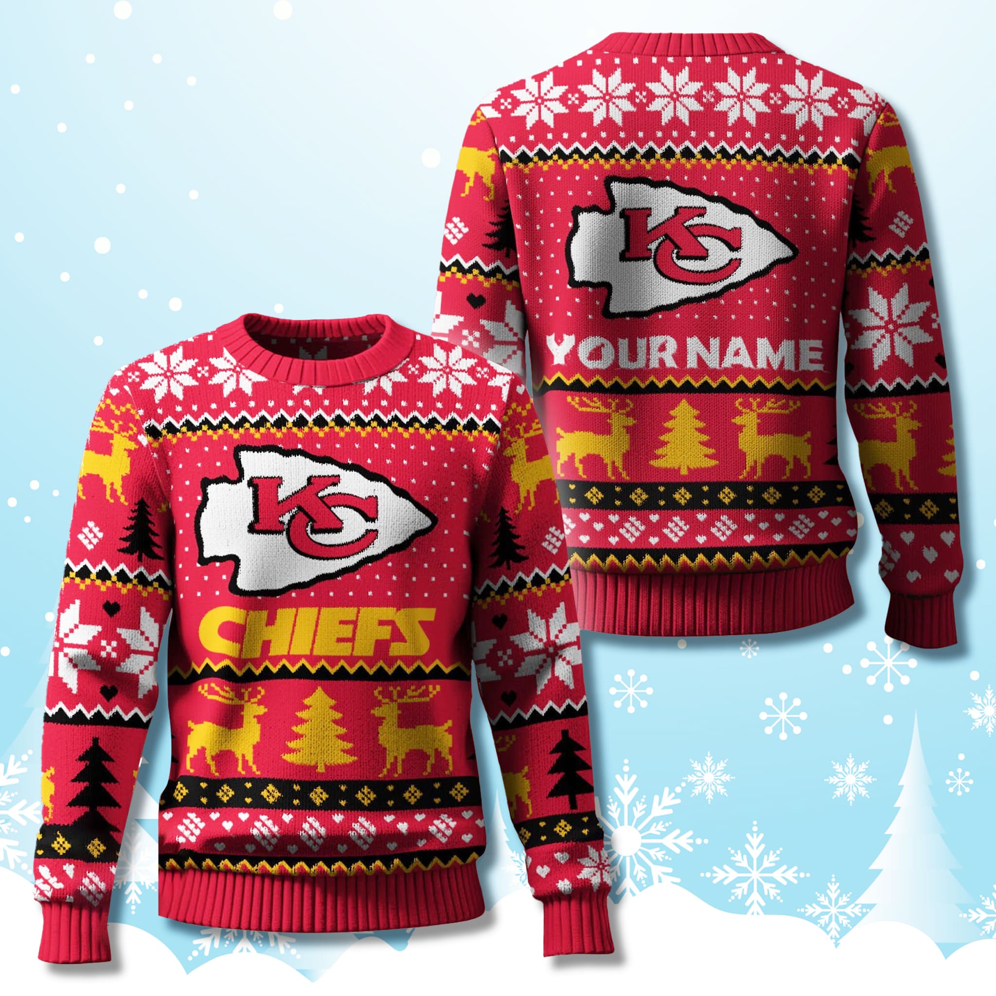 Styled in the 2025 ugly sweater theme, this piece features the Chiefs’ signature bright red, accented with snowy white and gold for a fun and vibrant holiday look. Key design elements include the KC logo wearing a Santa hat, customizable name text on the back, reindeer, Christmas trees, and falling snowflakes – creating a perfect balance between professional football pride and today’s booming personalization trend.