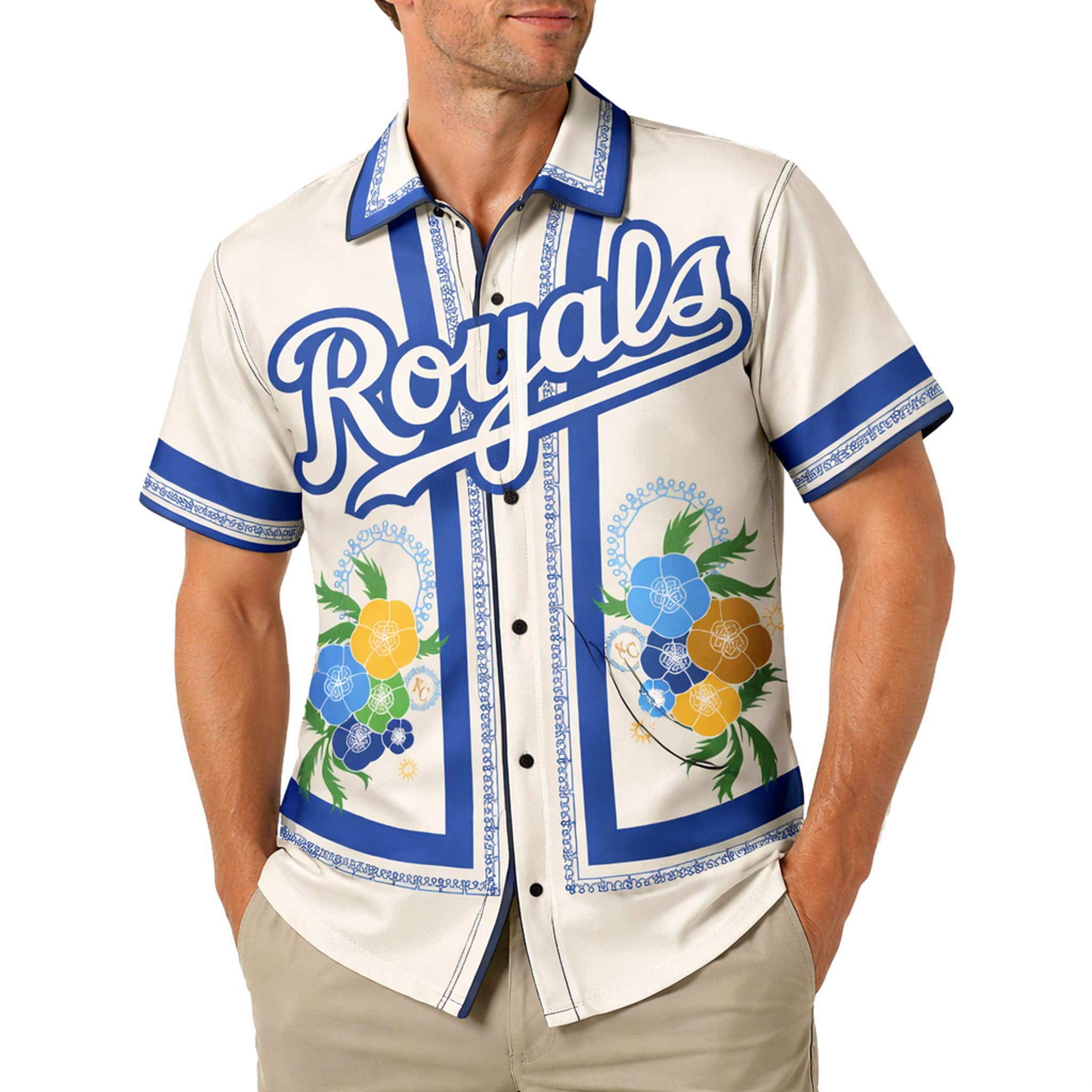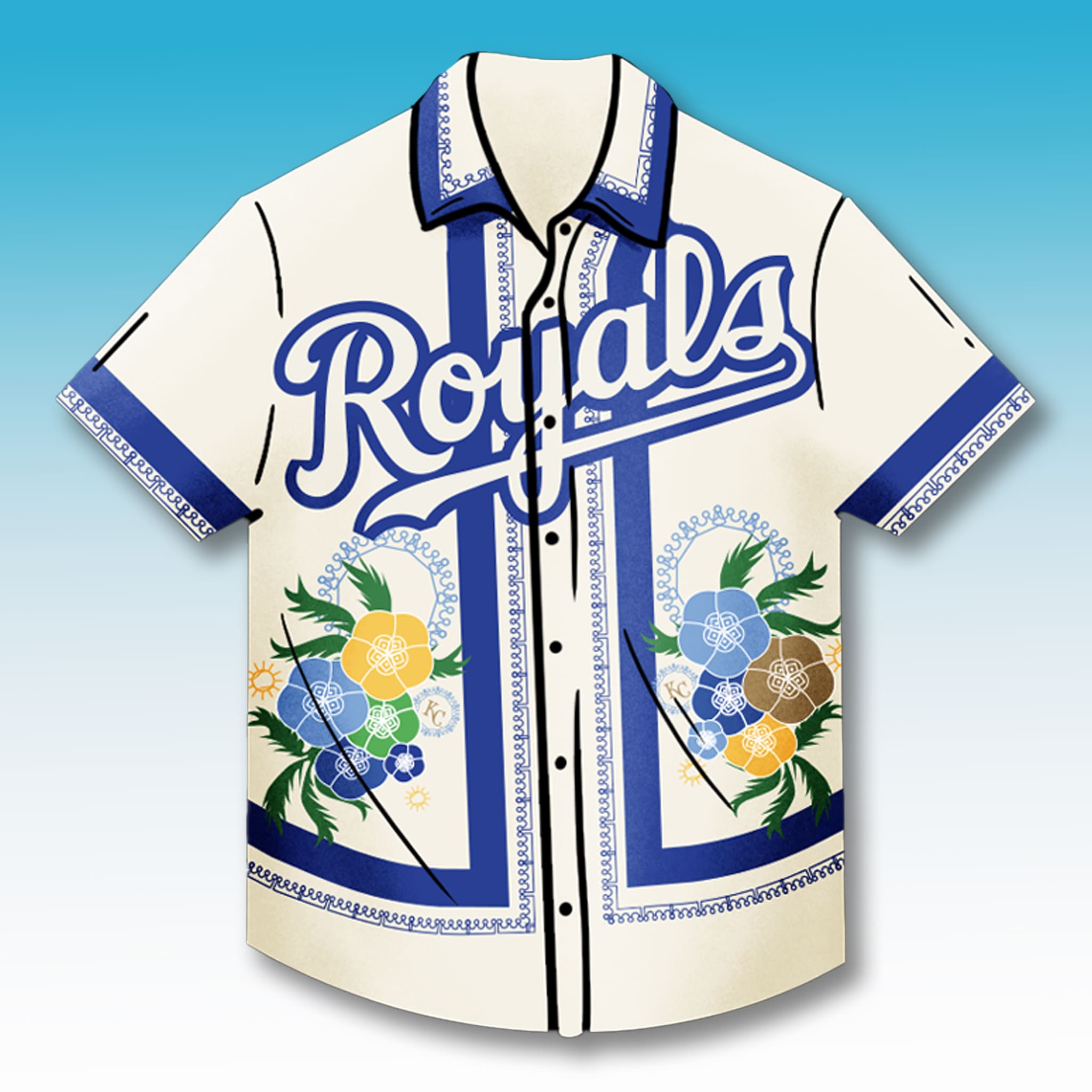 The overall design features a fresh tropical style combined with Royals pride: a bright cream-white base covered in blooming floral patterns in blue, yellow, orange, and green – representing “Here Comes the Bloom.” It is paired with a bold white “Royals” script outlined in navy, royal-style floral circle accents, and classic blue trims on the collar and sleeves with refined decorative detailing.