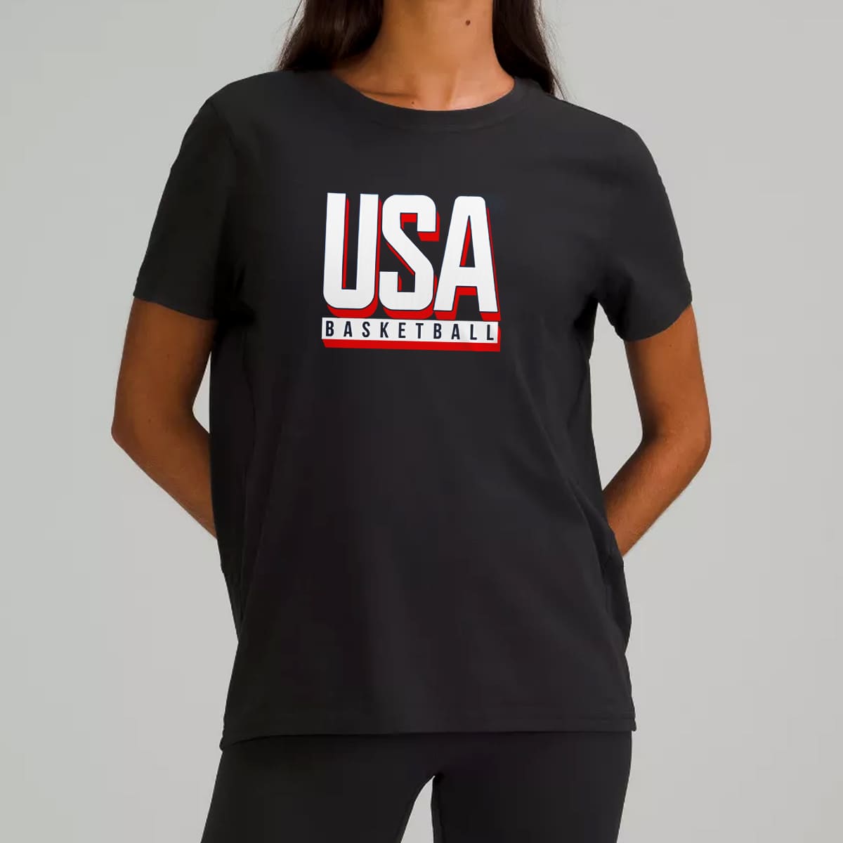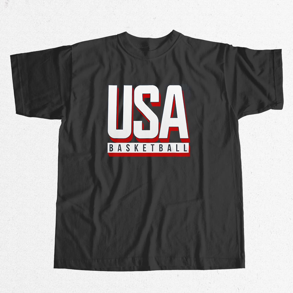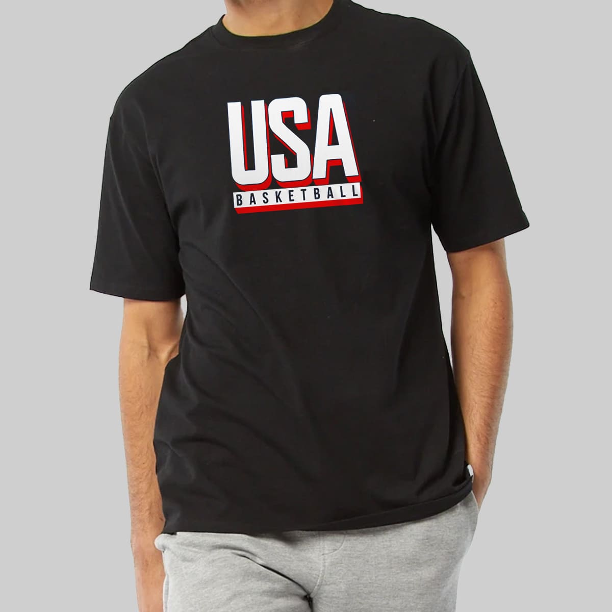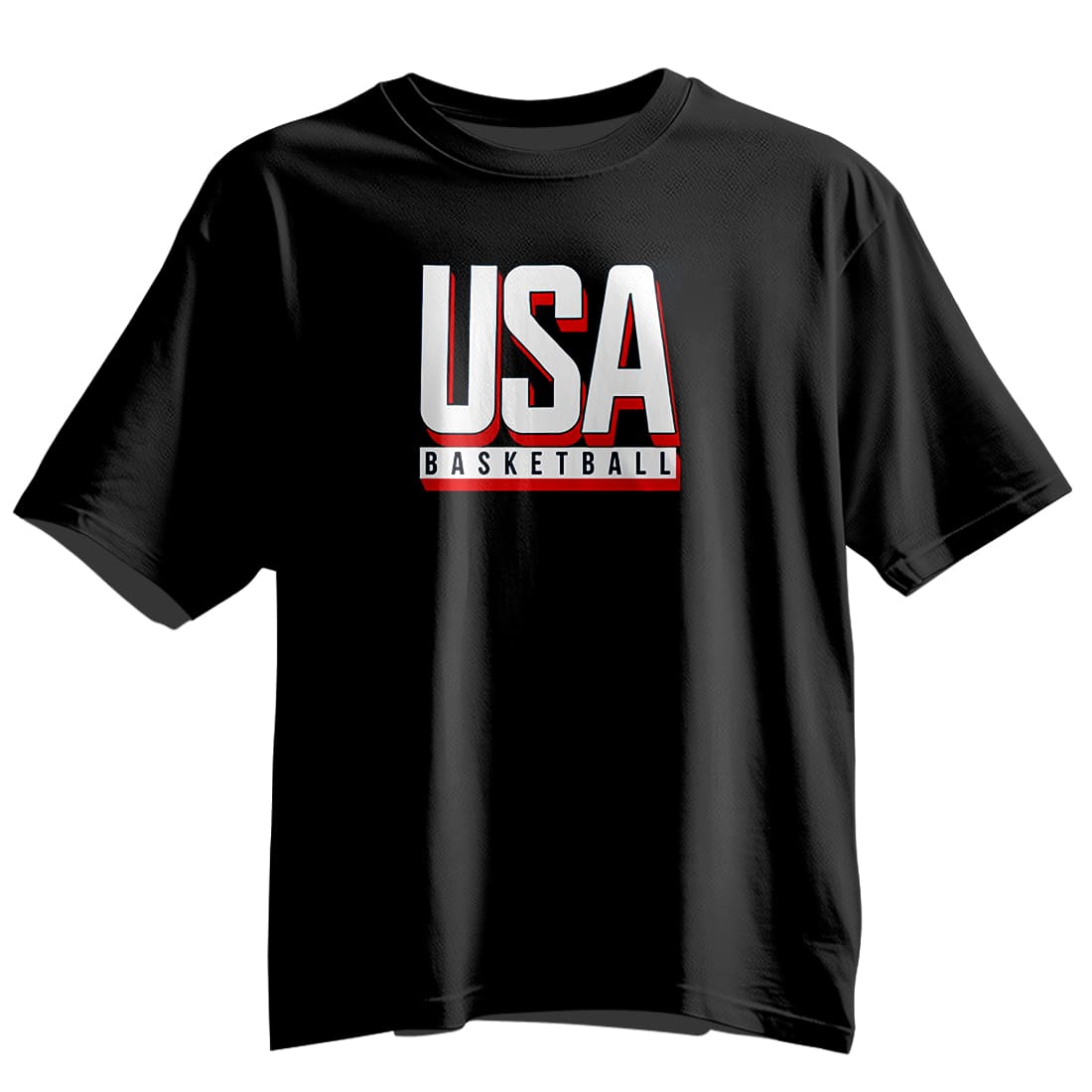 This KD USA Basketball Shirt features a minimalist graphic style on a deep black background, with large varsity-style “USA BASKETBALL” lettering in white and red, outlined in navy blue. This creates a strong patriotic vibe, easy to pair with shorts or a jacket for on-court looks or casual wear.