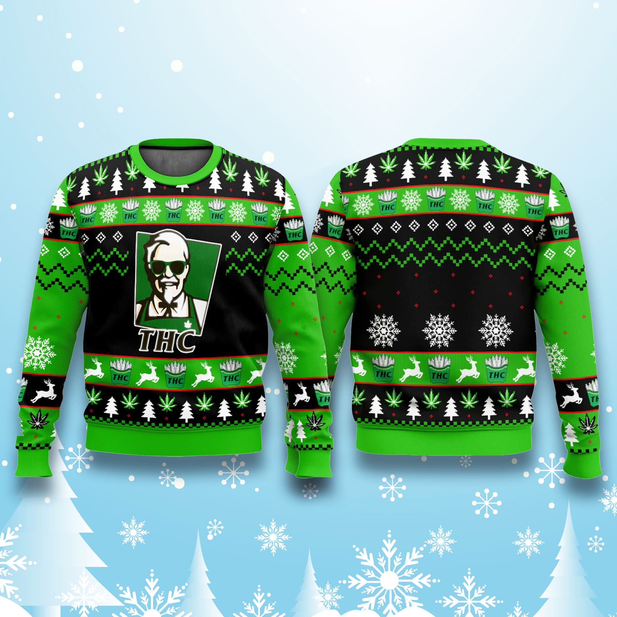 Experience Christmas with 420 by your side! KFC THC Funny Ugly Sweater is the right choice for 420 followers, don’t worry about the cold of Christmas when you have 420 sweater with you.