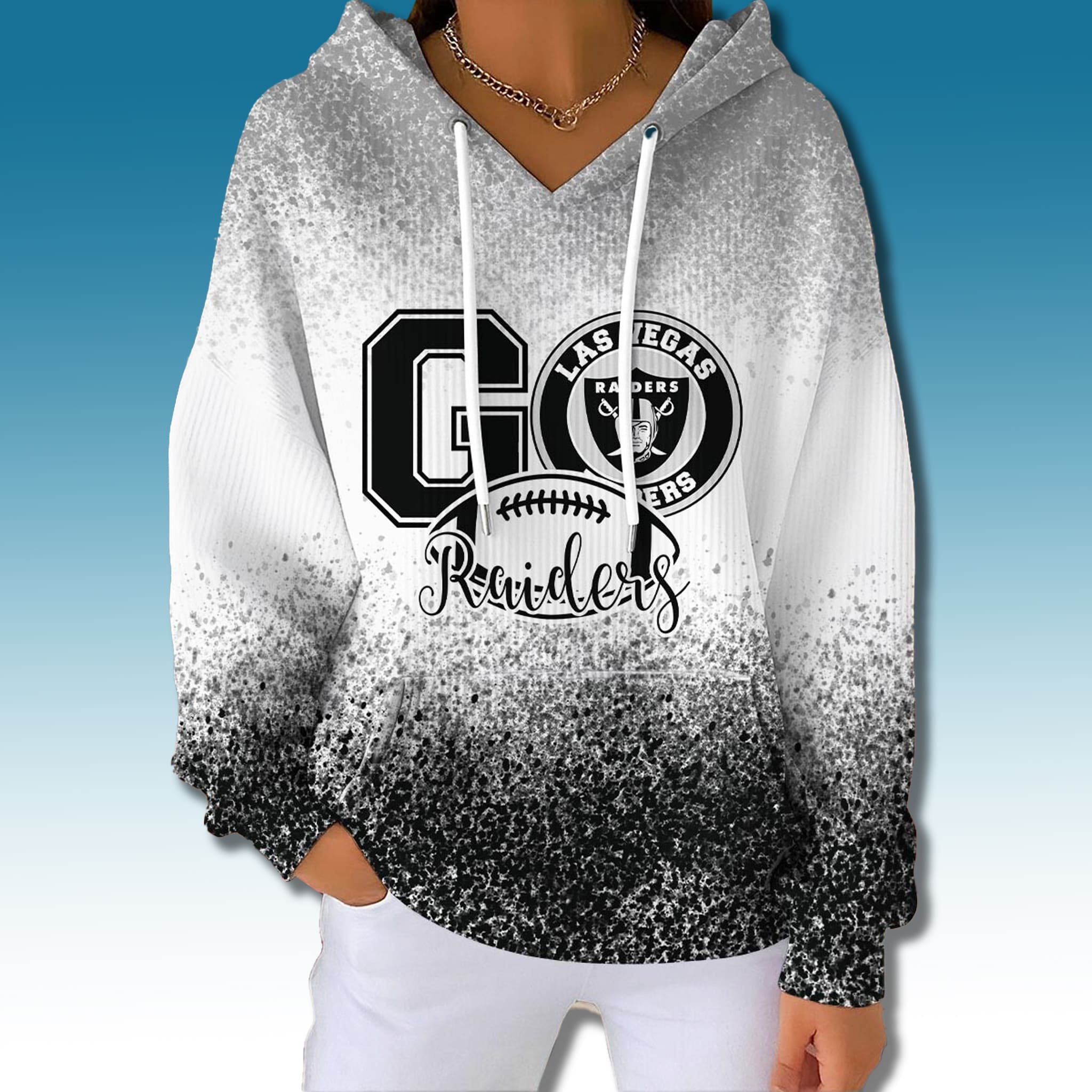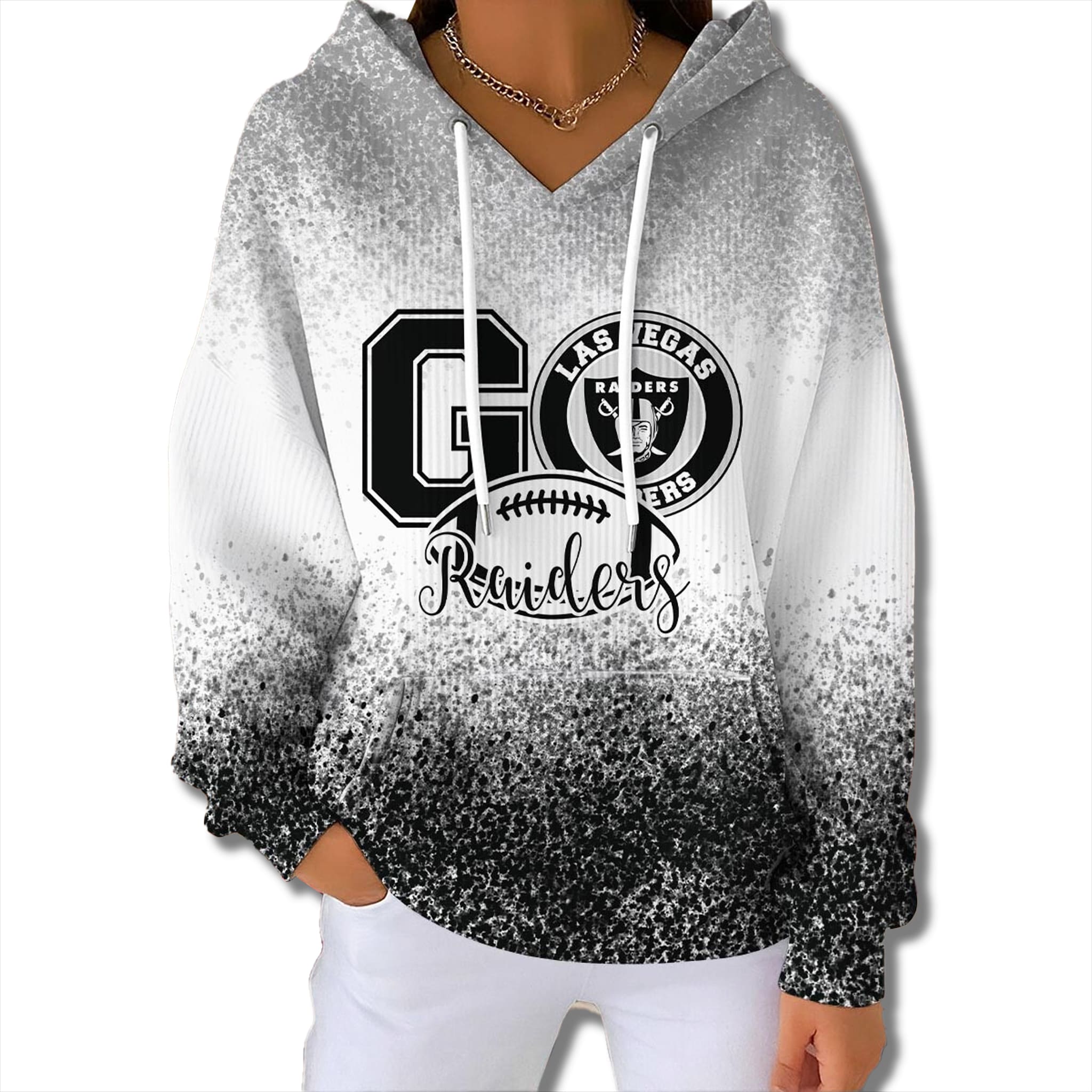 This Las Vegas sports hoodie stands out with its unique gradient design, transitioning from bright white at the top to bold black at the bottom, creating an effect reminiscent of powerful rays of light or swirling smoke. The design centers on the “GO” cheer and team emblem, making a dynamic and modern fashion statement.