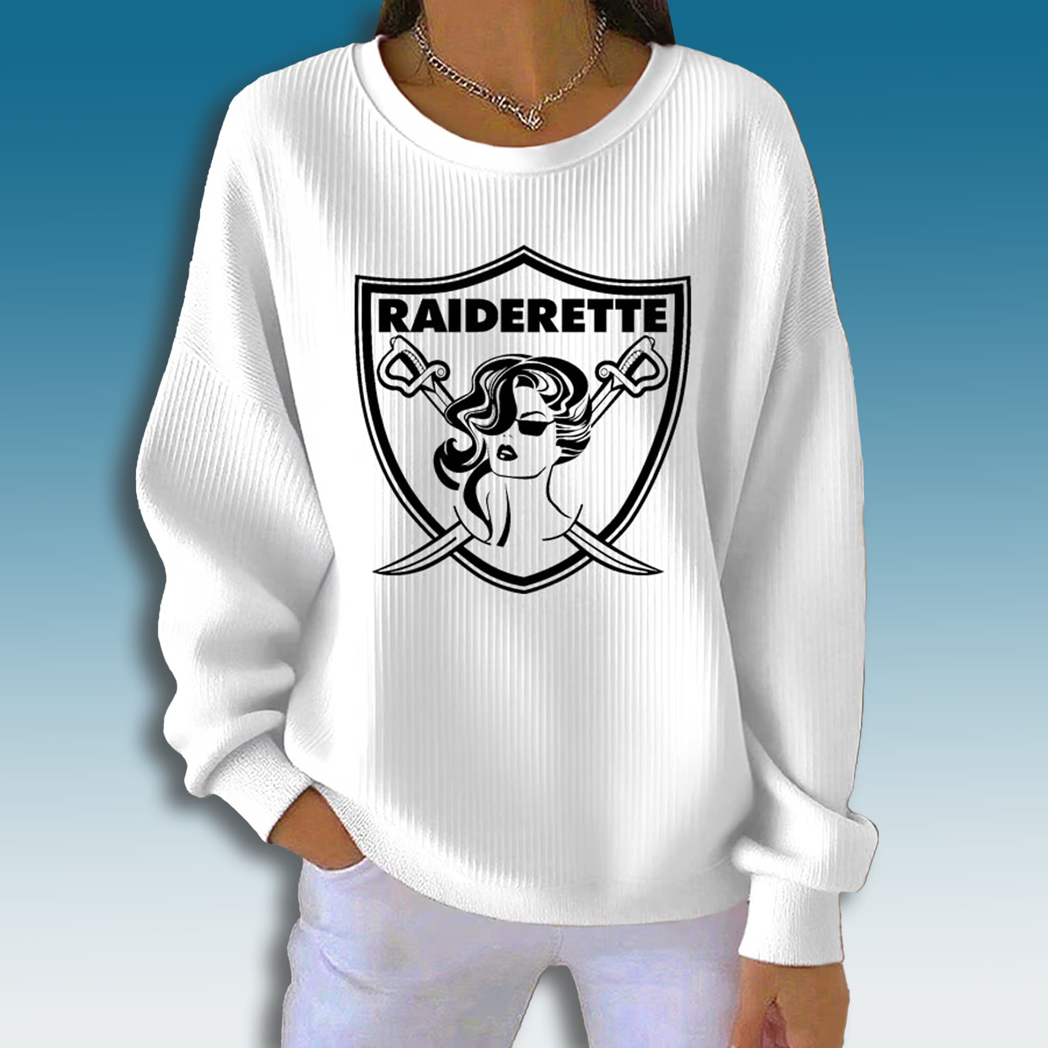 This striking Raiderette Waffle Sweater comes in the classic Raiders black and silver colorway, offering a sleek and versatile look. The oversized graphic centerpiece features the powerful “RAIDERETTE” wordmark above a stylized female figure, flanked by two crossed cutlasses, all set within the iconic Raiders shield logo. The sweater itself boasts a distinctive waffle-knit texture, which provides a premium, comfortable feel and a stylish, cozy aesthetic.