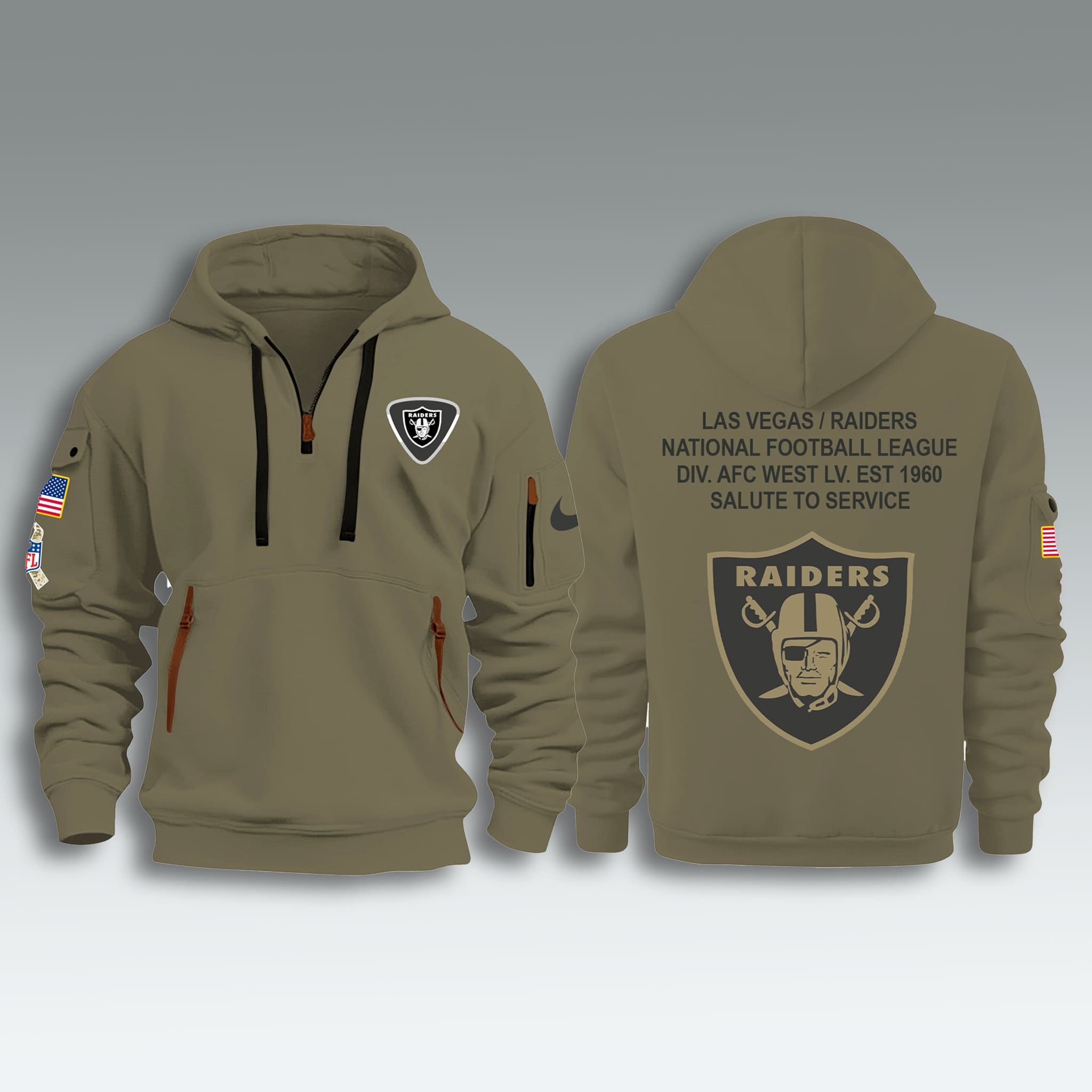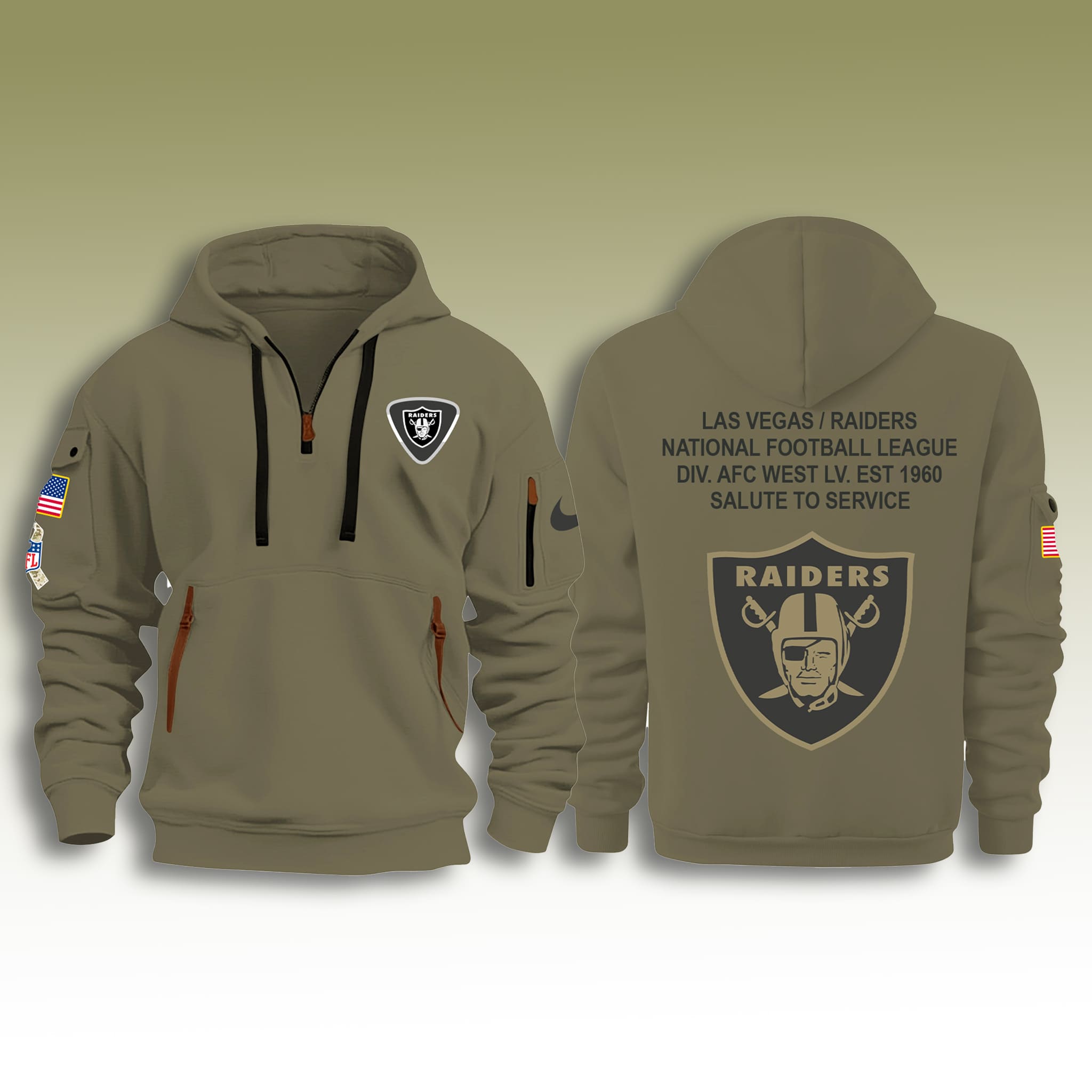 The Raiders 2025 Salute To Service Quarter Zip Hoodie is the perfect way to embrace the Raiders’ legacy of grit and passion. With its warm fleece and bold olive design, this piece honors unsung heroes while echoing the timeless call – “Just Win Baby.” Join Raider Nation today – add it to your cart and gear up for an unforgettable season!