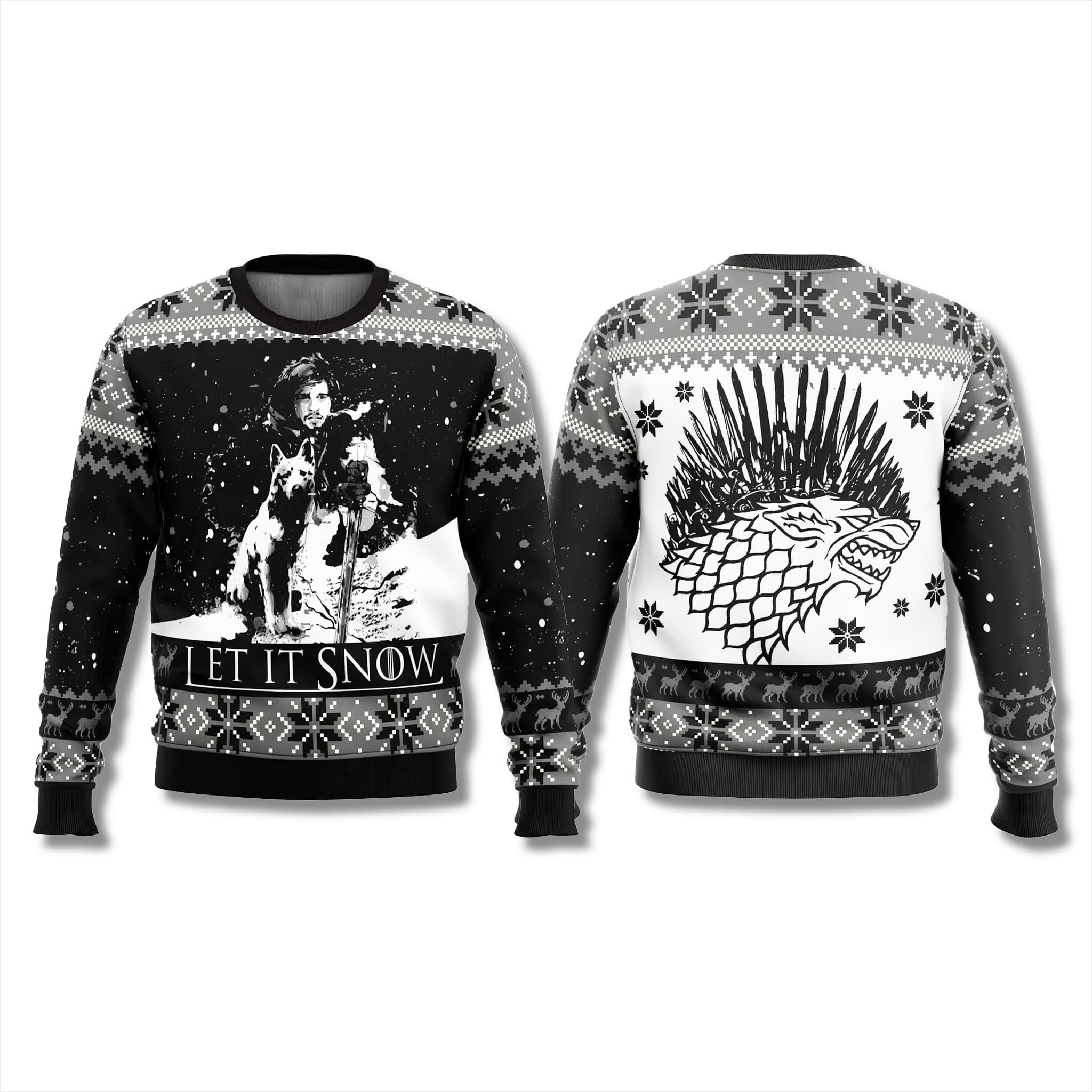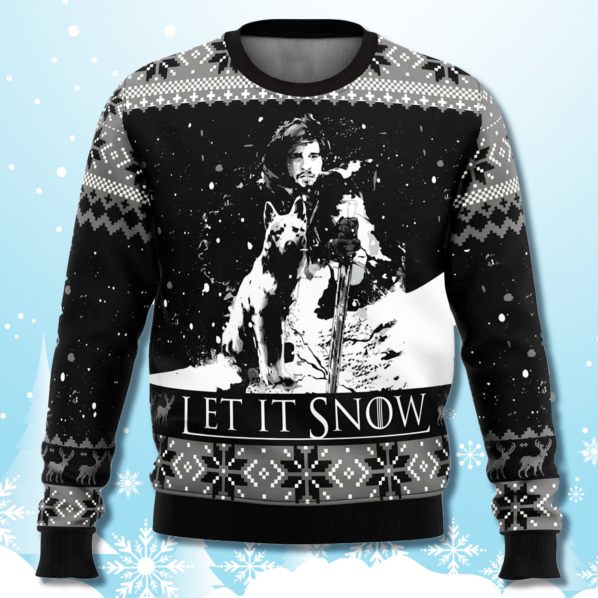 The Let It Snow Game of Thrones Black Ugly Sweater is a must-have for devoted fans of Jon Snow, the legendary King in the North, along with his loyal white direwolf, Ghost. Wear it to bring an epic, heroic vibe to every festive gathering.