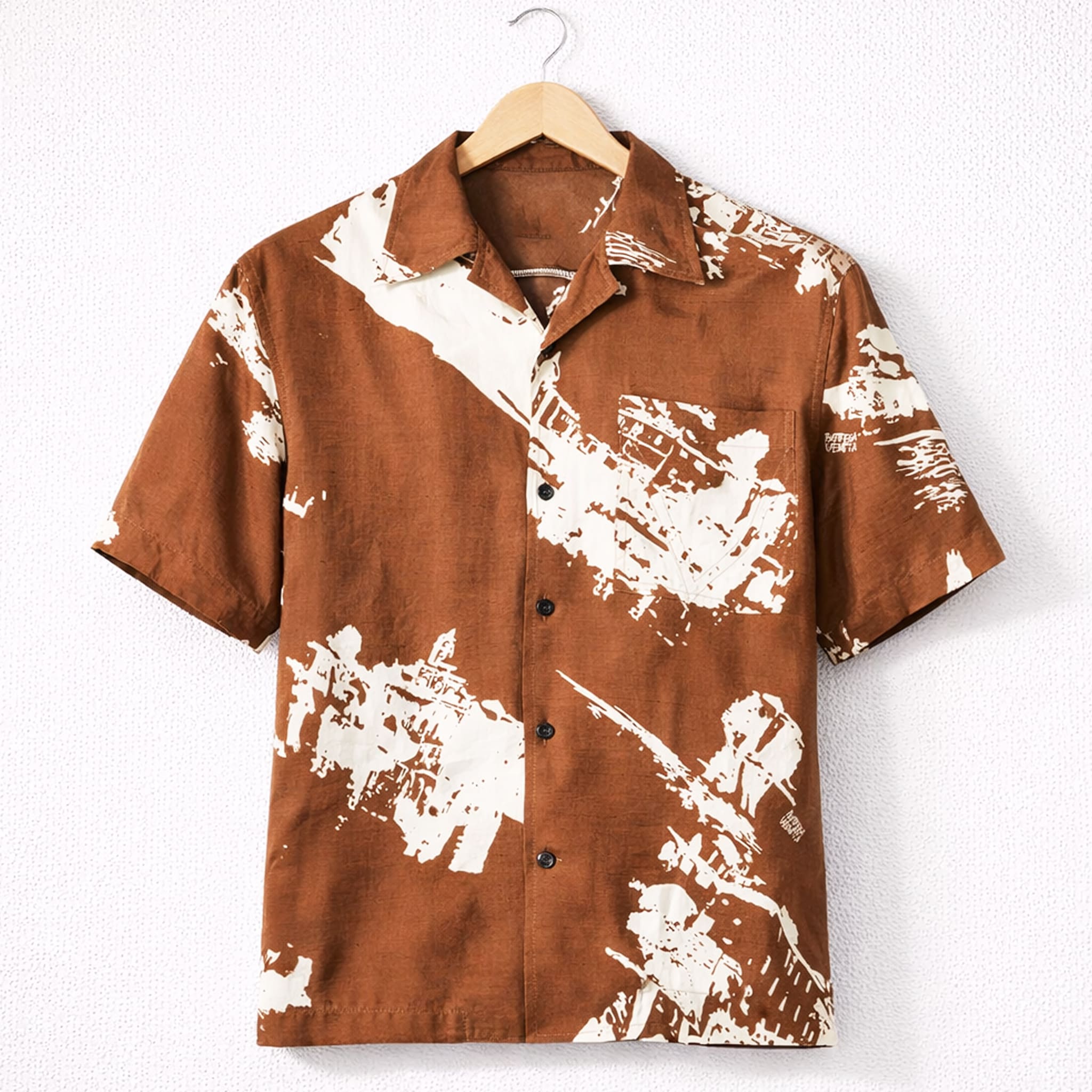 This shirt is currently available in full sizes and features a standout design with a warm earthy brown base and white abstract prints resembling Italian postcards or travel destinations. It includes a camp collar, chest pocket, and short sleeves. The refined Hawaiian shirt style feels both classic and modern, giving the relaxed sensation of being on a Hawaiian beach.