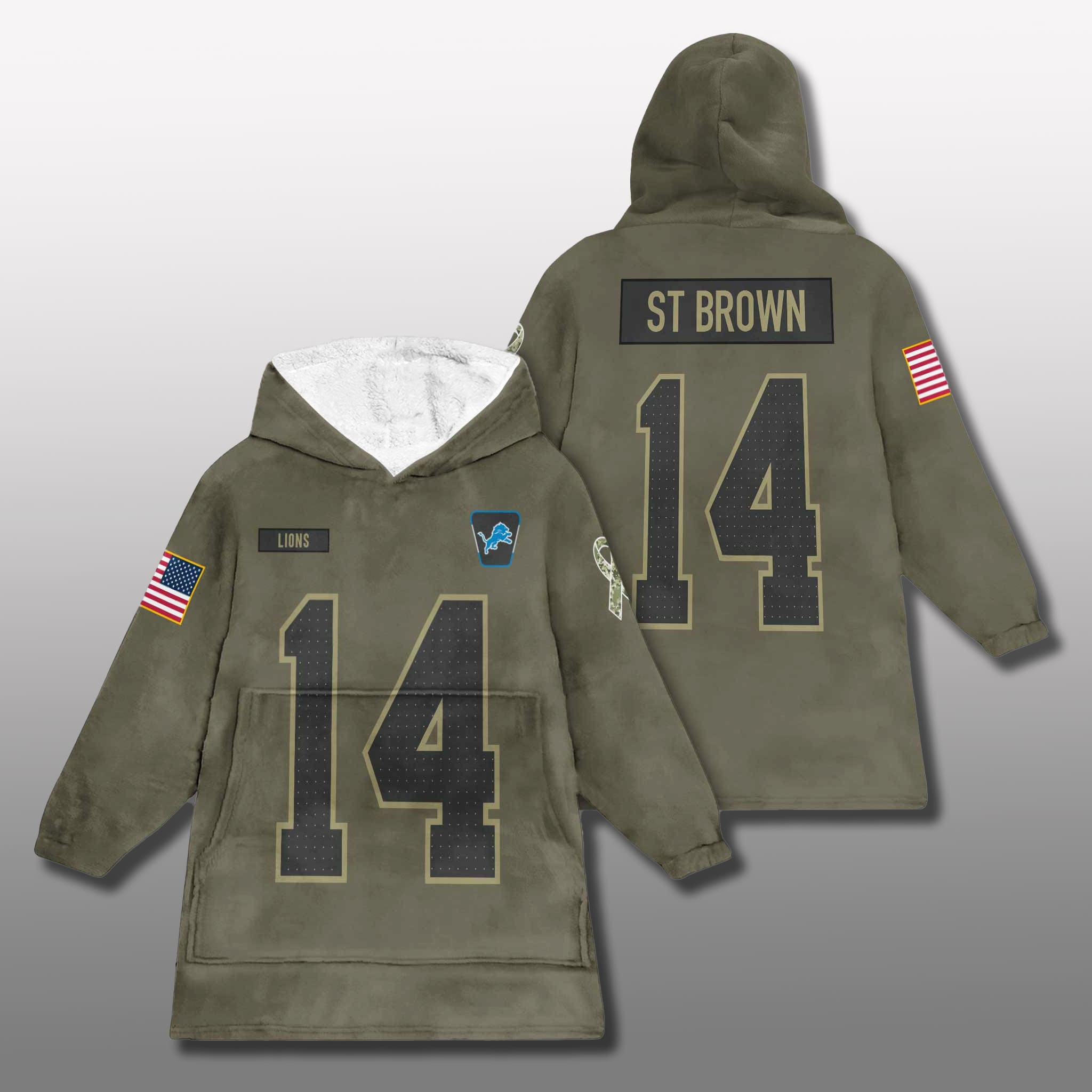 This Lions olive green blanket hoodie stands out with its powerful army green tone, accompanied by details such as the American flag and the signature ribbon emblem of the “Salute To Service” campaign on the sleeve. The large 14 printed on the front and the player name ST BROWN on the back create a look that is both warm and full of patriotism and responsibility.