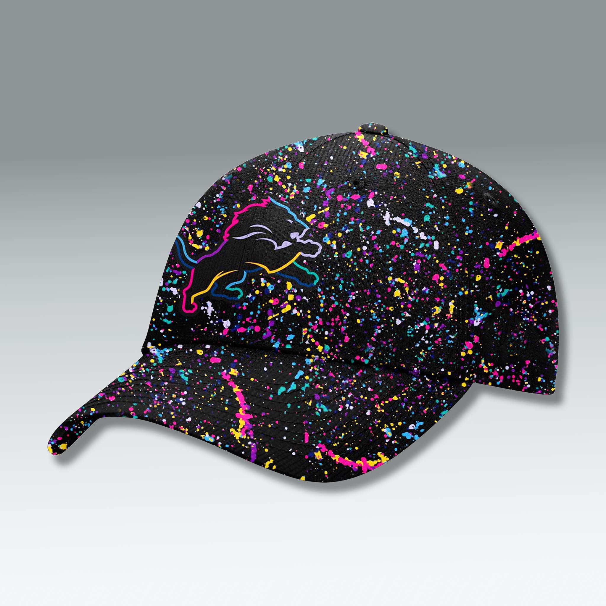 The design of the Lions Cancer 2025 Hat perfectly blends team passion with the powerful message of the cause. The cap’s dark base provides a dramatic backdrop for the lively neon splatter pattern—a kaleidoscope of pink, aqua, yellow, and magenta that symbolizes the diverse efforts in cancer research.