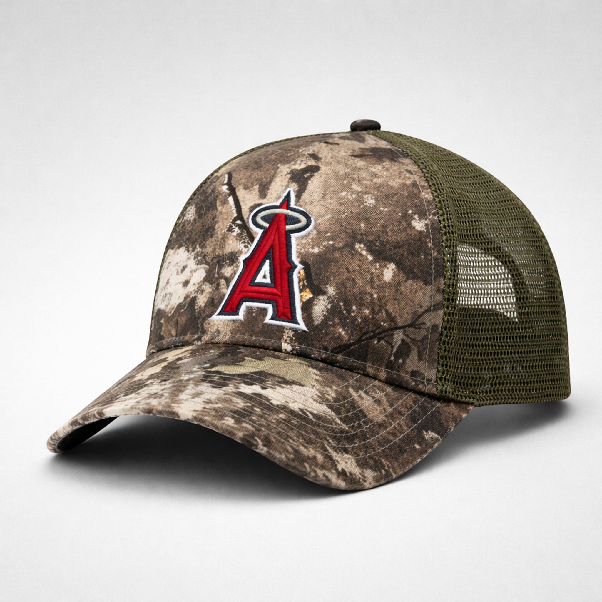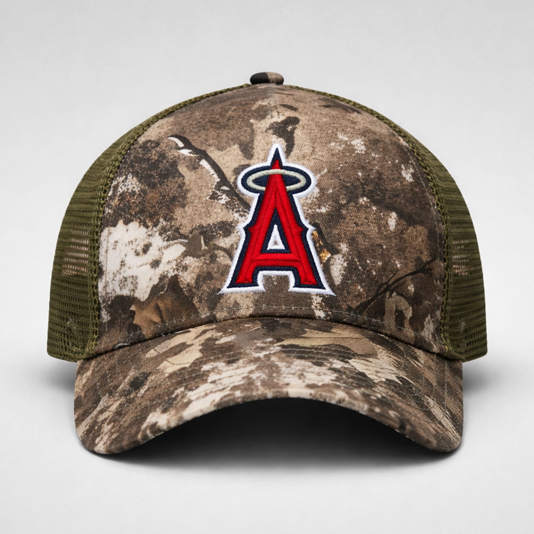 The hat features a classic trucker hat design: a woodland camouflage pattern on the front panel, paired with a breathable olive mesh back for added comfort. The front showcases the iconic red “A” Angels logo, boldly embroidered with white and navy outlines, creating a strong visual highlight. Made from high-quality, breathable, and durable materials, this hat is perfect for wearing at Angel Stadium or as part of your everyday style to proudly show off your Angels pride.