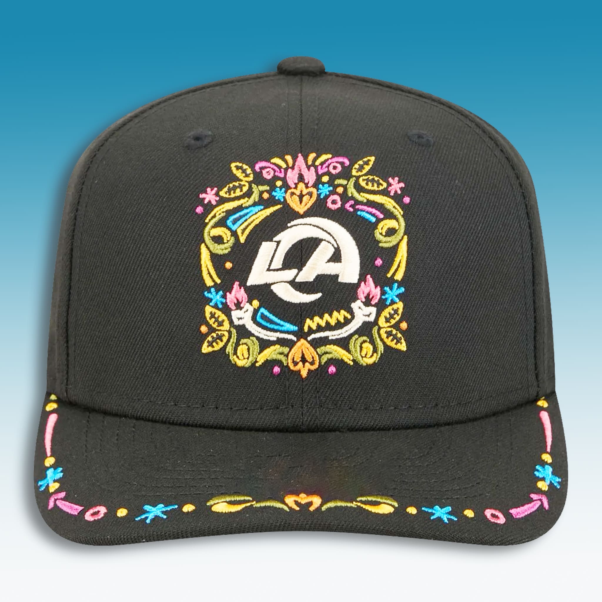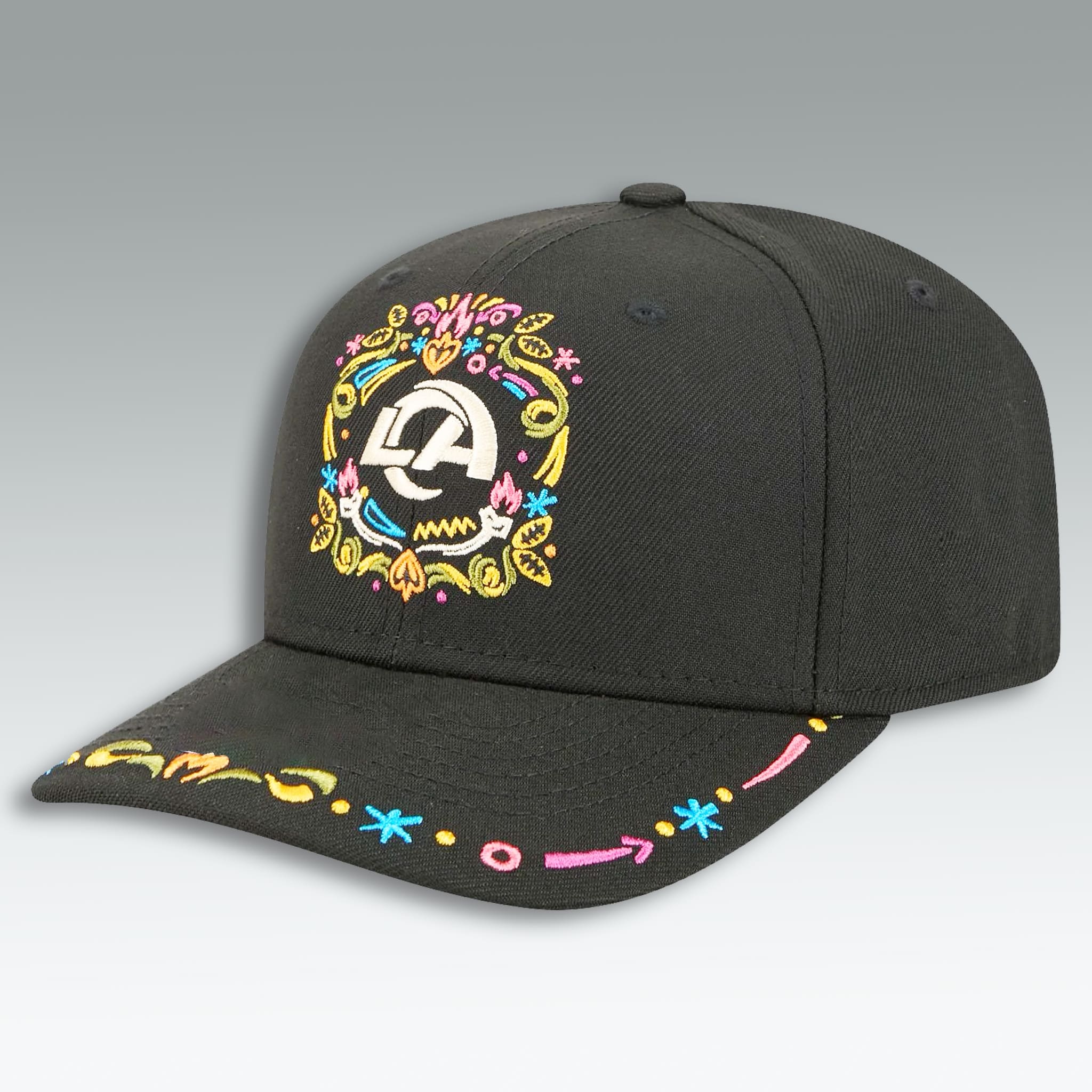This LA Rams Hasta La Muerte Hat reimagines classic team apparel with a spectacular, culturally rich overlay. This artistic flair extends to the brim, adding a playful yet sophisticated touch. This cap embodies a fearless, expressive style, making it the perfect choice for the fan who wants to blend urban flair with deep team loyalty. It’s a statement piece that truly represents the heart and soul of the Los Angeles community.