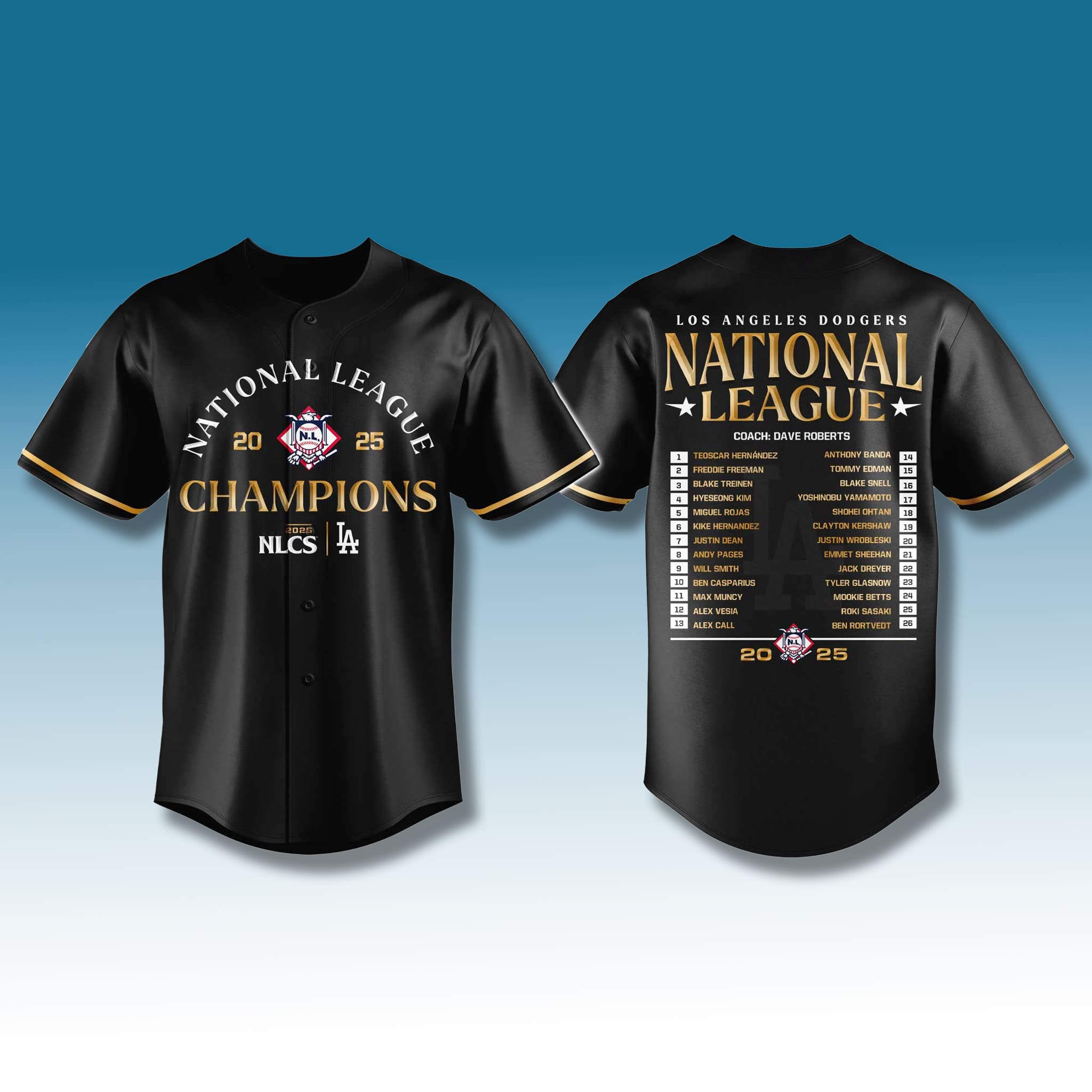 The Loss Angeles Dodgers 2025 NLCS Champions Full Team Jersey showcases a stylish black base with gold accents for a championship-inspired look. The front highlights the “National League 2025 Champions” emblem with NLCS and LA logos, while the back features the complete roster, embodying the spirit of Dodgers NLCS apparel.