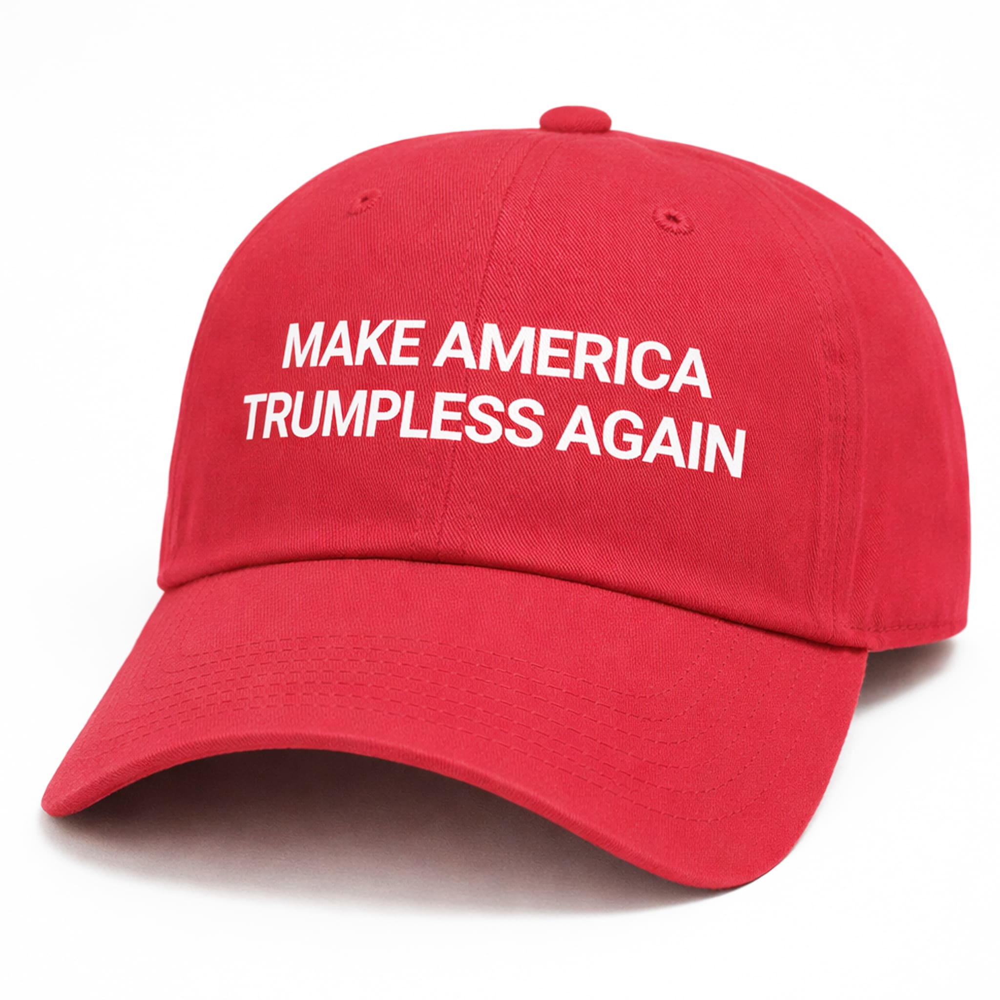 This hat is designed in the signature red tone—closely associated with the original MAGA campaign – making the new message even more striking and unexpected. The main slogan “MAKE AMERICA TRUMPLESS AGAIN” is boldly displayed on the front, allowing you to stay fashionable while clearly expressing the hat’s message.
