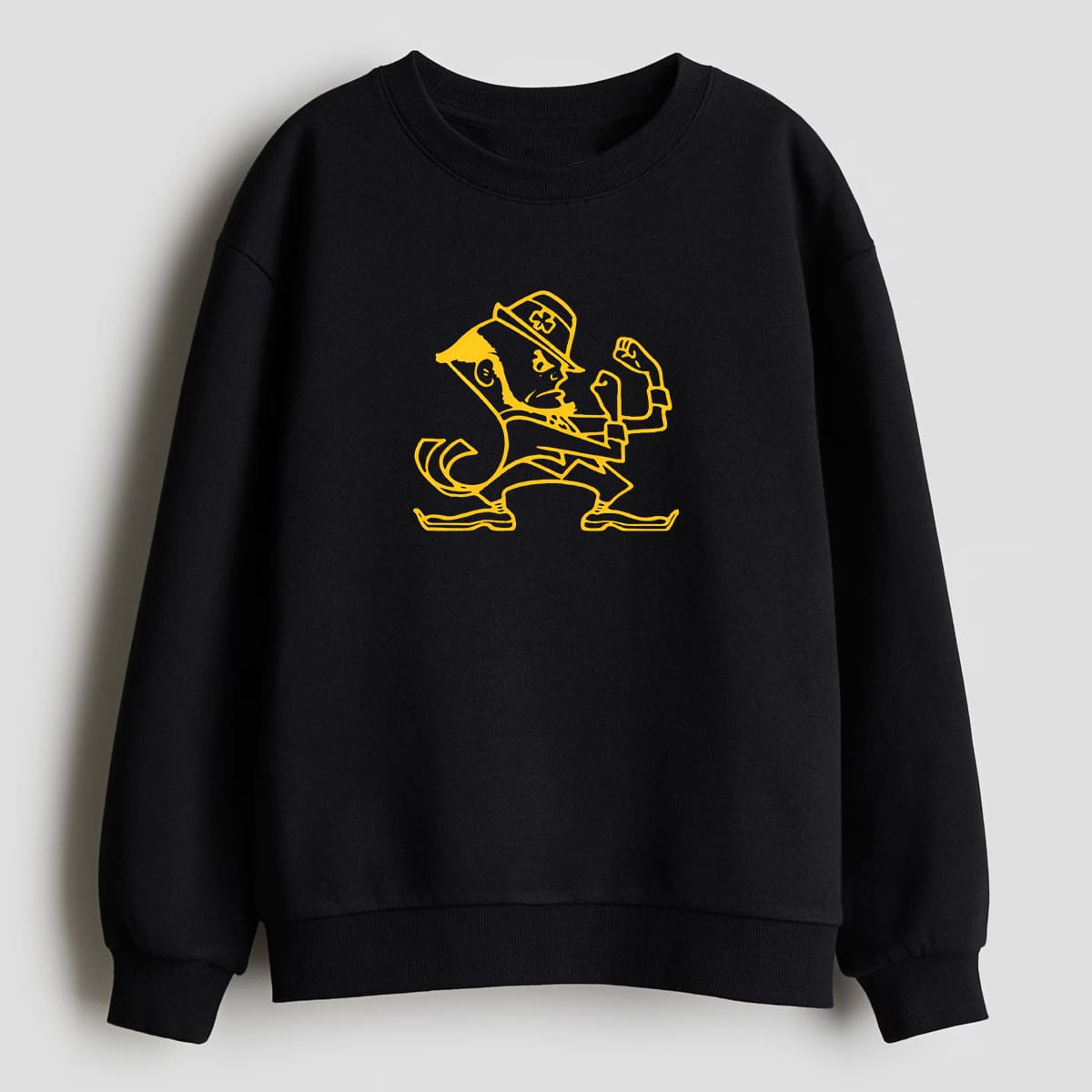 The Marcus Freeman Notre Dame Leprechaun Sweatshirt is a strong black design featuring the iconic gold Leprechaun logo prominently at the center of the chest. This piece is part of the latest Leprechaun collection from the Notre Dame Fighting Irish, recently worn by head coach Marcus Freeman. The powerful gold detailing symbolizes luck, resilience, and the long-standing tradition of Notre Dame.