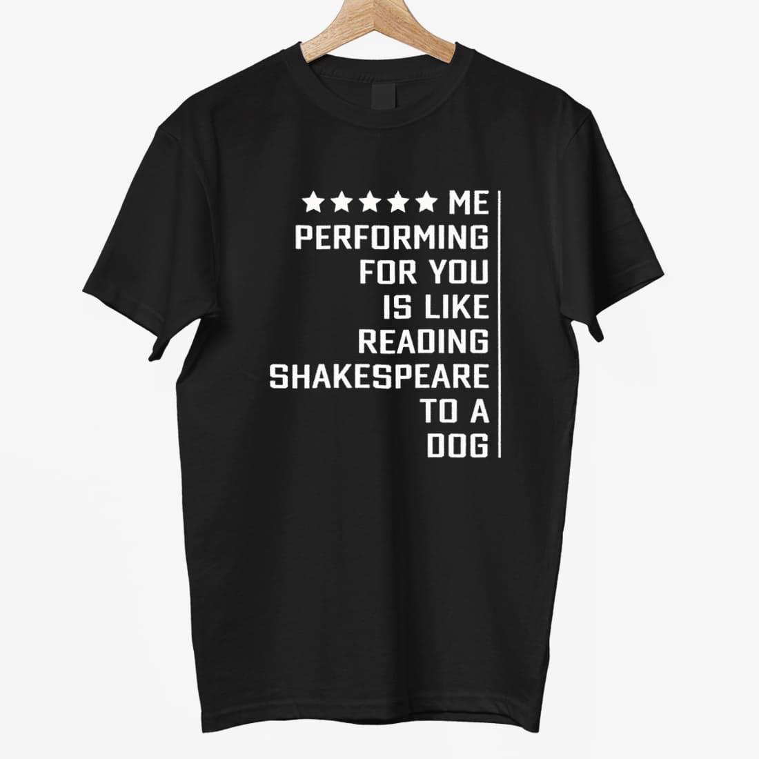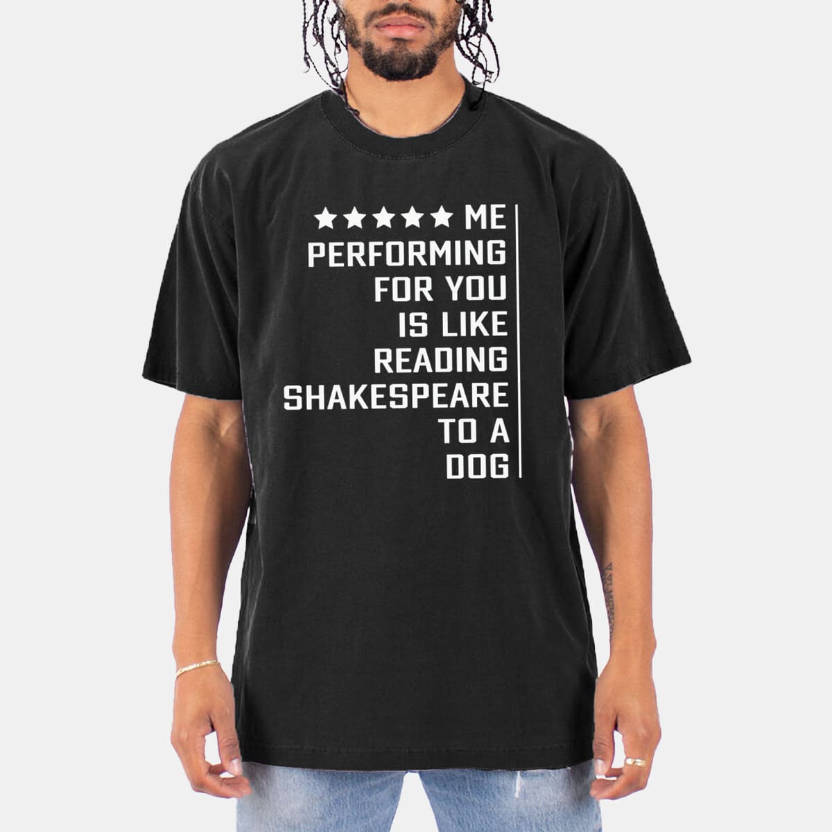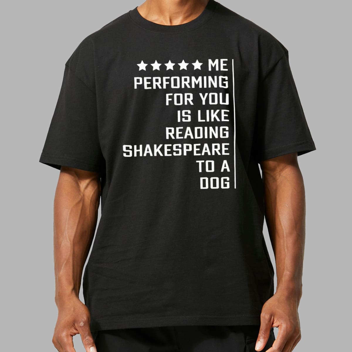 The Me Performing For You Is Like Reading Shakespeare To A Dog Shirt is a design from Zack Sabre Jr. – the “Technical Wizard” of the wrestling world (NJPW, AEW). This famous quote came from ZSJ himself in 2019, when he joked that performing high-level technical wrestling in front of American audiences was like “reading Shakespeare to a dog” – meaning the art is sophisticated but the crowd doesn’t understand or appreciate it. The quote quickly became an iconic meme in the wrestling community.