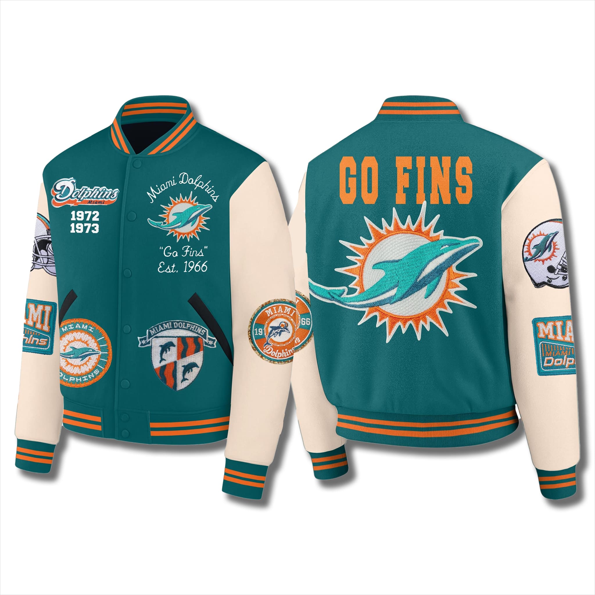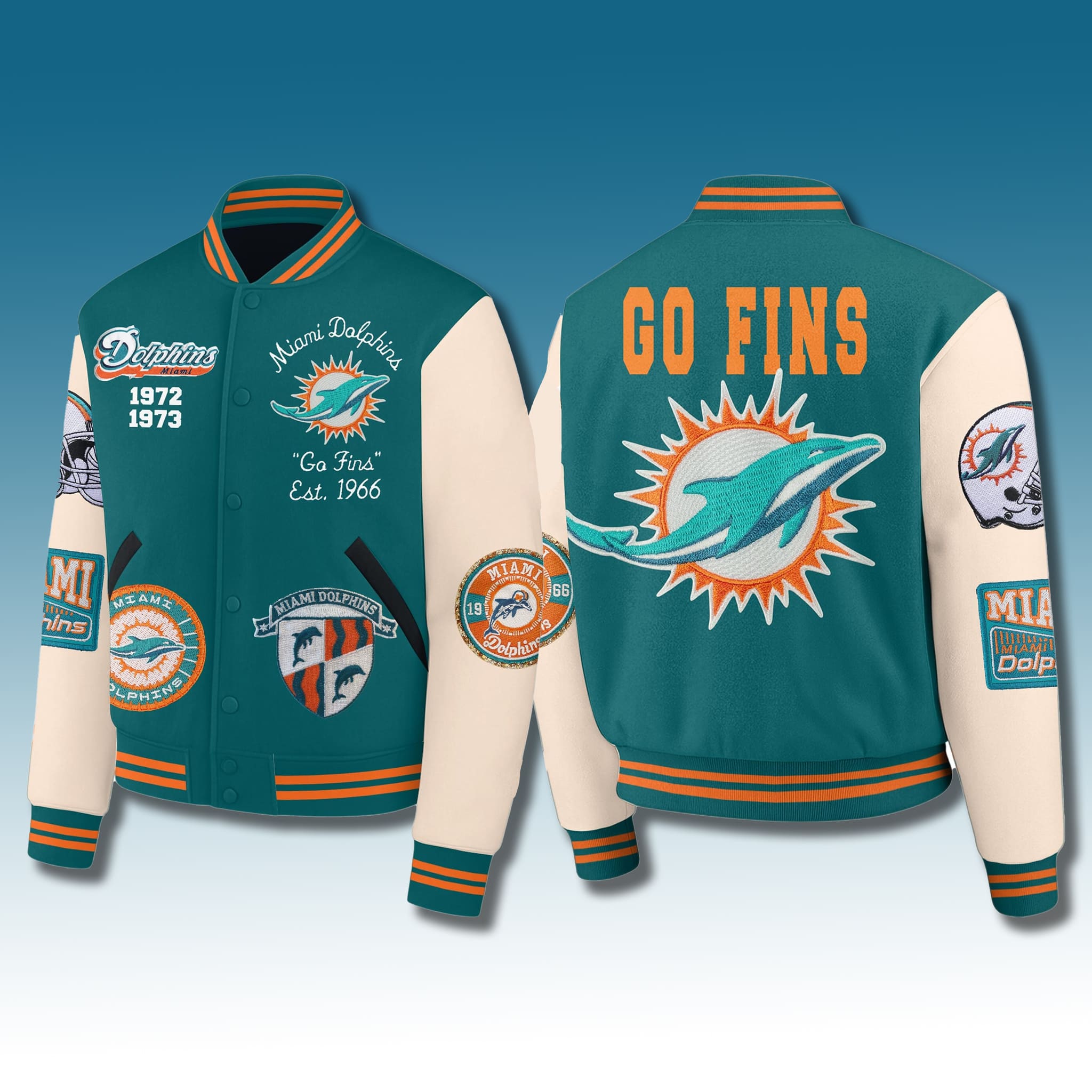 The Dolphins Go Fins EST 1966 Varsity Jacket 2025 is a unique and vibrant design, perfect for fans to show their loyalty to the Miami Dolphins. More than just a fashion item, this jacket is a lively statement of the team’s history since its founding in 1966, commemorating the glorious years of 1972 and 1973. With its signature bright color combination, it is an essential outfit to energize the cheering atmosphere in the 2025 season.
