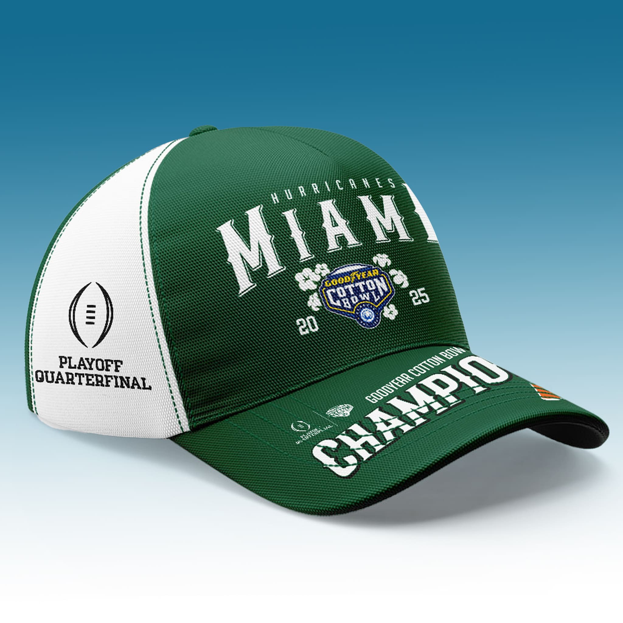 Miami Football 2025 Cotton Bowl Champions Hat is a baseball cap for Miami Hurricanes fans, commemorating the spectacular 24–14 victory over the defending national champions Ohio State Buckeyes in the College Football Playoff quarterfinal on December 31, 2025. This was one of the biggest upsets in CFP history, with Miami entering as the underdog but demonstrating superior strength to advance to the semifinals, marking the strong return of the University of Miami college football program.