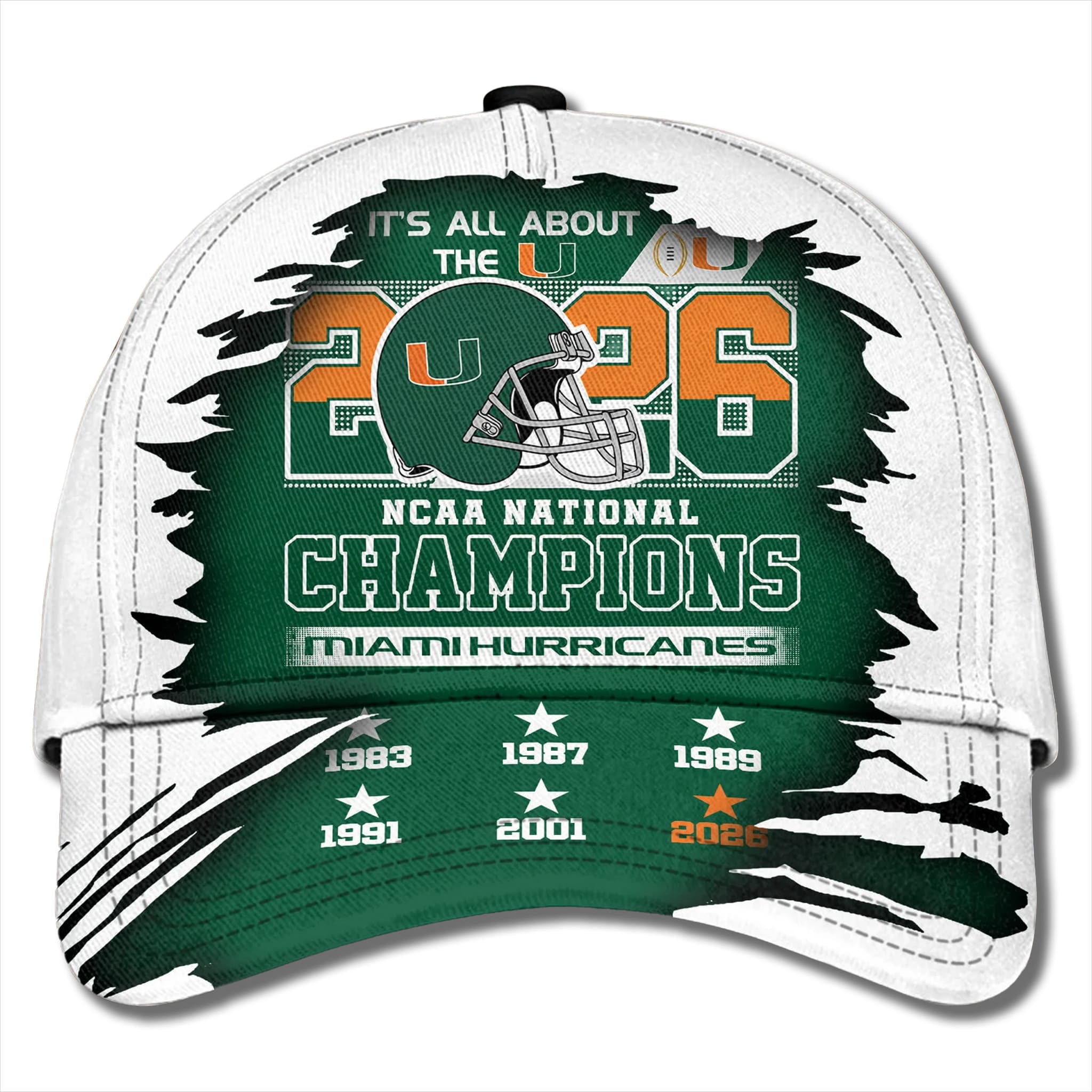 The Miami Hurricanes 6-Time National Champions Cap is a premium statement piece for true Hurricanes fans, created to celebrate a potential sixth NCAA National Championship should Miami defeat the Indiana Hoosiers in the CFP National Championship Game on January 19, 2026, at Hard Rock Stadium—right on home turf.