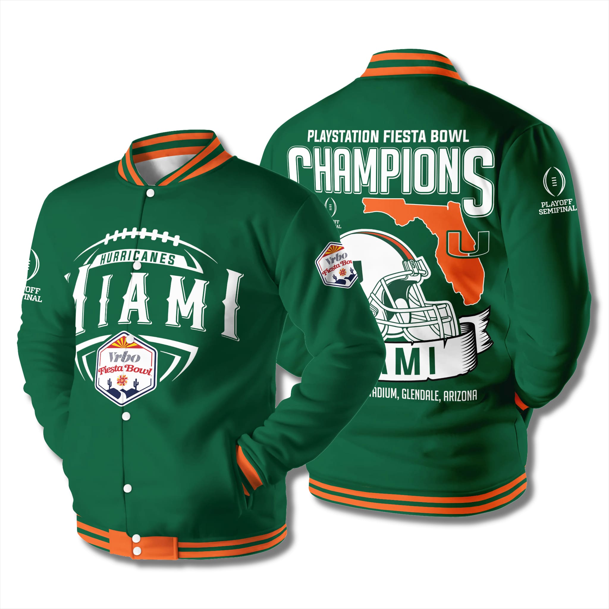 Miami Hurricanes Fiesta Bowl 2026 Champions Jacket is a varsity jacket commemorating the victory at the 2026 Fiesta Bowl, marking the first time in more than two decades that the Miami Hurricanes have advanced to the National Championship Game. This jacket design represents the powerful revival of “The U” and brings immeasurable pride to Hurricanes Nation: an emotional and resilient journey that has returned the legendary program to the pinnacle of college football and rekindled memories of its golden years.