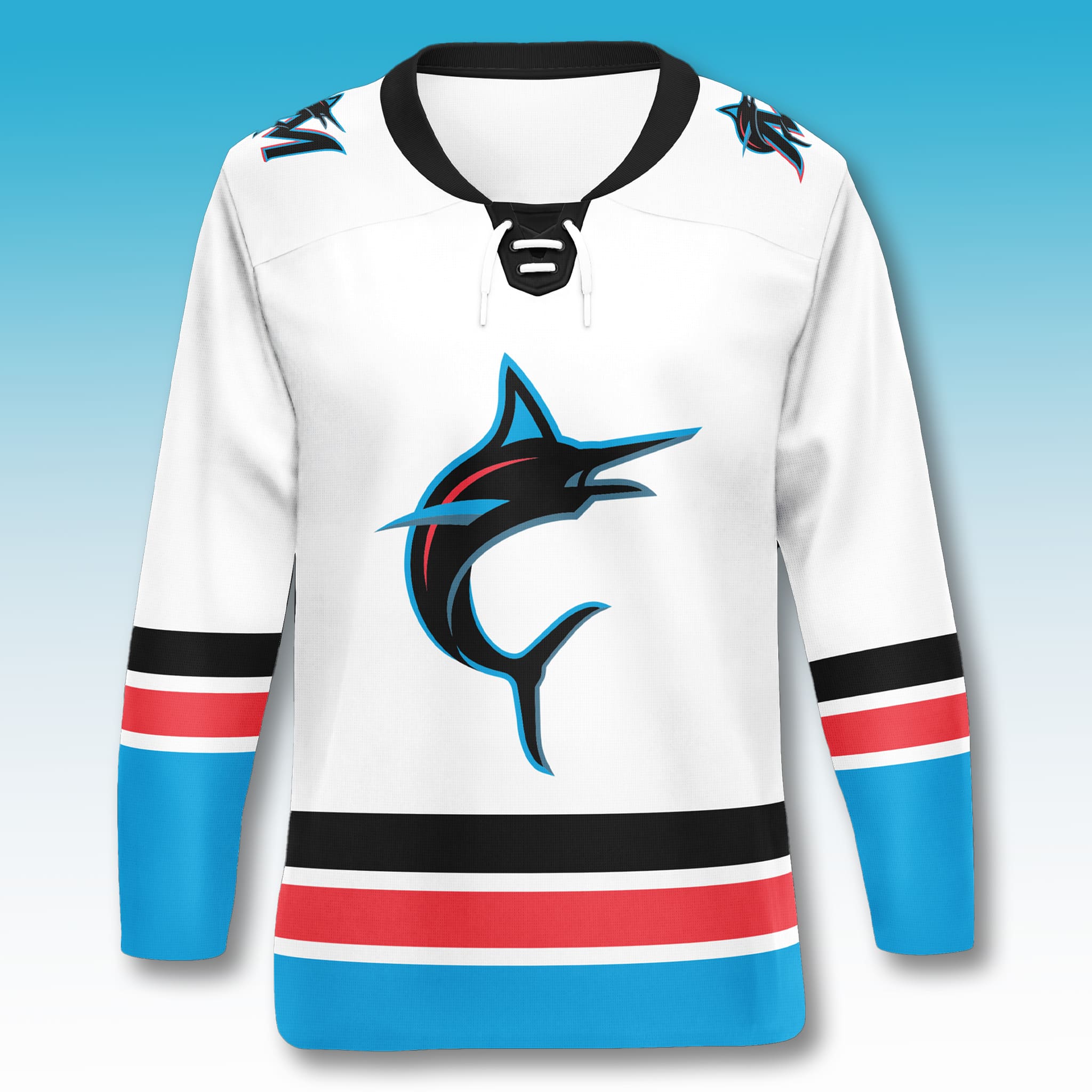 This limited-edition hockey jersey is available exclusively through a special ticket package. Inspired by the iconic Fightin’ Fish era, the jersey features a clean white base with bold black sleeve and collar striping. A large classic marlin logo sits proudly at the center chest, highlighted with striking teal and red accents that create a powerful yet retro aesthetic.