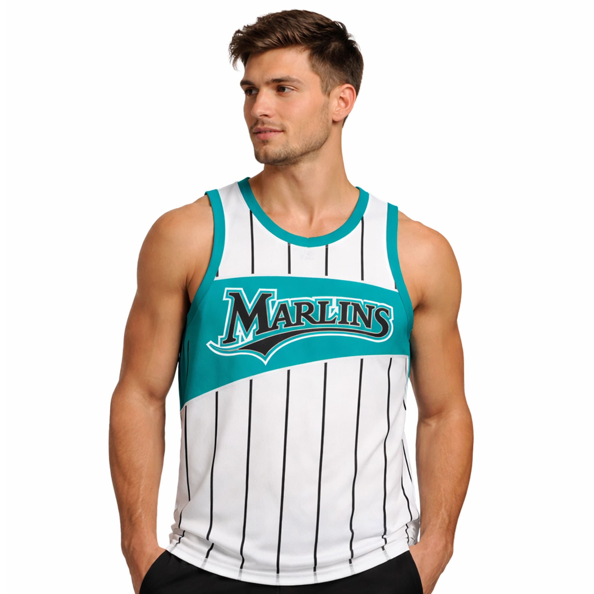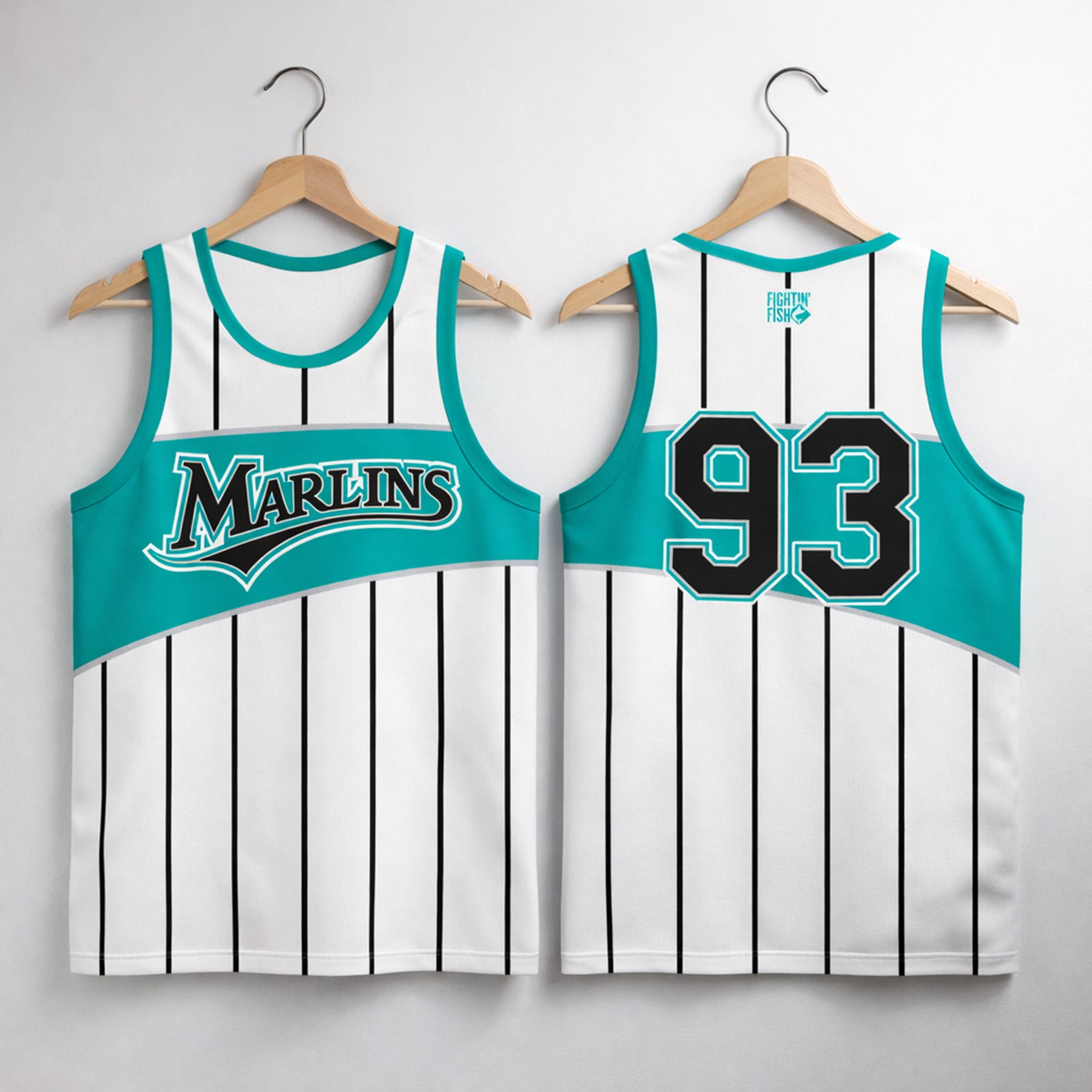 This jersey is styled as a vintage basketball version: a sleeveless tank top with a clean white base and thin black vertical pinstripes reminiscent of classic uniforms. If you cannot attend at loanDepot park, you can still own this unique crossover piece by purchasing it directly at iFrogtees in full size options and bring the Fightin’ Fish spirit, basketball throwback vibe, and Marlins pride wherever you go.