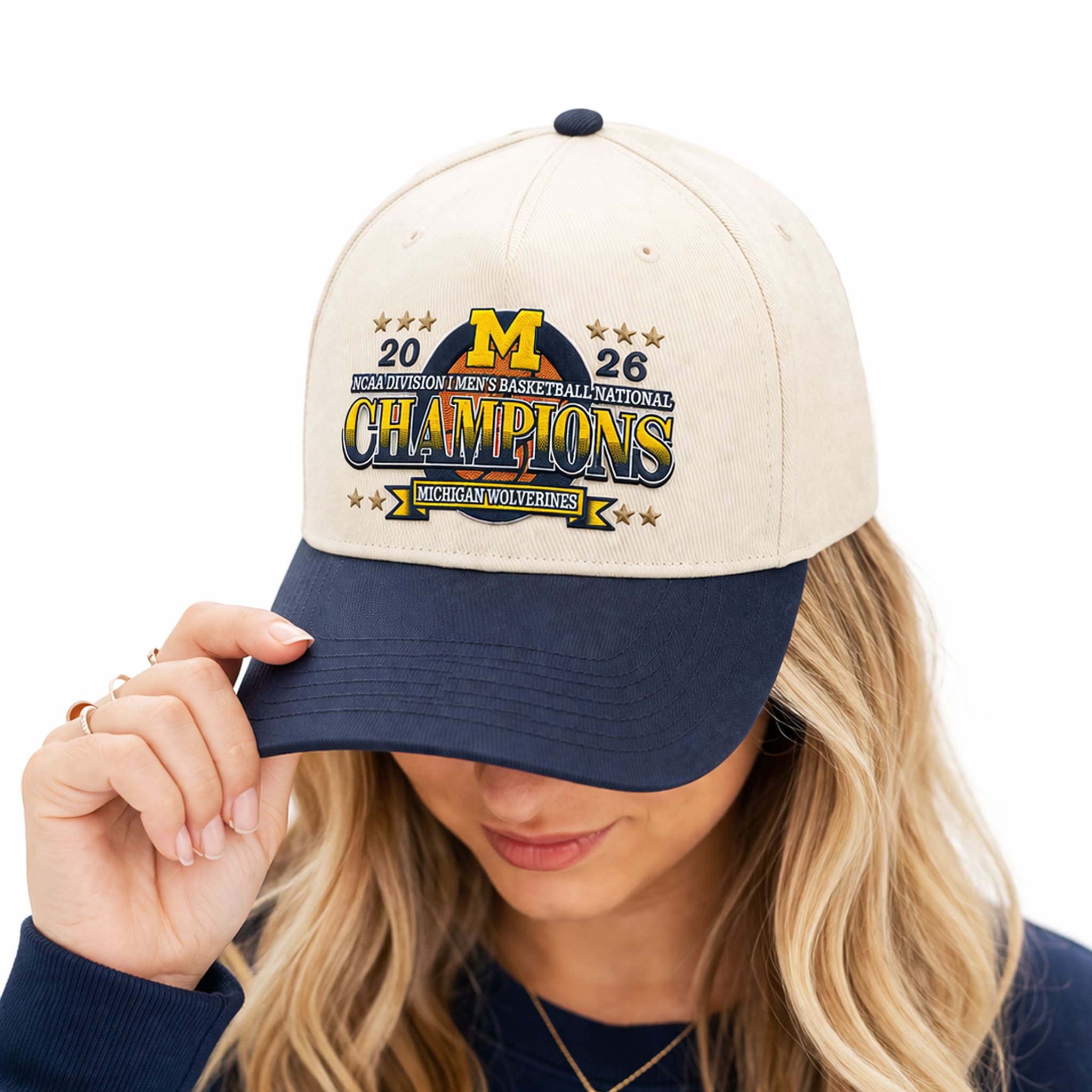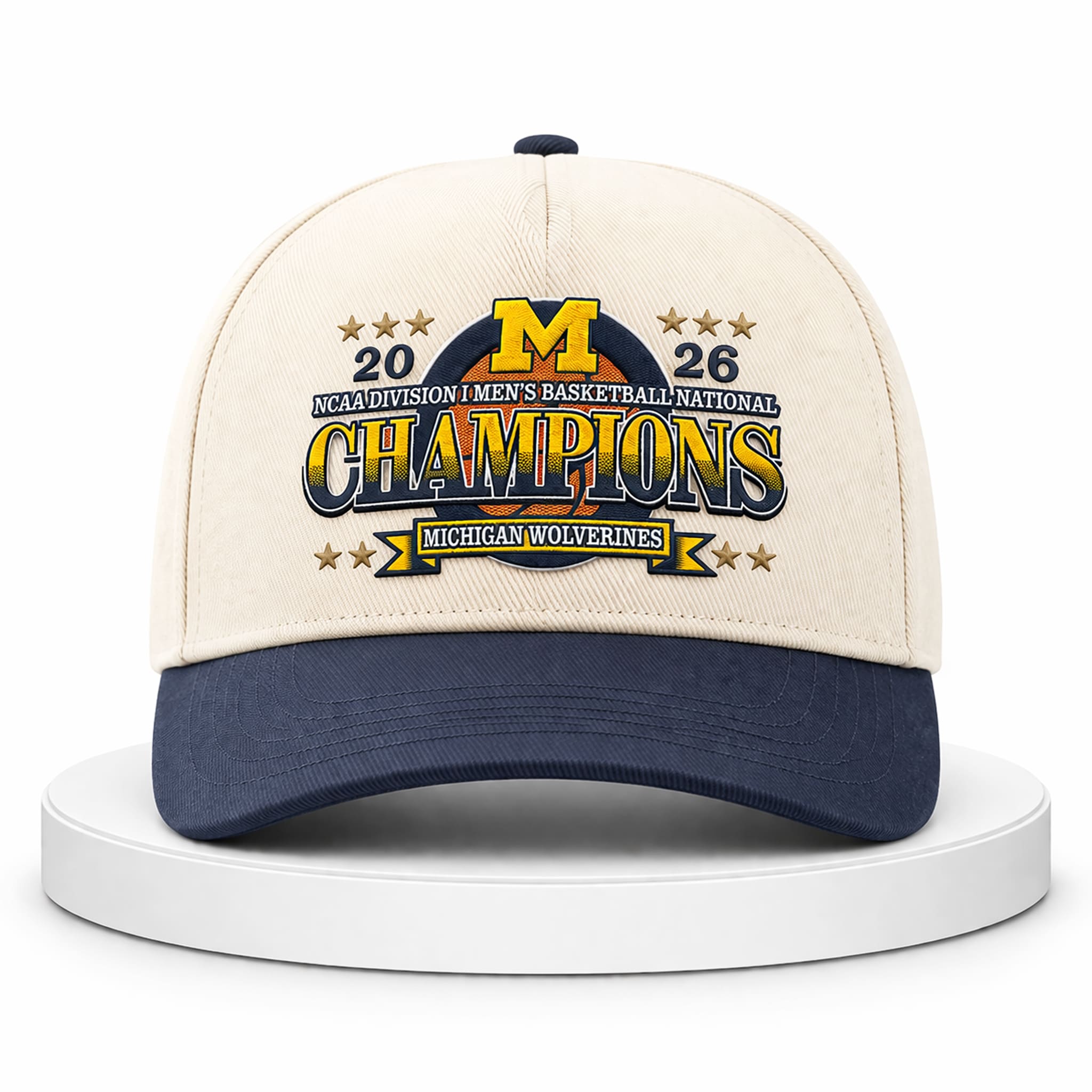 This 2026 Michigan National Champs Hat features a refined and classic color combination: a clean cream crown paired with a deep navy bill. At the center is a premium 3D embroidered design, showcasing the iconic “M” logo placed proudly behind the bold “CHAMPIONS” lettering. The number “2026” and symmetrical five-pointed stars are stitched on both sides, symbolizing the brilliance and prestige of a national championship victory.