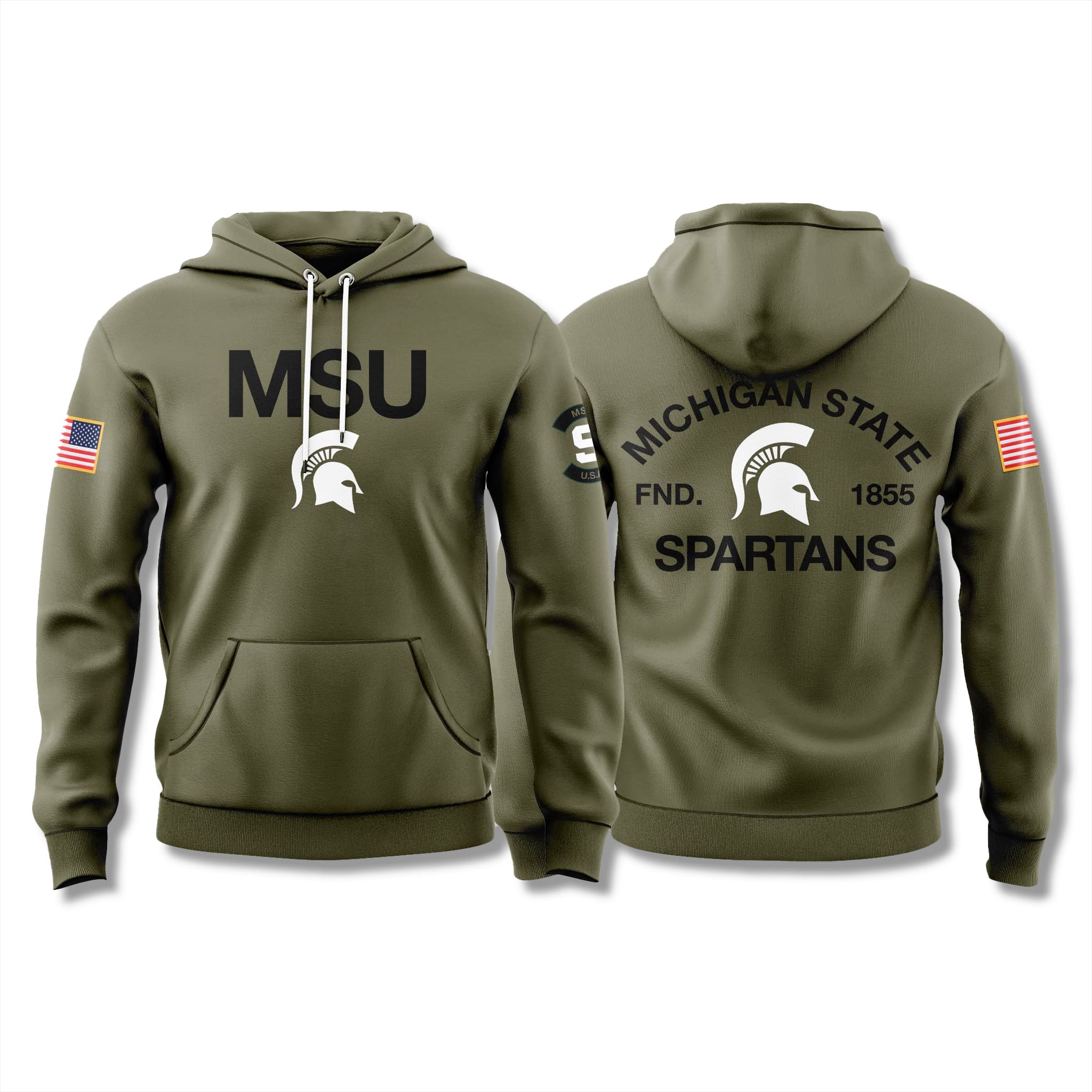 The Michigan State Spartans Military Appreciation Hoodie 2025 is an item for the 2025 season, specially designed to honor U.S. Armed Forces members and the veteran community. Released to celebrate MSU’s long history (founded in 1855 as America’s first agricultural college), this hoodie blends athletic heritage with patriotic values, allowing fans to show support and spread the message of military appreciation through activities such as special games featuring patriotic helmets.