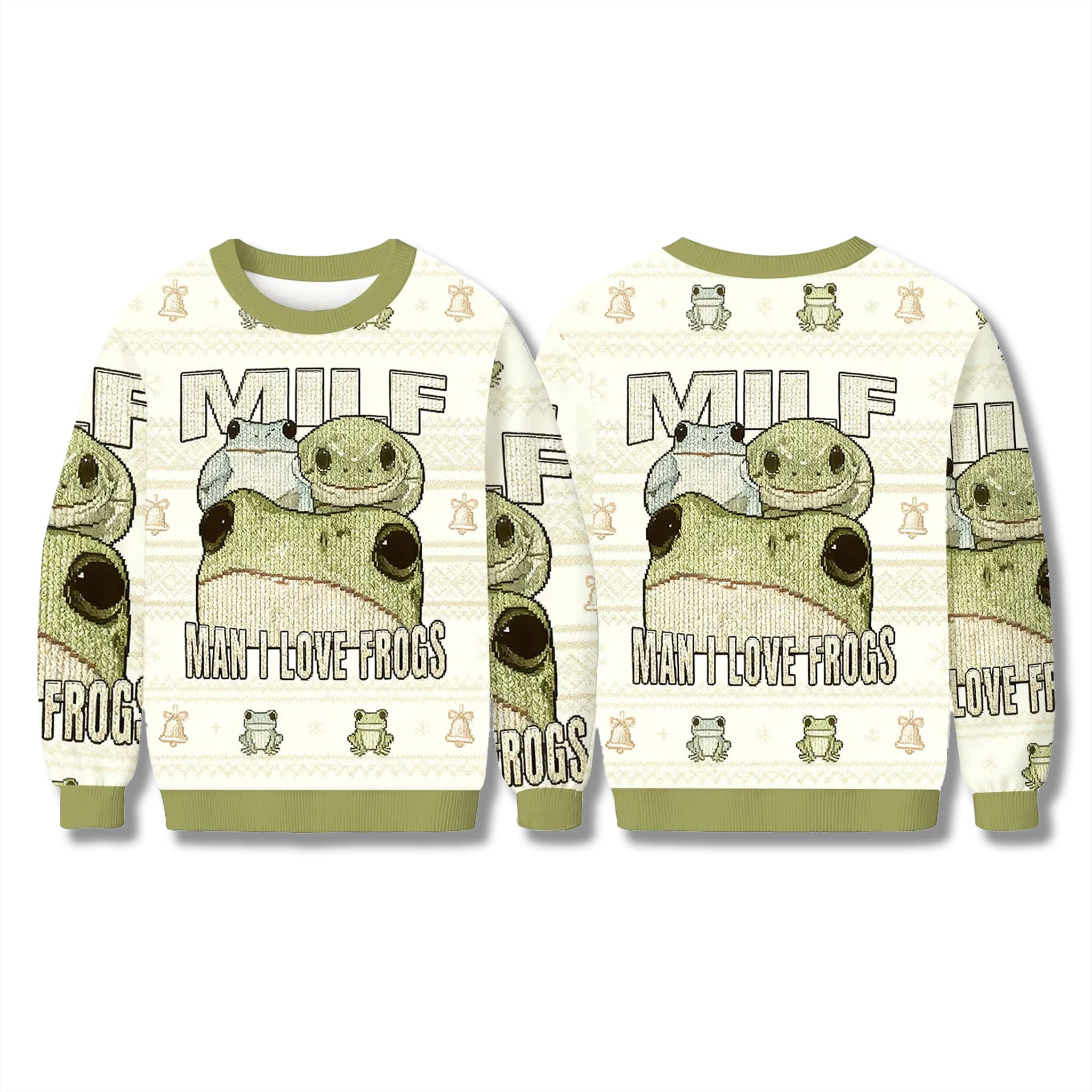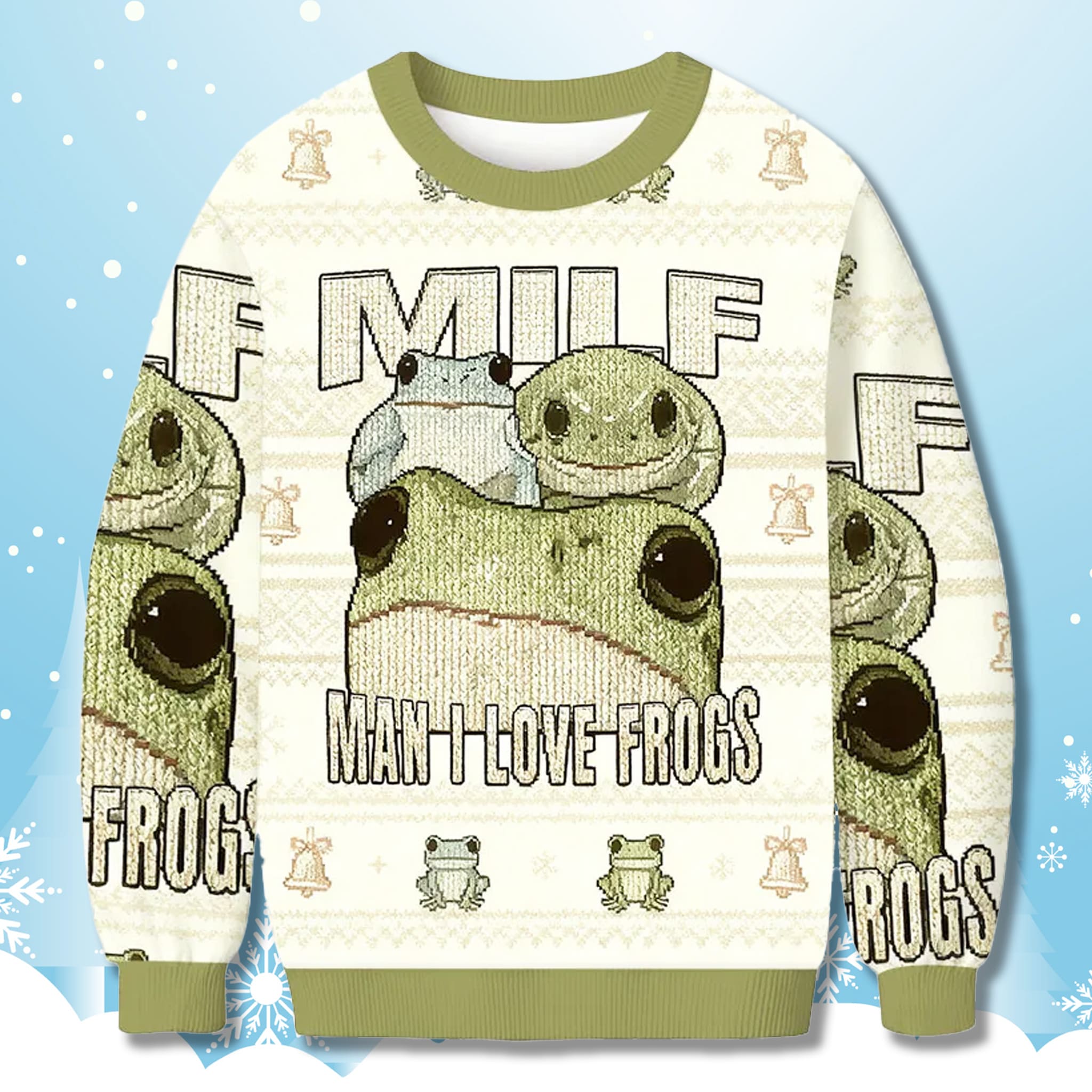 A towering frog pyramid dominates the chest, each amphibian grinning like it knows your search history, framed by massive cracked-letter “MILF” above and “MAN I LOVE FROGS” below. Sleeves swarm with rogue frogs mid-jump, plus scattered golden bells and tiny lily-pad snowflakes for certified ugly-sweater madness.
