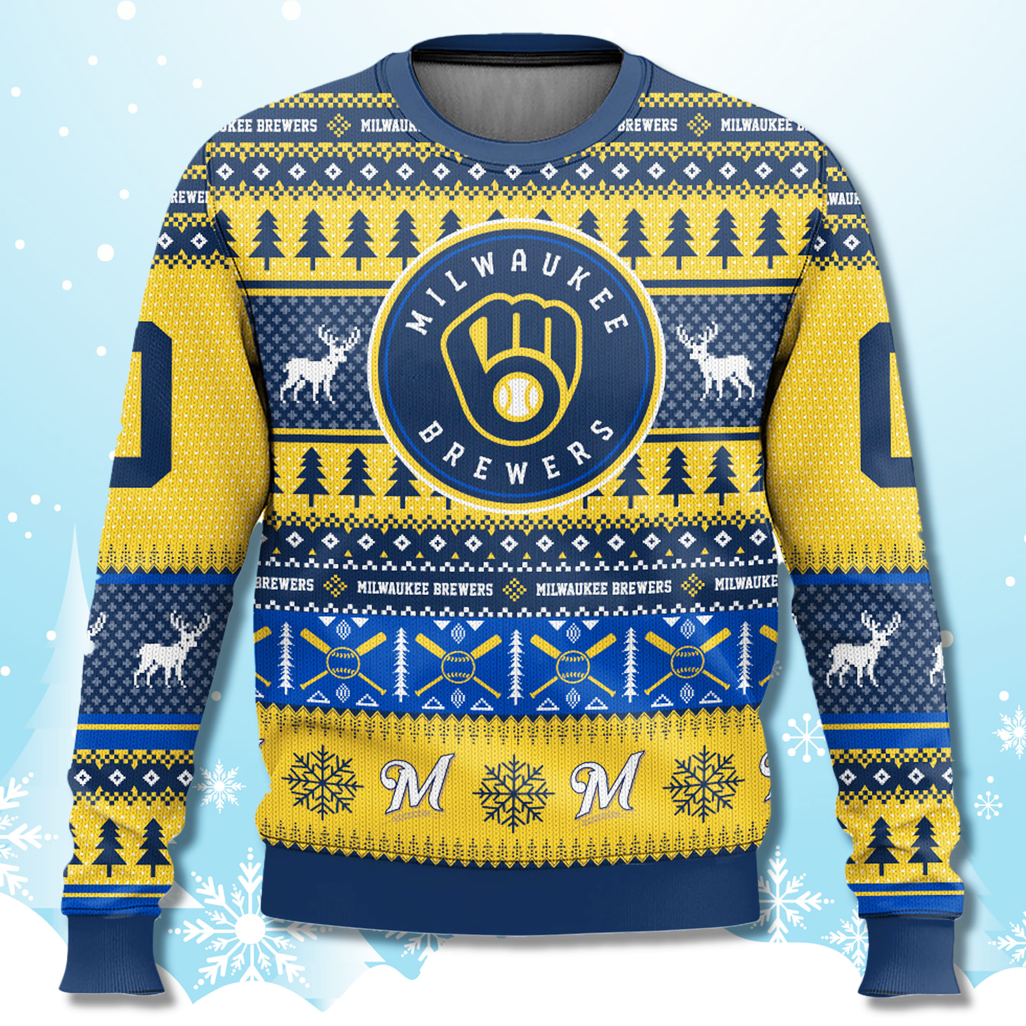 The standout design features the bold Milwaukee Brewers primary logo front and center, flanked by repeating “Milwaukee Brewers” text and sleeve numbers for a custom jersey feel. Festive patterns include Christmas trees, leaping reindeer, crossed bats with baseballs, snowflakes, and scripted “M” motifs woven throughout for that classic ugly sweater flair.