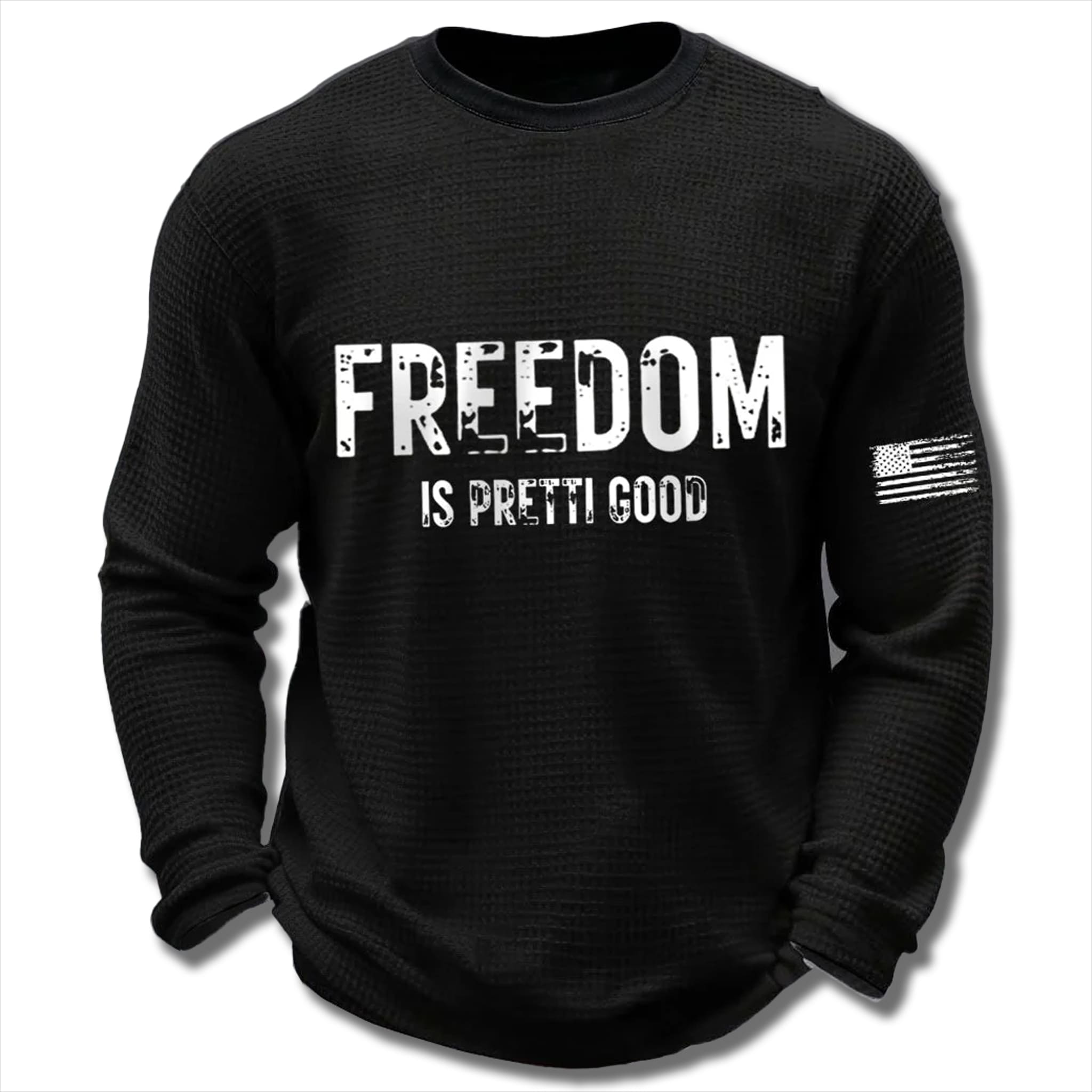 The sweater features a neutral black tone on distinctive waffle-knit fabric, creating depth and a strong, confident look. The main highlight is the white distressed-style slogan printed on the front, paired with a small flag symbol on the left sleeve – adding a subtle vintage touch and a sense of pride.
