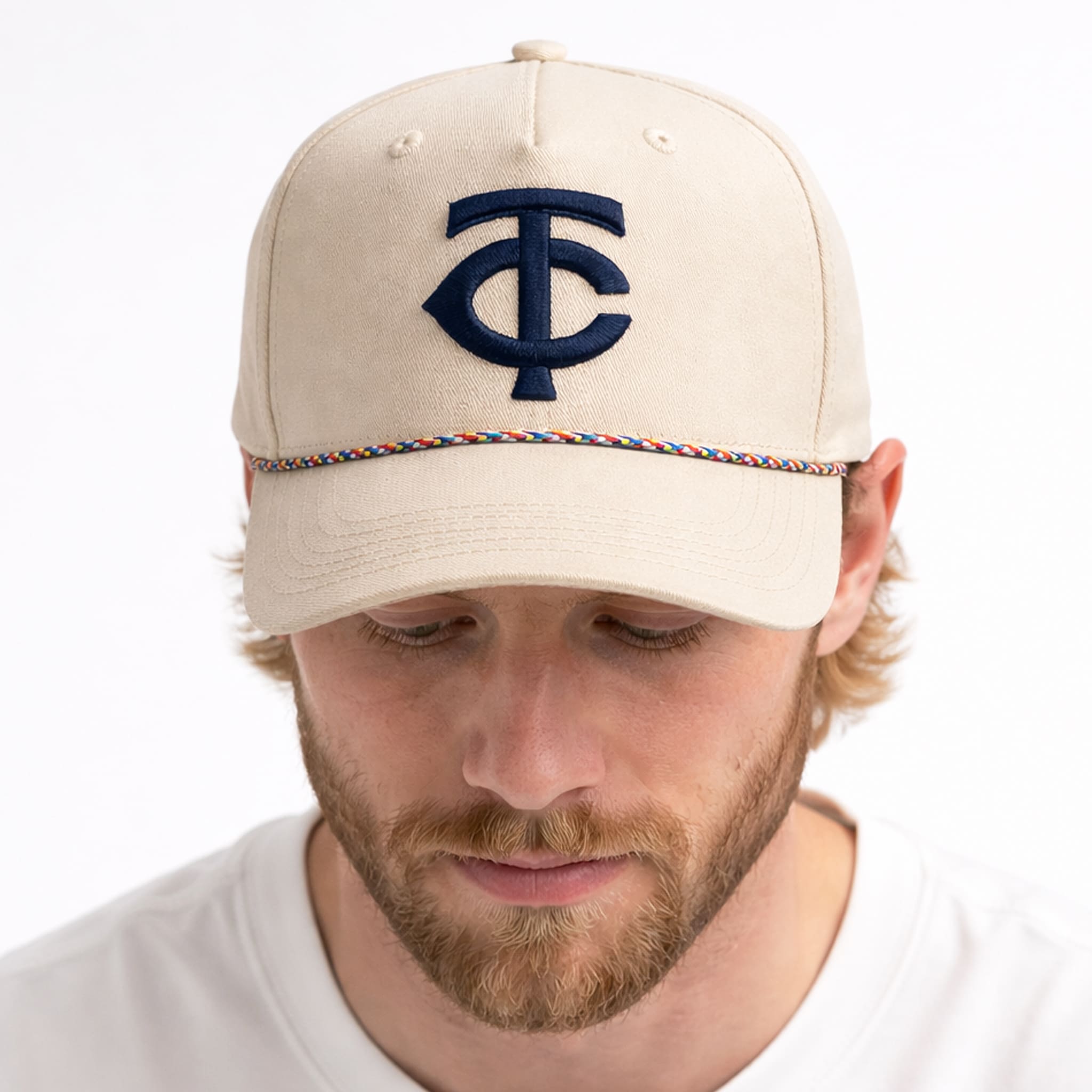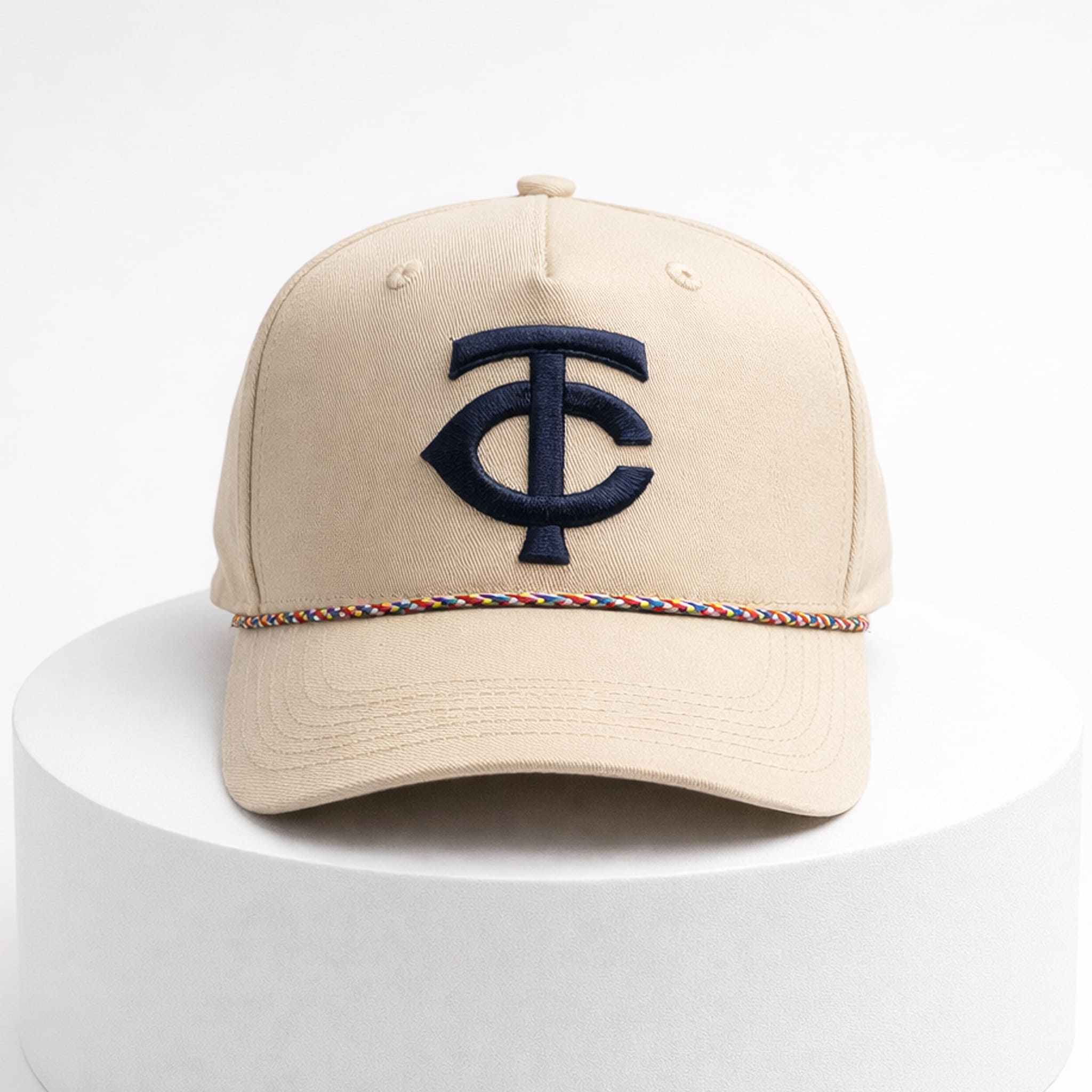 This hat features a warm and elegant light beige base, highlighted by a large embroidered navy “TC” logo on the front. A standout detail is the multicolor rope across the brim – representing all types of cancer and shared hope within the community. On the side, a vibrant multicolor awareness ribbon adds a meaningful touch. This is more than just a baseball cap; it’s a powerful symbol of resilience, gratitude, and Twins Nation spirit – Where every rope and ribbon tells a story of hope and victory.