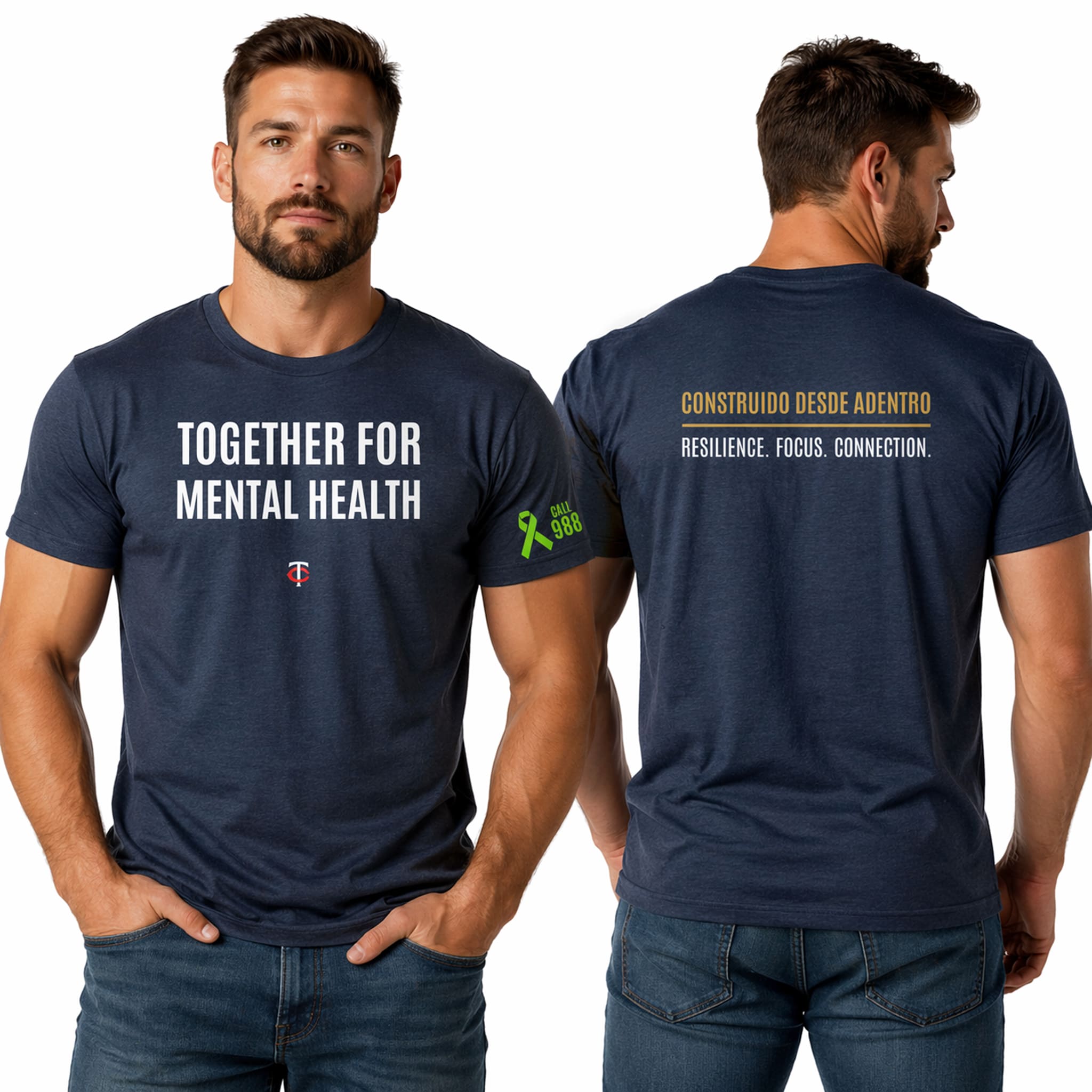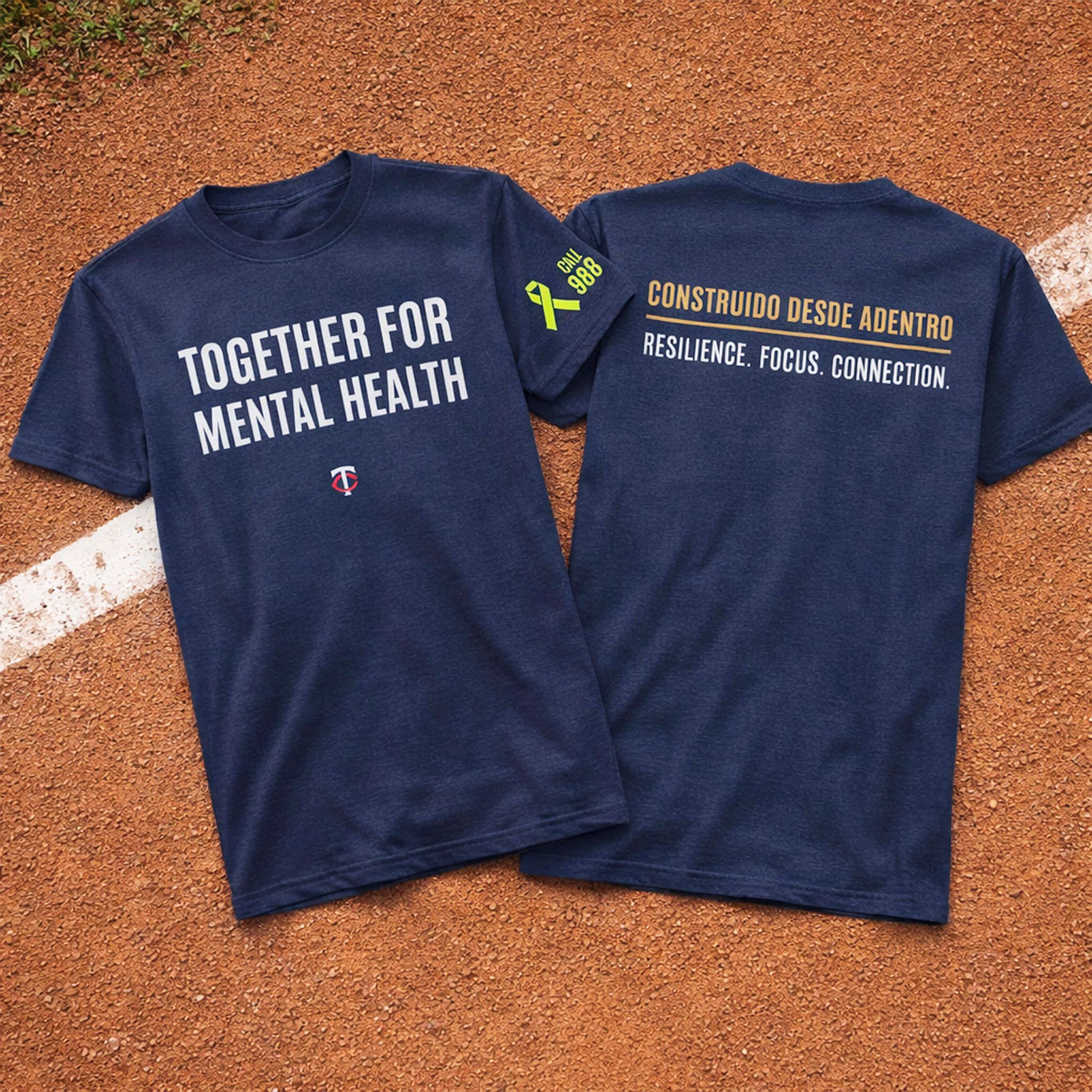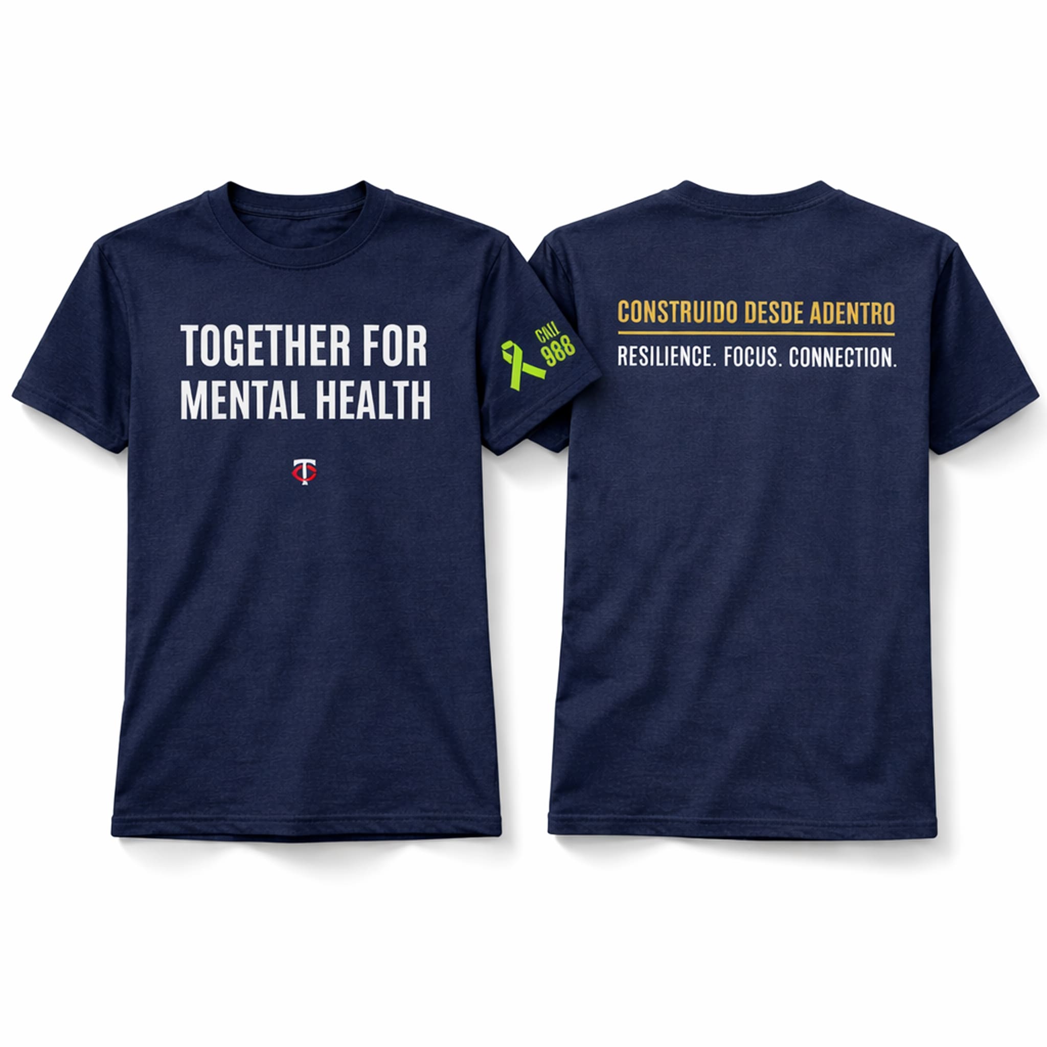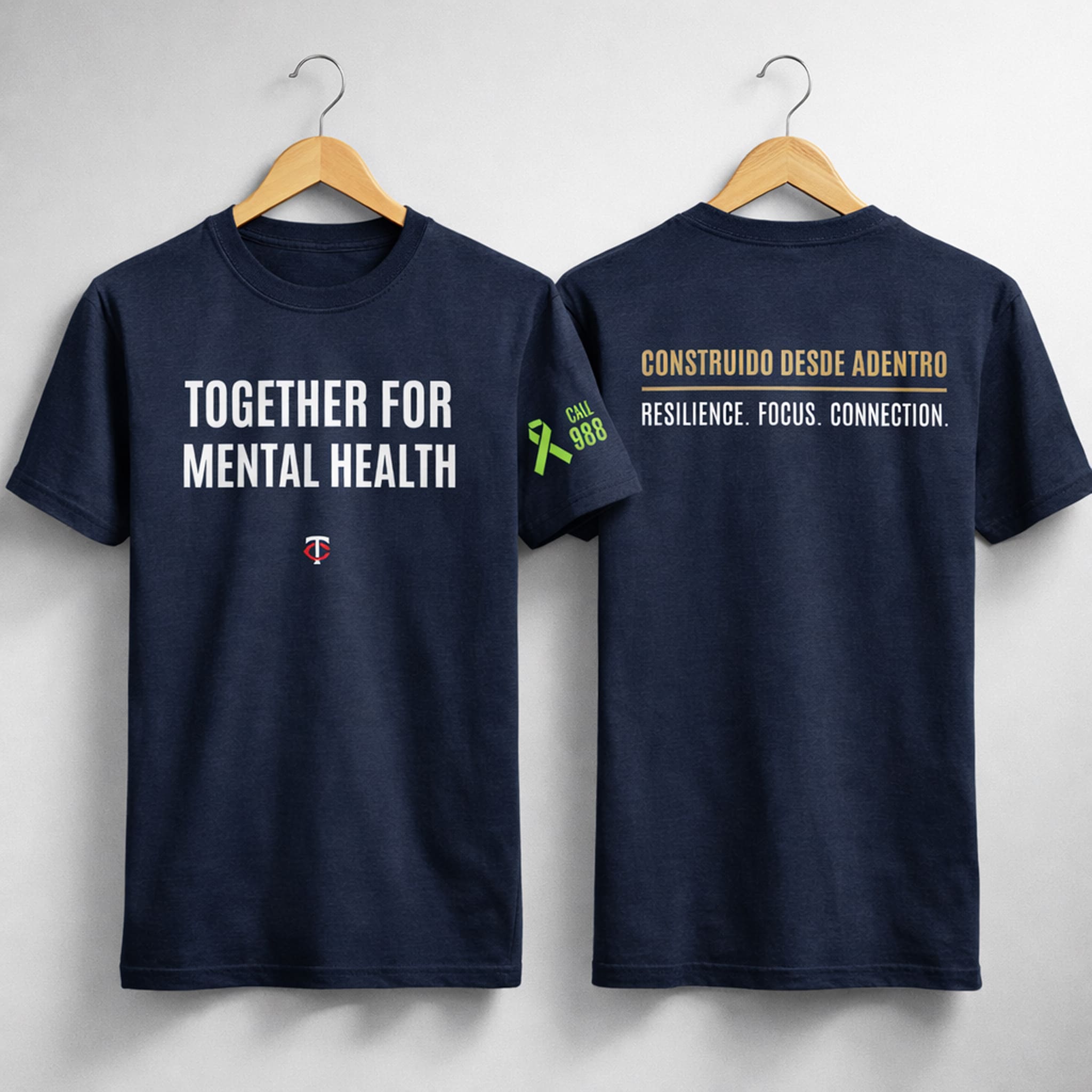 The T-shirt features a strong navy design: On the front, it highlights the phrase “TOGETHER FOR MENTAL HEALTH” alongside the Twins’ “TC” logo. The sleeve includes a green ribbon symbol with the message “CALL 988.” On the back, it displays the phrase “CONSTRUIDO DESDE ADENTRO” (“Built from within”) along with the inspiring message “RESILIENCE. FOCUS. CONNECTION.” – representing strength, focus, and unity.