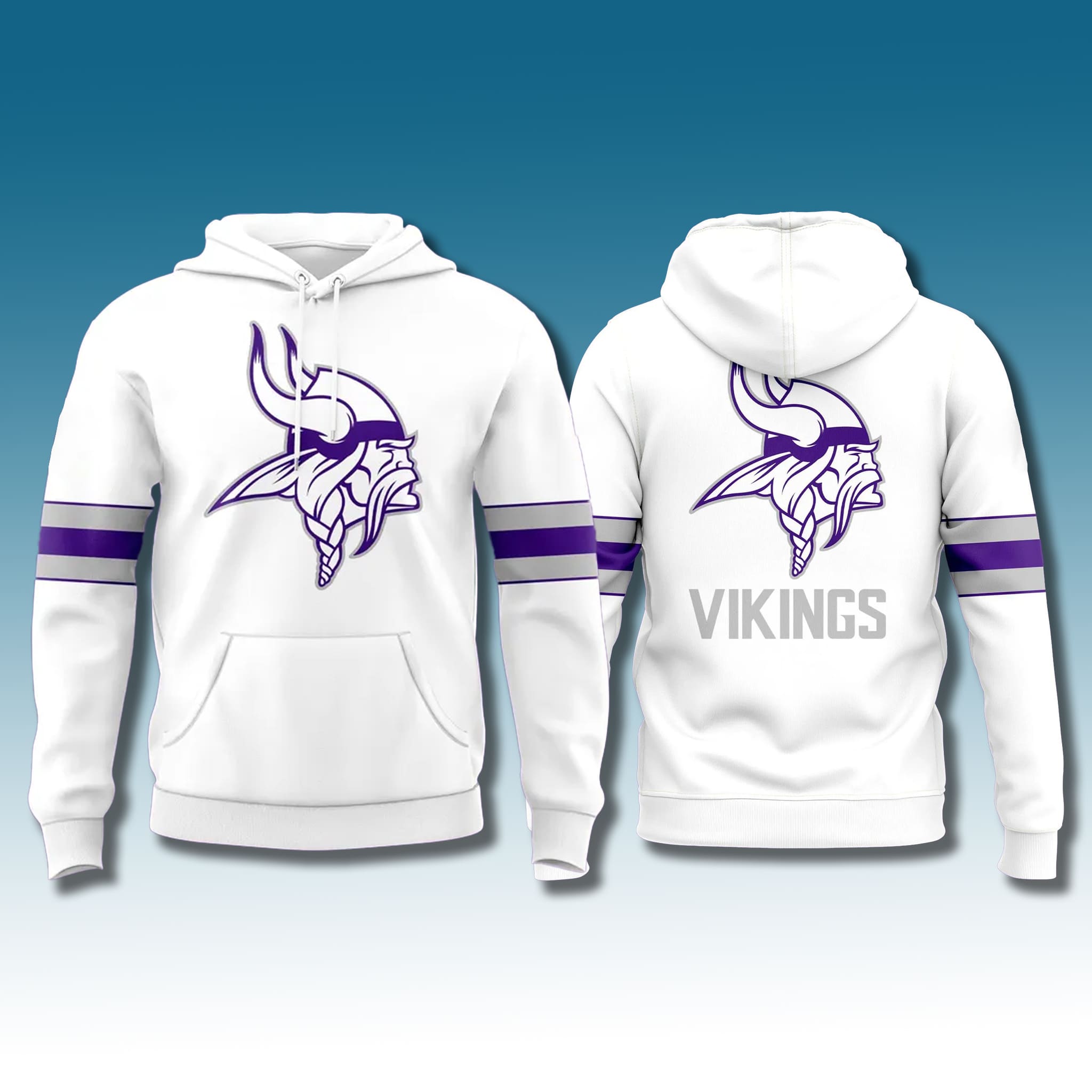 This hoodie features a luxurious design on a pure white base, easy to style for winter wear. Large purple Viking Horn logos stand out on the front and back, with purple–dark gray sleeve trim in a strong varsity style, creating a modern, powerful look full of Skol energy. The hoodie is currently sold at iFrogtees with multiple sizes and styles for you to choose your own look and cheer.