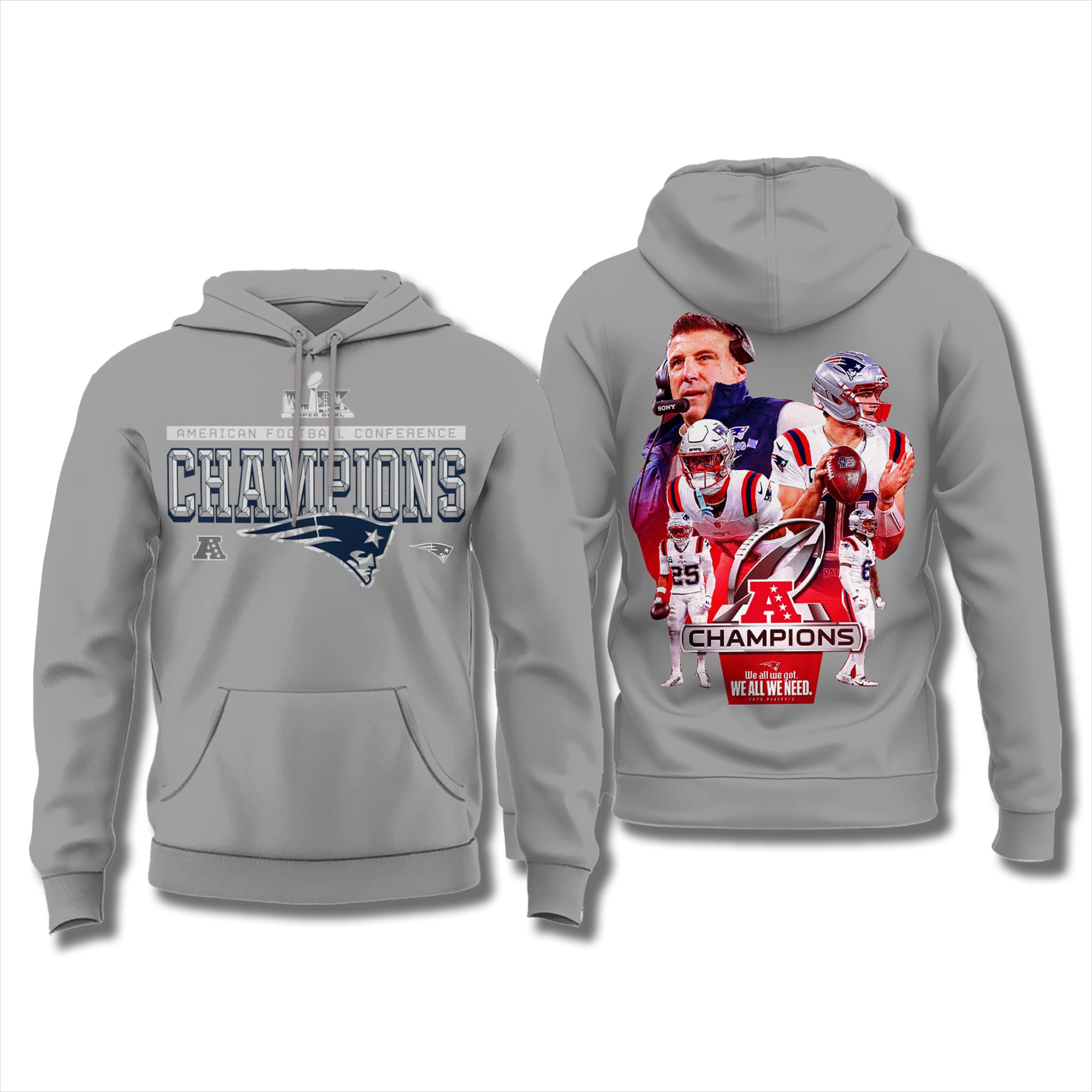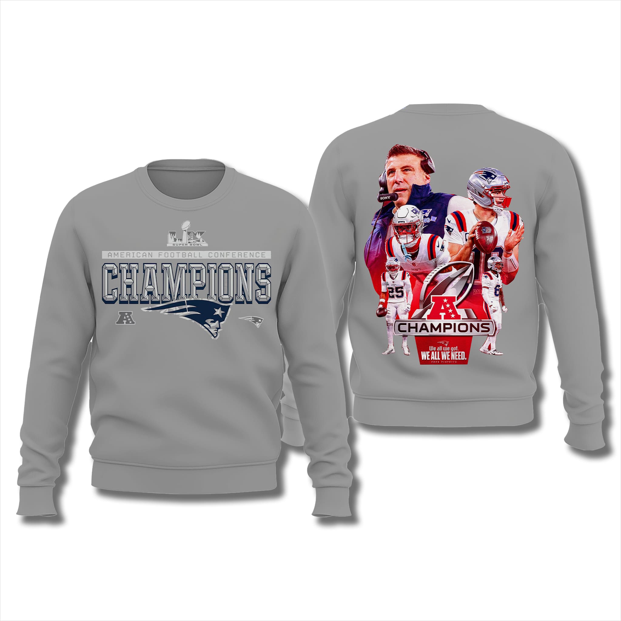 This locker-room–style design worn by players during the celebration is now featured on this modern neutral gray shirt, highlighted by a sharp metallic “CHAMPIONS” wordmark on the front, combined with the AFC logo and Patriots emblem. The back showcases a striking graphic of the head coach, quarterback, and key players, delivering a powerful athletic look that is easy to pair with casual outfits.