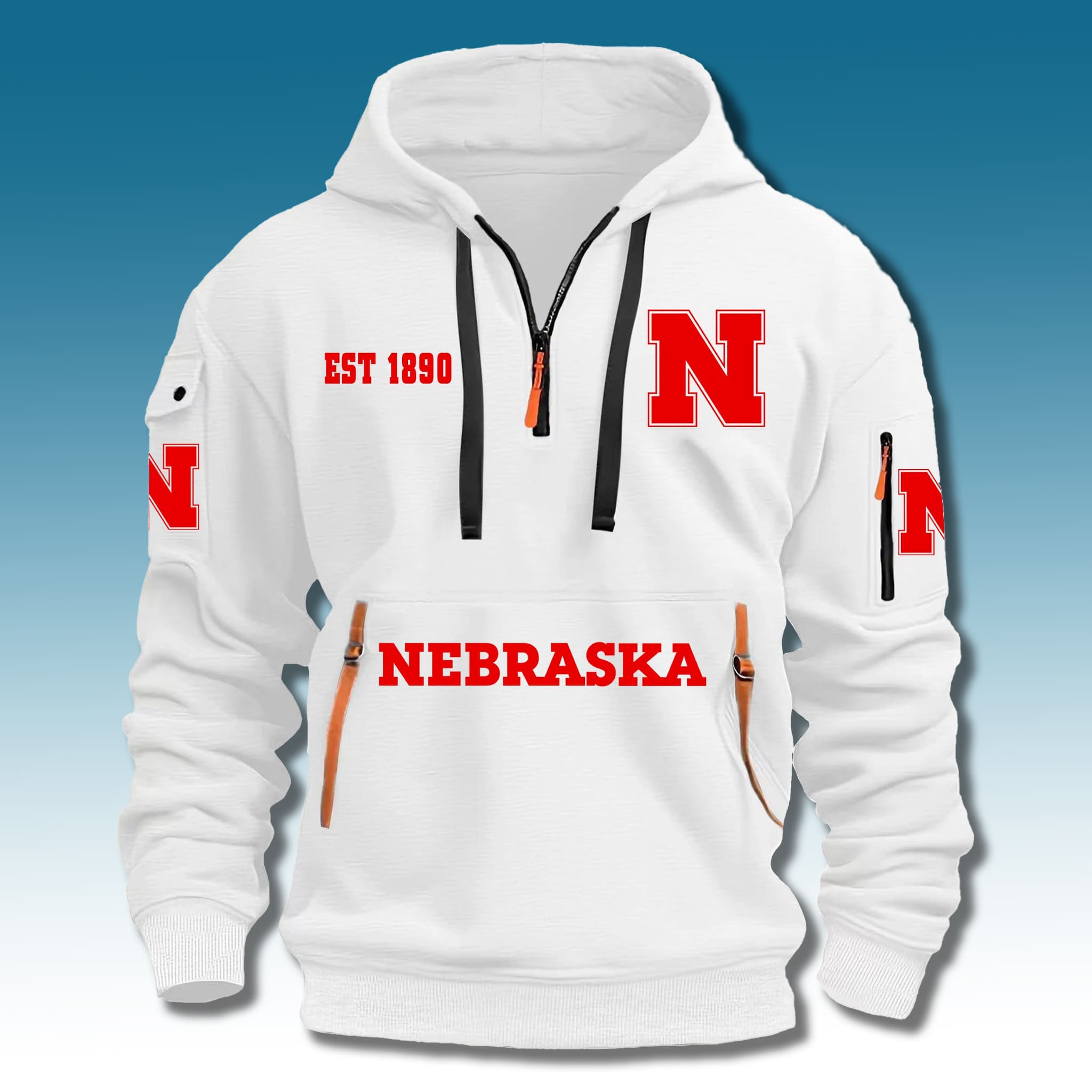 This hoodie is designed on an elegant White/Cream base, highlighting the team’s characteristic Red details. The design utilizes a practical Quarter Zip style (1/4 zipper), prominently featuring a large “N” and bold “NEBRASKA” lettering. The combination of dynamic cargo pockets and personalized zipper details gives a youthful, strong appearance, recreating the unyielding spirit of the strong farmers (Husker) that the team represents.