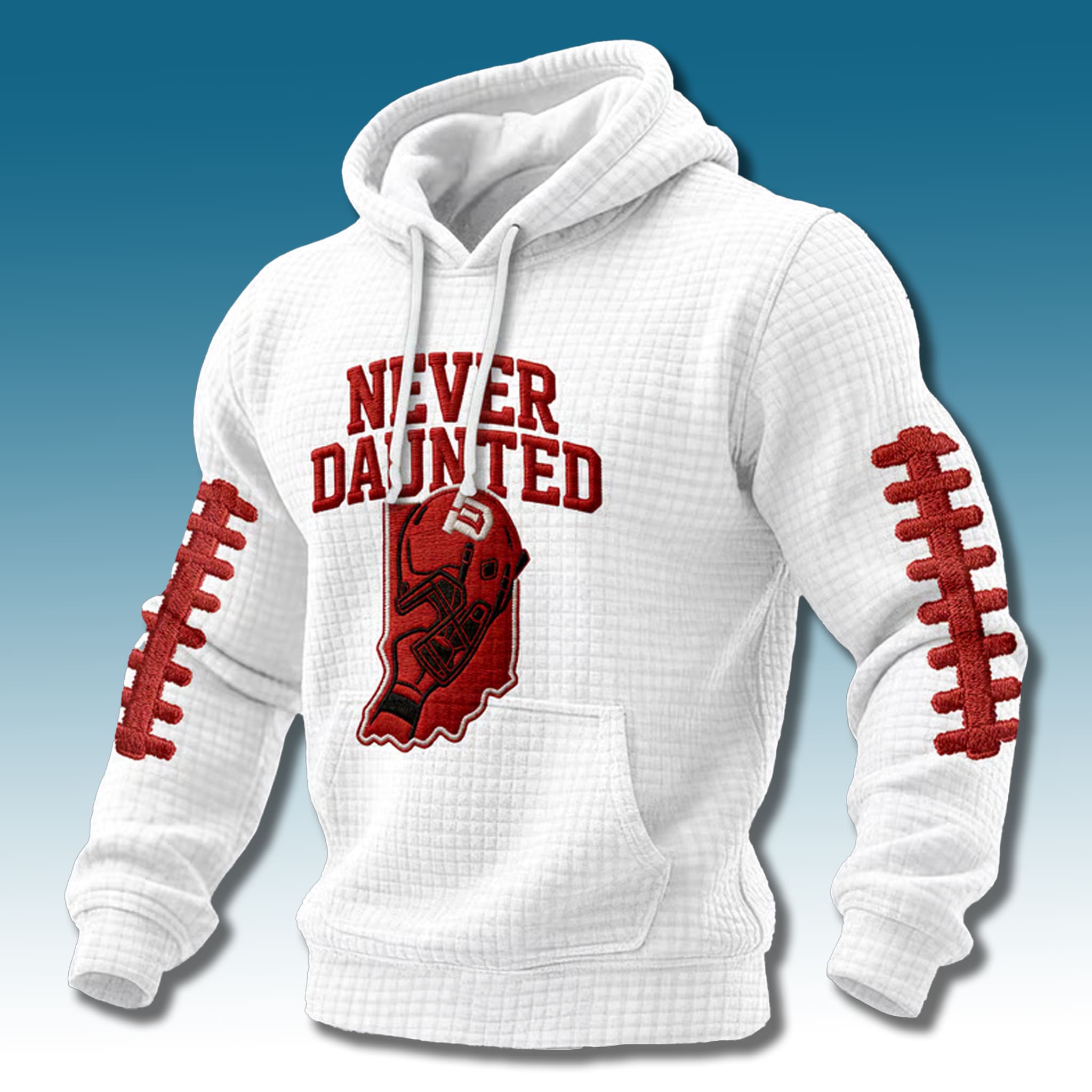 The Never Daunted IU Football Waffle Hoodie is a premium waffle-textured hoodie made for true Indiana Hoosiers fans. Inspired by the iconic phrase “Never Daunted” from the fight song “Indiana, Our Indiana” — “Never daunted, we cannot falter, in the battle, we’re tried and true!” – this slogan has evolved into the hashtag #NeverDaunted, representing the fearless, resilient identity of IU Football. It became especially meaningful during Indiana’s historic 2025 season, marked by an undefeated run, a Rose Bowl championship, and a deep College Football Playoff journey.