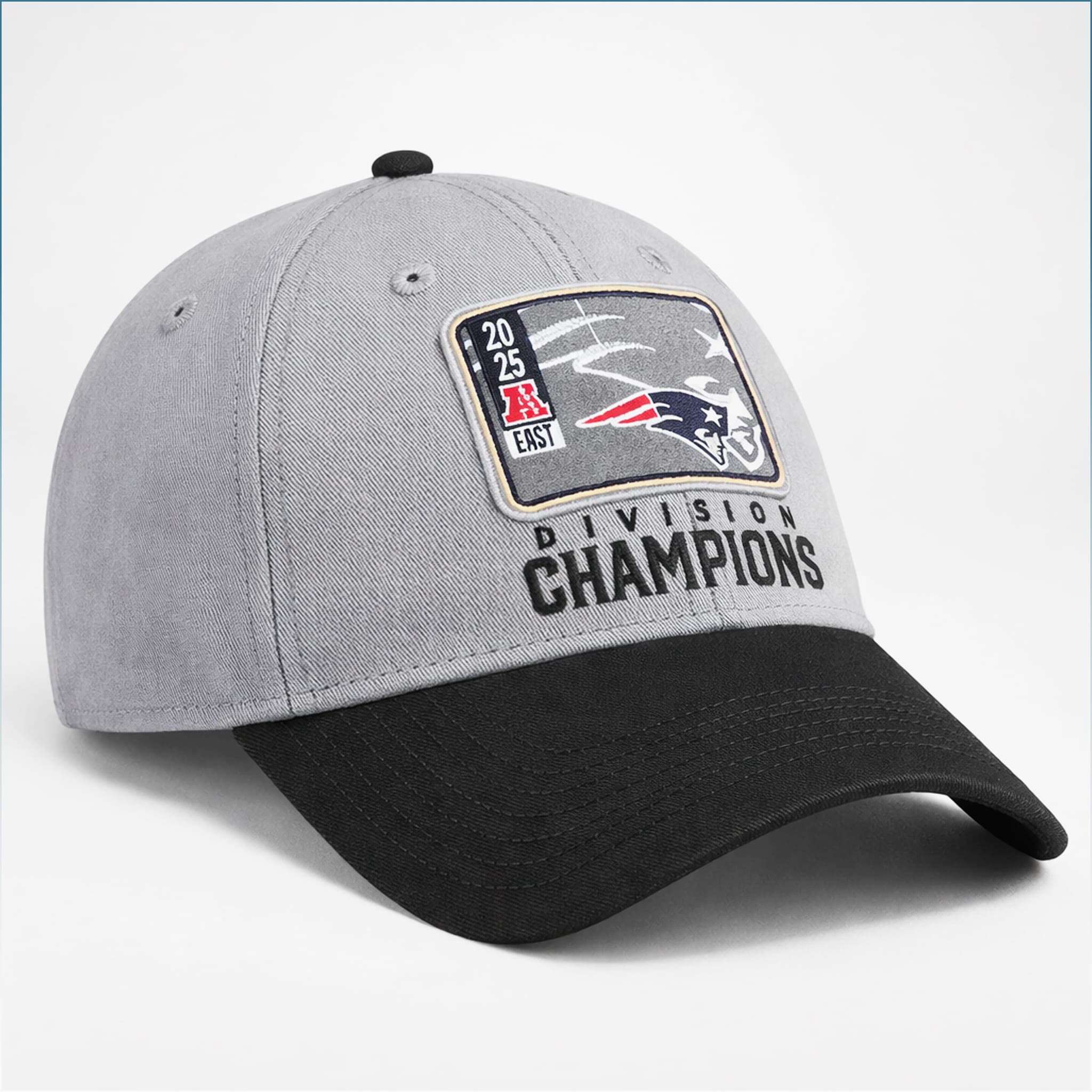 This hat features a classic baseball cap design with a dominant gray tone combined with black trim, creating a modern look that is easy to style. A prominent embroidered patch on the front highlights the team logo along with the text “2025 AFC East Division Champions,” delivering a professional sports style. All details on the hat are sharply and finely embroidered.